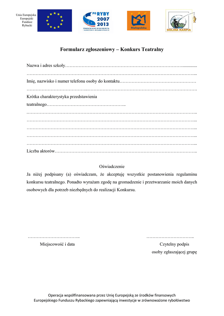 Unia Europejska Europejski Fundusz Rybacki Formularz zgłoszeniowy – Konkurs Teatralny Nazwa i adres szkoły……………………………………………………………………............. …………………………………………………………………………………………………... Imię, nazwisko i numer telefonu osoby do kontaktu…………………………………………… …………………………………..………………………………………………………………. Krótka charakterystyka przedstawienia teatralnego…………………………………………….. .………………………………………………………………………………………………….. …………………………………………………………………………………………………... …………………………………………………………………………………………………... …………………………………………………………………………………………………... …………………………………………………………………………………………………... Liczba aktorów………………………………………………………………………………….. Oświadczenie Ja niżej podpisany (a) oświadczam, że akceptuję wszystkie postanowienia regulaminu konkursu teatralnego. Ponadto wyrażam zgodę na gromadzenie i przetwarzanie moich danych osobowych dla potrzeb niezbędnych do realizacji Konkursu. …………………………….. Miejscowość i data ………………………….. Czytelny podpis osoby zgłaszającej grupę Operacja współfinansowana przez Unię Europejską ze środków finansowych Europejskiego Funduszu Rybackiego zapewniającą inwestycje w zrównoważone rybołówstwo