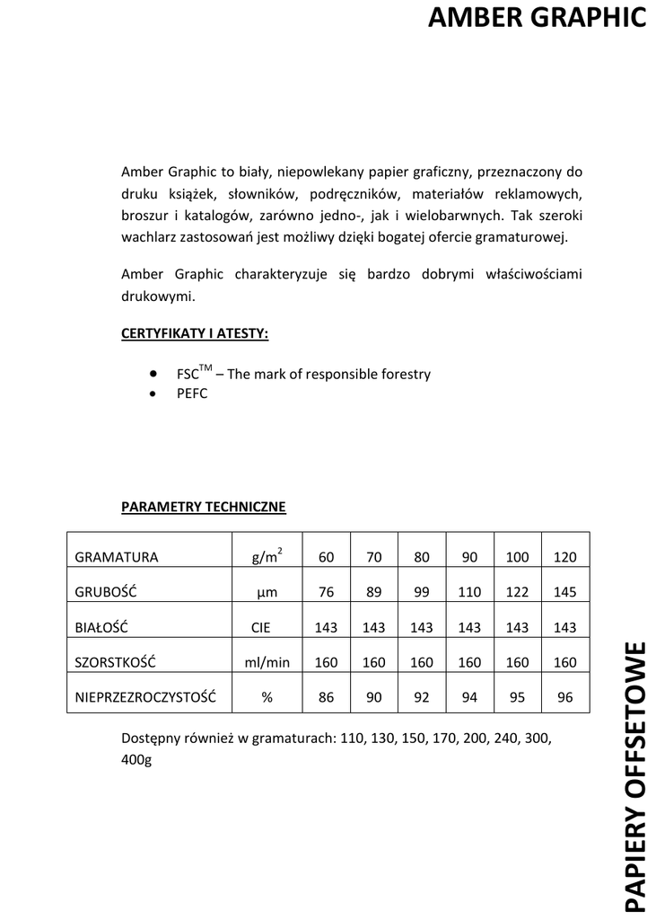 AMBER GRAPHIC Amber Graphic to biały, niepowlekany papier graficzny, przeznaczony do druku książek, słowników, podręczników, materiałów reklamowych, broszur i katalogów, zarówno jedno-, jak i wielobarwnych. Tak szeroki wachlarz zastosowań jest możliwy dzięki bogatej ofercie gramaturowej. Amber Graphic charakteryzuje się bardzo dobrymi właściwościami drukowymi. CERTYFIKATY I ATESTY: TM FSC – The mark of responsible forestry PEFC GRAMATURA GRUBOŚĆ BIAŁOŚĆ SZORSTKOŚĆ NIEPRZEZROCZYSTOŚĆ 2 g/m 60 70 80 90 100 120 µm 76 89 99 110 122 145 143 143 143 143 143 143 ml/min 160 160 160 160 160 160 % 86 90 92 94 95 96 CIE Dostępny również w gramaturach: 110, 130, 150, 170, 200, 240, 300, 400g PAPIERY OFFSETOWE PARAMETRY TECHNICZNE