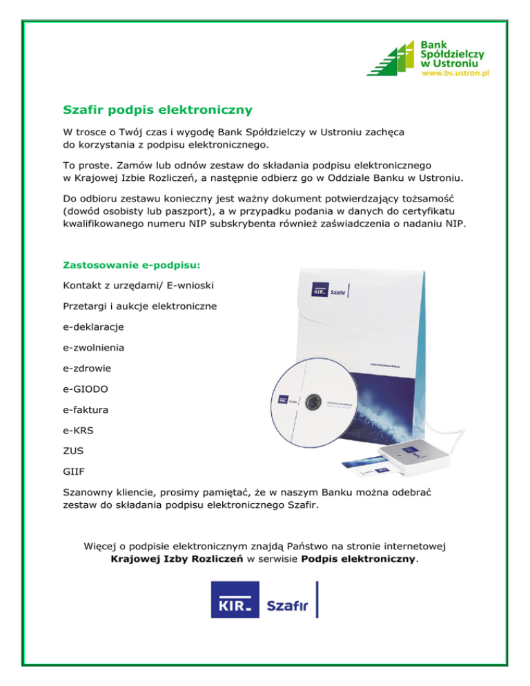 Szafir podpis elektroniczny W trosce o Twój czas i wygodę Bank Spółdzielczy w Ustroniu zachęca do korzystania z podpisu elektronicznego. To proste. Zamów lub odnów zestaw do składania podpisu elektronicznego w Krajowej Izbie Rozliczeń, a następnie odbierz go w Oddziale Banku w Ustroniu. Do odbioru zestawu konieczny jest ważny dokument potwierdzający tożsamość (dowód osobisty lub paszport), a w przypadku podania w danych do certyfikatu kwalifikowanego numeru NIP subskrybenta również zaświadczenia o nadaniu NIP. Zastosowanie e-podpisu: Kontakt z urzędami/ E-wnioski Przetargi i aukcje elektroniczne e-deklaracje e-zwolnienia e-zdrowie e-GIODO e-faktura e-KRS ZUS GIIF Szanowny kliencie, prosimy pamiętać, że w naszym Banku można odebrać zestaw do składania podpisu elektronicznego Szafir. Więcej o podpisie elektronicznym znajdą Państwo na stronie internetowej Krajowej Izby Rozliczeń w serwisie Podpis elektroniczny.
