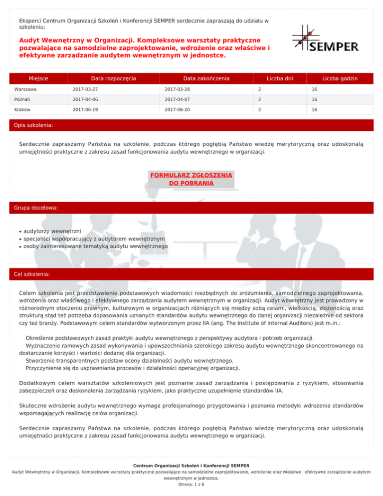 Eksperci Centrum Organizacji Szkoleń i Konferencji SEMPER serdecznie zapraszają do udziału w szkoleniu: Audyt Wewnętrzny w Organizacji. Kompleksowe warsztaty praktyczne pozwalające na samodzielne zaprojektowanie, wdrożenie oraz właściwe i efektywne zarządzanie audytem wewnętrznym w jednostce. Miejsce Data rozpoczęcia Data zakończenia Liczba dni Liczba godzin Warszawa 2017-03-27 2017-03-28 2 16 Poznań 2017-04-06 2017-04-07 2 16 Kraków 2017-06-19 2017-06-20 2 16 Opis szkolenia: Serdecznie zapraszamy Państwa na szkolenie, podczas którego pogłębią Państwo wiedzę merytoryczną oraz udoskonalą umiejętności praktyczne z zakresu zasad funkcjonowania audytu wewnętrznego w organizacji. FORMULARZ ZGŁOSZENIA DO POBRANIA Grupa docelowa: ● ● ● audytorzy wewnętrzni specjaliści współpracujący z audytorem wewnętrznym osoby zainteresowane tematyką audytu wewnętrznego Cel szkolenia: Celem szkolenia jest przedstawienie podstawowych wiadomości niezbędnych do zrozumienia, samodzielnego zaprojektowania, wdrożenia oraz właściwego i efektywnego zarządzania audytem wewnętrznym w organizacji. Audyt wewnętrzny jest prowadzony w różnorodnym otoczeniu prawnym, kulturowym w organizacjach różniących się między sobą celami, wielkością, złożonością oraz strukturą stąd też potrzeba dopasowania uznanych standardów audytu wewnętrznego do danej organizacji niezależnie od sektora czy też branży. Podstawowym celem standardów wytworzonym przez IIA (ang. The Institute of Internal Auditors) jest m.in.: Określenie podstawowych zasad praktyki audytu wewnętrznego z perspektywy audytora i potrzeb organizacji. Wyznaczenie ramowych zasad wykonywania i upowszechniania szerokiego zakresu audytu wewnętrznego skoncentrowanego na dostarczanie korzyści i wartości dodanej dla organizacji. Stworzenie transparentnych podstaw oceny działalności audytu wewnętrznego. Przyczynienie się do usprawniania procesów i działalności operacyjnej organizacji. Dodatkowym celem warsztatów szkoleniowych jest poznanie zasad zarządzania i postępowania z ryzykiem, stosowania zabezpieczeń oraz doskonalenia zarządzania ryzykiem, jako praktyczne uzupełnienie standardów IIA. Skuteczne wdrożenie audytu wewnętrznego wymaga profesjonalnego przygotowania i poznania metodyki wdrożenia standardów wspomagających realizację celów organizacji. Serdecznie zapraszamy Państwa na szkolenie, podczas którego pogłębią Państwo wiedzę merytoryczną oraz udoskonalą umiejętności praktyczne z zakresu zasad funkcjonowania audytu wewnętrznego w organizacji. Centrum Organizacji Szkoleń i Konferencji SEMPER Audyt Wewnętrzny w Organizacji. Kompleksowe warsztaty praktyczne pozwalające na samodzielne zaprojektowanie, wdrożenie oraz właściwe i efektywne zarządzanie audytem wewnętrznym w jednostce. Strona: 1 z 6 Korzyści dla uczestników: ● ● ● ● ● Nieocenionym walorem szkolenia jest możliwość spotkania i wymiany doświadczeń z przedstawicielami różnorodnych firm i instytucji realizujących podobne projekty w bliskim dla Uczestników środowisku. Szkolenia otwarte to szansa na spojrzenie na własny styl pracy z odmiennej perspektywy oraz poznać specyfikę pracy osób pracujących w innych organizacjach. Uczestnicy znacznie podwyższą swoje kwalifikacje i kompetencje z zakresu audytu wewnętrznego. Szkolenie pozwoli Uczestnikom na dogłębną analizę sytuacji trudnych i nietypowych oraz przedstawienie i omówienie nieprawidłowości związanych z audytem wewnętrznym w organizacjach. Jeżeli, mają Państwo taką potrzebę istnieje możliwość omówienia, wyjaśnienia lub konsultacji konkretnej sytuacji wynikającej z Państwa praktyki zawodowej. Metodologia: Szkolenie składa się z części prezentacyjnej dostarczającej wiedzę teoretyczną popartą przykładami i doświadczeniami prowadzącego oraz z części warsztatowej. Podczas warsztatów na przykładowym projekcie uczestnicy ćwiczą zdobyte umiejętności i przechodzą wszystkie etapy procesu zarządzania ryzykiem. Rozwiązanie każdego scenariusza (case study) jest omawiane z uczestnikami, zakończeniem dyskusji jest przejściem do rozwiązania wzorcowego. Jako pierwsza instytucja szkoleniowa w Polsce dbamy o to aby również szkolenia otwarte były dopasowane do oczekiwań oraz stylu pracy uczestników! Indywidualizacja szkolenia - dzięki udziałowi w takim szkoleniu uczestnicy osiągają oczekiwany przez pracodawcę poziom kompetencji i umiejętności. Zajęcia są prowadzone metodą warsztatową opartą na aktywizacji uczestników szkolenia poprzez pracę w małych grupach, dyskusje na forum grupy oraz ćwiczenia, studia przypadków, scenki rodzajowe, pracę indywidualną, symulacje i mini- wykłady z omówieniem przykładów z życia i prezentacją multimedialną. Przedmiotem zajęć są realne trudności uwzględniające specyfikę danej branży oraz potrzeby i możliwości osób biorących udział w warsztatach. Uczestnicy uczą się poprzez doświadczenie ćwiczą różne sytuacje, mają możliwość konsultacji indywidualnych. Nauka poprzez kreatywność, elastyczność i osobiste doświadczenia jest najskuteczniejszą formą zdobywania nowych umiejętności. Trener: dr inż. Martin Daliga Specjalizacja trenerska: Jest ekspertem w zakresie controllingu, kontroli zarządczej, zarządzania ryzykiem oraz audytu wewnętrznego. Jako niestrudzony propagator przywództwa sytuacyjnego Kennetha Blancharda skutecznie zarządzał zespołami interdyscyplinarnymi. Na przestrzeni ostatnich kilkunastu lat pracował z zespołami realizującymi projekty o budżetach sięgających ponad 20 mln zł. Pełnił szereg funkcji i ról w największych polskich przedsiębiorstwach, najbardziej dumny jest z udziału swojego zespołu w projektach związanych z optymalizacją procesów biznesowych i zwiększaniem ich konkurencyjności. Posiada pkilkuletnią praktykę trenerską w kreowaniu wartości biznesowych i zarządza