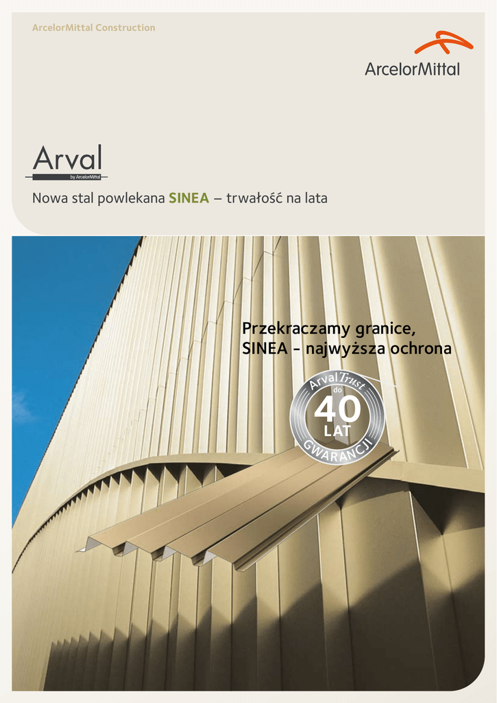 ArcelorMittal Construction Nowa stal powlekana SINEA – trwałość na lata Przekraczamy granice, SINEA - najwyższa ochrona alTru Arv do st G WA J I 40 LAT R ANC Sinea is the only pre-painted steel to be guaranteed for up to 40 years whatever the colour, without limitations on latitude and altitude, used for either roofs or sidings. SINEA gewährt als einzige Bandbeschichtung 40 Jahre Garantie für Dach- und Wandverkleidungen. Unabhängig von Farbton und Standort. alTru Arv do st gwarancja do 40 lat >> garanteed for 40 years >> bis zu 40 Jahre Garantie 40 LAT >> G WA J I SINEA to jedyna stal powlekana z gwarancją do 40 lat, niezależnie od koloru powłoki, zastosowania na danej szerokości geograficznej czy wysokości nad poziomem morza oraz użycia na dachach lub elewacjach. R ANC STAL POWLEKANA PRZEZNACZONA DO OBUDOWY DACHÓW I ELEWACJI. SINEA - INTELIGENTNE I TRWAŁE ROZWIĄZANIE Parametry techniczne … Its own technique ... Eine Technologie für sich ... »» Wysoka odporność SINEA na promienie UV, wilgotność, korozję, środki chemiczne oraz ścieranie wynika z użycia najnowszej technologii stworzonej przez ArcelorMittal: systemu wielowarstwowych, różnorodnych powłok, których kombinacja znacząco wzmacnia poszczególne charakterystyki systemu. »» Sinea’s long-lasting resistance to ultra-violet rays, humidity, corrosion, chemical agents, and abrasion is based on a new technology developed by ArcelorMittal: a multi-layer paint system, each layer of a different type, whose performance levels combine to increase the overall performance. »» Die Haltbarkeit von SINEA gegenüber UV-Strahlen, Feuchtigkeit, Korrosion, chemischen Stoffen und Abrieb basiert auf einer neuen Technologie von ArcelorMittal: Ein Mehrschichtsystem mit unvergleichbarer Leistungsfähigkeit. … plus nasze doświadczenie! ... plus expertise ! ... mit dem Wissen von Experten! »» ArcelorMittal już od 45 lat rozwija swoje know-how w zakresie stali powlekanej. Razem z SINEA otrzymujecie Państwo najwyższej jakości produkt, stworzony na podstawie znanej ale dopracowanej w szczegółach technologii. »» ArcelorMittal’s has demonstrated his know how for 45 years in pre-painted steel, with Sinea you can be certain of having a product that comes from thoroughly known and mastered technology. »» ArcelorMittal ist seit 45 Jahren führend im Bereich innovativer Beschichtungssysteme. Die SINEA Technologie vereint Expertenwissen und Know-how in der Anwendung. … gwarancja do 40 lat ... guaranteed for up to 40 years … bis zu 40 Jahren Garantie »» dla wszystkich kolorów, w tym także metalicznych. »» for all colours including metallic colours. »» für alle Farbtöne inklusive der Metallic-Farben. W zależności od lokalizacji inwestycji. Duration of the guarantee* depending on the project’s location for outdoors building cladding. Garantiedauer* abhängig vom Standort des Projekts für Beschichtungen von Außenfassaden. *W celu uzyskania gwarancji, przed realizacją projektu należy przesłać do nas wypełniony kwestionariusz środowiskowy. Gwarancja zostanie udzielona po przeanalizowaniu przez nas kwestionariusza. Niezanieczyszczone środowisko miejskie i wiejskie Środowisko miejskie, przemysłowe, > 3 km od morza Agresywne środowisko przemysłowe lub < 3 km od morza Unpolluted rural & urban environments Severe urban or industriel or > 3 km from the sea Severe industriel or < 3 km from the sea *Guarantee delivered after the environmental questionnaire, to be sent to our technical assistance department, has been analysed. They are subject to compliance with the inspection and maintenance terms and conditions described in our "Maintainance and Inspection Guide". Stadt belasted, industriell oder 13 > 3 km Meeresnähe Besondere 14 Industrie oder < 3 km Meeresnähe < 20-30 lat / years / Jahre < 15 lat / years / Jahre Unbelastete landschaftliche 11 12 & städtische Umgebungen < 40 lat / years / Jahre 2 *Diese Garantien werden nach Analyse des Umweltfragebogens bewilligt und unterliegen der Einhaltung von Inspektion und Wartung gemäß unserer Richtlinien. Stworzona specjalnie pod trwałe projekty architektoniczne, Sinea posiada właściwości techniczne, które spełniają różnorodne wymagania dotyczące między innymi warunków środowiskowych i rynku budowlanego. Designed for your sustainable architectural projects, Sinea has properties that meet new requirements concerning environmental impacts in the construction market. Sinea wurde für Ihre nachhaltigen Bau-vorhaben entwickelt und erfüllt mit seinen Eigenschaften alle umwelttechnischen Anforderungen der Baubranche. Inwestycje na lata >> Sustainable Investment >> Nachhaltiges Investment >> N/A Rynek budowlany to wykorzystanie szczególnie trwałych materiałów »» Energooszczędne budynki, to materiały łączące w sobie funkcje fotowoltaiczne oraz ochrony przed promieniami słonecznymi. »» Nowoczesne elektrownie, to możliwości adaptacyjne do zaspokajania rosnących potrzeb energetycznych. »» PPP - Partnerstwo Publiczno-Prywatne z rosnącym zapotrzebowaniem na trwałe materiały. »» Używając Sinea, możecie Państwo być pewni, że przez okres minimum 40 lat powłoki pozostaną niezmienione i zachowają swój oryginalny wygląd. Oznacza to także mniejsze wykorzystanie nieodnawialnych zasobów naturalnych poprzez unikanie przedwczesnej wymiany zastosowanych materiałów. Redukujemy emisję gazów cieplarnianych. Today buildings generate investments that justify new needs of sustainability ARCHI 3A Investitionen in neue Gebäude stellen hohe Anforderungen an die Werterhaltung »» Energy efficient buildings integrate photovoltaic functions and sun screen proprieties. »» Gebäude mit niedrigem Energieverbrauch, mit Photovoltaik-Lösungen, Sonnenschutzsystemen, ... »» The new power plants and their adaptation to meet the global growth of our electricity needs. »» Neue Kraftwerke, die durch das globale Wachstum und des stä