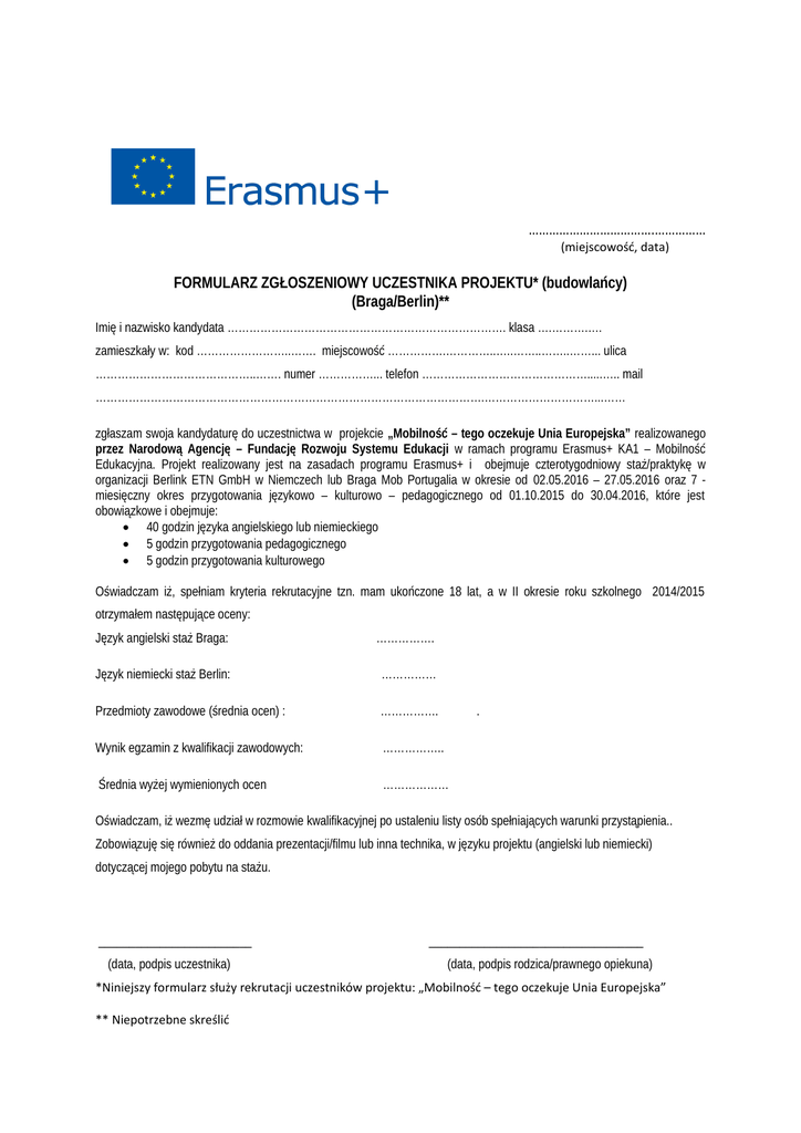 ……………………………….…………… (miejscowość, data) FORMULARZ ZGŁOSZENIOWY UCZESTNIKA PROJEKTU* (budowlańcy) (Braga/Berlin)** Imię i nazwisko kandydata …………………………………………………………………. klasa ….……….…. zamieszkały w: kod ……………………..……. miejscowość …………….…………..…..……..……..……... ulica ……………………………………..……. numer ……………... telefon ……………………………………….....….. mail …………………………………………………………………………………………….…………………………...…… zgłaszam swoja kandydaturę do uczestnictwa w projekcie „Mobilność – tego oczekuje Unia Europejska” realizowanego przez Narodową Agencję – Fundację Rozwoju Systemu Edukacji w ramach programu Erasmus+ KA1 – Mobilność Edukacyjna. Projekt realizowany jest na zasadach programu Erasmus+ i obejmuje czterotygodniowy staż/praktykę w organizacji Berlink ETN GmbH w Niemczech lub Braga Mob Portugalia w okresie od 02.05.2016 – 27.05.2016 oraz 7 miesięczny okres przygotowania językowo – kulturowo – pedagogicznego od 01.10.2015 do 30.04.2016, które jest obowiązkowe i obejmuje: 40 godzin języka angielskiego lub niemieckiego 5 godzin przygotowania pedagogicznego 5 godzin przygotowania kulturowego Oświadczam iż, spełniam kryteria rekrutacyjne tzn. mam ukończone 18 lat, a w II okresie roku szkolnego 2014/2015 otrzymałem następujące oceny: Język angielski staż Braga: ……………. Język niemiecki staż Berlin: …………… Przedmioty zawodowe (średnia ocen) : ……………. Wynik egzamin z kwalifikacji zawodowych: …………….. Średnia wyżej wymienionych ocen ……………… . Oświadczam, iż wezmę udział w rozmowie kwalifikacyjnej po ustaleniu listy osób spełniających warunki przystąpienia.. Zobowiązuję się również do oddania prezentacji/filmu lub inna technika, w języku projektu (angielski lub niemiecki) dotyczącej mojego pobytu na stażu. _________________________ (data, podpis uczestnika) ___________________________________ (data, podpis rodzica/prawnego opiekuna) *Niniejszy formularz służy rekrutacji uczestników projektu: „Mobilność – tego oczekuje Unia Europejska” ** Niepotrzebne skreślić