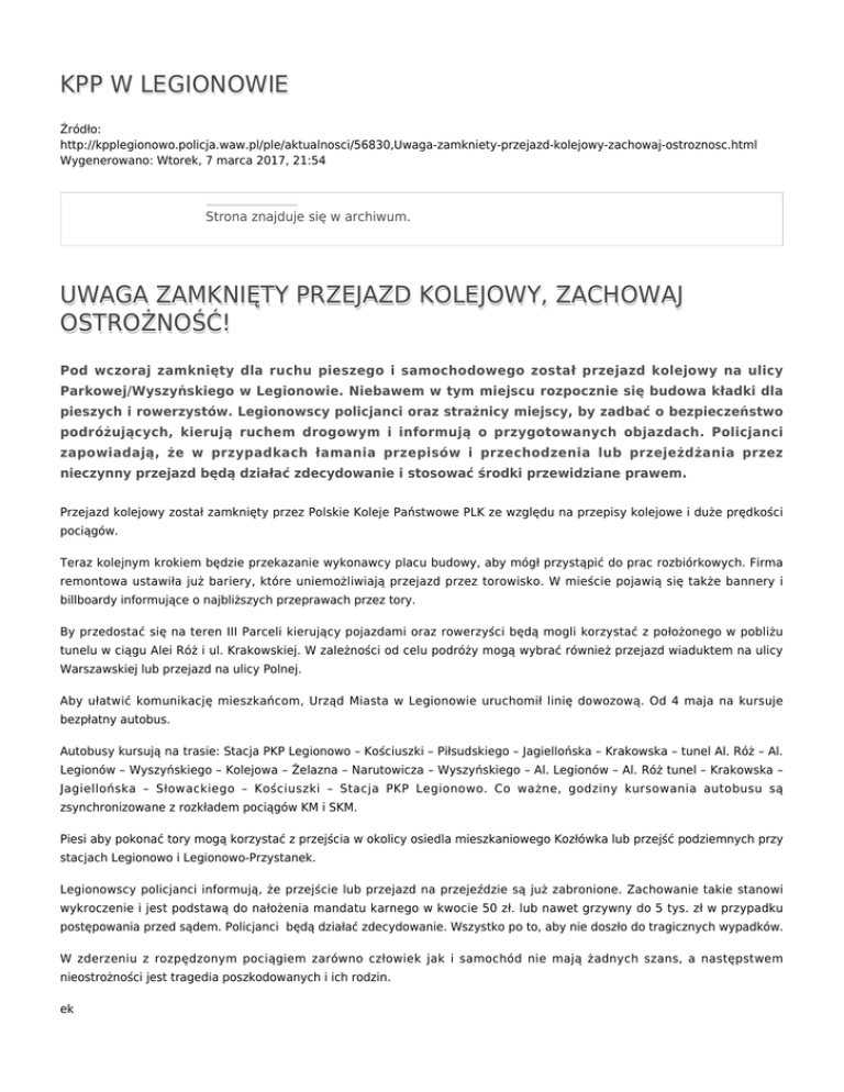 KPP W LEGIONOWIE Źródło: http://kpplegionowo.policja.waw.pl/ple/aktualnosci/56830,Uwaga-zamkniety-przejazd-kolejowy-zachowaj-ostroznosc.html Wygenerowano: Wtorek, 7 marca 2017, 21:54 Strona znajduje się w archiwum. UWAGA ZAMKNIĘTY PRZEJAZD KOLEJOWY, ZACHOWAJ OSTROŻNOŚĆ! Pod wczoraj zamknięty dla ruchu pieszego i samochodowego został przejazd kolejowy na ulicy Parkowej/Wyszyńskiego w Legionowie. Niebawem w tym miejscu rozpocznie się budowa kładki dla pieszych i rowerzystów. Legionowscy policjanci oraz strażnicy miejscy, by zadbać o bezpieczeństwo podróżujących, kierują ruchem drogowym i informują o przygotowanych objazdach. Policjanci zapowiadają, że w przypadkach łamania przepisów i przechodzenia lub przejeżdżania przez nieczynny przejazd będą działać zdecydowanie i stosować środki przewidziane prawem. Przejazd kolejowy został zamknięty przez Polskie Koleje Państwowe PLK ze względu na przepisy kolejowe i duże prędkości pociągów. Teraz kolejnym krokiem będzie przekazanie wykonawcy placu budowy, aby mógł przystąpić do prac rozbiórkowych. Firma remontowa ustawiła już bariery, które uniemożliwiają przejazd przez torowisko. W mieście pojawią się także bannery i billboardy informujące o najbliższych przeprawach przez tory. By przedostać się na teren III Parceli kierujący pojazdami oraz rowerzyści będą mogli korzystać z położonego w pobliżu tunelu w ciągu Alei Róż i ul. Krakowskiej. W zależności od celu podróży mogą wybrać również przejazd wiaduktem na ulicy Warszawskiej lub przejazd na ulicy Polnej. Aby ułatwić komunikację mieszkańcom, Urząd Miasta w Legionowie uruchomił linię dowozową. Od 4 maja na kursuje bezpłatny autobus. Autobusy kursują na trasie: Stacja PKP Legionowo – Kościuszki – Piłsudskiego – Jagiellońska – Krakowska – tunel Al. Róż – Al. Legionów – Wyszyńskiego – Kolejowa – Żelazna – Narutowicza – Wyszyńskiego – Al. Legionów – Al. Róż tunel – Krakowska – Jagiellońska – Słowackiego – Kościuszki – Stacja PKP Legionowo. Co ważne, godziny kursowania autobusu są zsynchronizowane z rozkładem pociągów KM i SKM. Piesi aby pokonać tory mogą korzystać z przejścia w okolicy osiedla mieszkaniowego Kozłówka lub przejść podziemnych przy stacjach Legionowo i Legionowo-Przystanek. Legionowscy policjanci informują, że przejście lub przejazd na przejeździe są już zabronione. Zachowanie takie stanowi wykroczenie i jest podstawą do nałożenia mandatu karnego w kwocie 50 zł. lub nawet grzywny do 5 tys. zł w przypadku postępowania przed sądem. Policjanci będą działać zdecydowanie. Wszystko po to, aby nie doszło do tragicznych wypadków. W zderzeniu z rozpędzonym pociągiem zarówno człowiek jak i samochód nie mają żadnych szans, a następstwem nieostrożności jest tragedia poszkodowanych i ich rodzin. ek inf.UM Legionowo Ocena: 0/5 (0) Tweetnij
