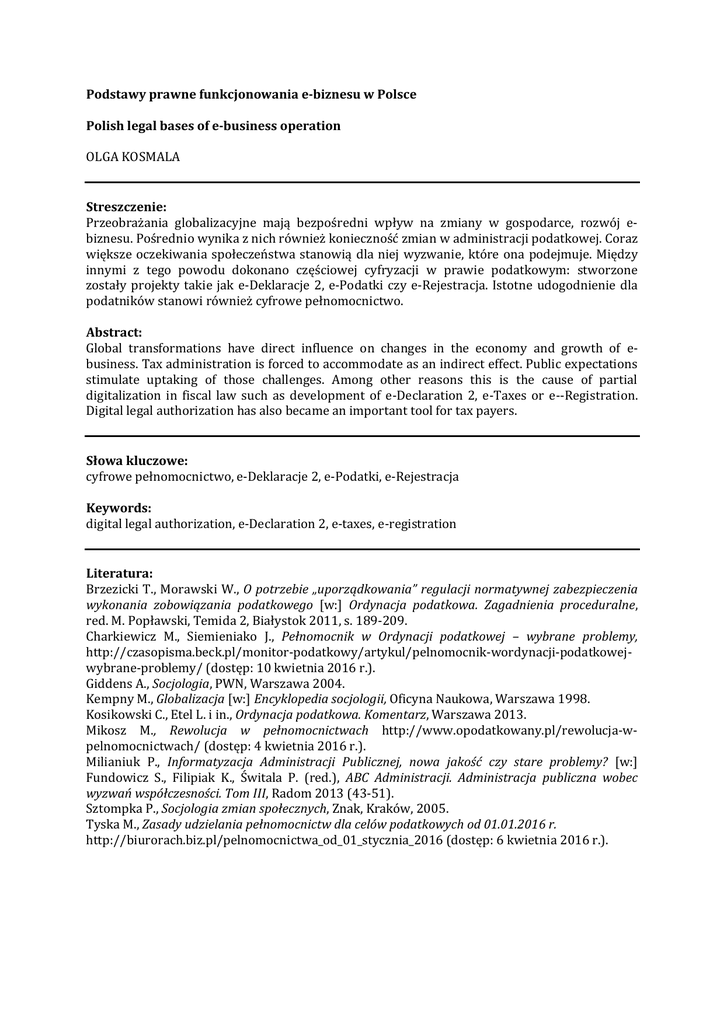 Podstawy prawne funkcjonowania e-biznesu w Polsce Polish legal bases of e-business operation OLGA KOSMALA Streszczenie: Przeobrażania globalizacyjne mają bezpośredni wpływ na zmiany w gospodarce, rozwój ebiznesu. Pośrednio wynika z nich również konieczność zmian w administracji podatkowej. Coraz większe oczekiwania społeczeństwa stanowią dla niej wyzwanie, które ona podejmuje. Między innymi z tego powodu dokonano częściowej cyfryzacji w prawie podatkowym: stworzone zostały projekty takie jak e-Deklaracje 2, e-Podatki czy e-Rejestracja. Istotne udogodnienie dla podatników stanowi również cyfrowe pełnomocnictwo. Abstract: Global transformations have direct influence on changes in the economy and growth of ebusiness. Tax administration is forced to accommodate as an indirect effect. Public expectations stimulate uptaking of those challenges. Among other reasons this is the cause of partial digitalization in fiscal law such as development of e-Declaration 2, e-Taxes or e--Registration. Digital legal authorization has also became an important tool for tax payers. Słowa kluczowe: cyfrowe pełnomocnictwo, e-Deklaracje 2, e-Podatki, e-Rejestracja Keywords: digital legal authorization, e-Declaration 2, e-taxes, e-registration Literatura: Brzezicki T., Morawski W., O potrzebie „uporządkowania” regulacji normatywnej zabezpieczenia wykonania zobowiązania podatkowego [w:] Ordynacja podatkowa. Zagadnienia proceduralne, red. M. Popławski, Temida 2, Białystok 2011, s. 189-209. Charkiewicz M., Siemieniako J., Pełnomocnik w Ordynacji podatkowej – wybrane problemy, http://czasopisma.beck.pl/monitor-podatkowy/artykul/pelnomocnik-wordynacji-podatkowejwybrane-problemy/ (dostęp: 10 kwietnia 2016 r.). Giddens A., Socjologia, PWN, Warszawa 2004. Kempny M., Globalizacja [w:] Encyklopedia socjologii, Oficyna Naukowa, Warszawa 1998. Kosikowski C., Etel L. i in., Ordynacja podatkowa. Komentarz, Warszawa 2013. Mikosz M., Rewolucja w pełnomocnictwach http://www.opodatkowany.pl/rewolucja-wpelnomocnictwach/ (dostęp: 4 kwietnia 2016 r.). Milianiuk P., Informatyzacja Administracji Publicznej, nowa jakość czy stare problemy? [w:] Fundowicz S., Filipiak K., Świtala P. (red.), ABC Administracji. Administracja publiczna wobec wyzwań współczesności. Tom III, Radom 2013 (43-51). Sztompka P., Socjologia zmian społecznych, Znak, Kraków, 2005. Tyska M., Zasady udzielania pełnomocnictw dla celów podatkowych od 01.01.2016 r. http://biurorach.biz.pl/pelnomocnictwa_od_01_stycznia_2016 (dostęp: 6 kwietnia 2016 r.).