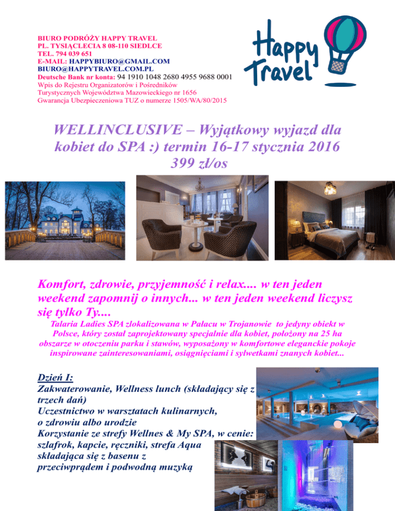 BIURO PODRÓŻY HAPPY TRAVEL PL. TYSIĄCLECIA 8 08-110 SIEDLCE TEL. 794 039 651 E-MAIL: [email protected] [email protected] Deutsche Bank nr konta: 94 1910 1048 2680 4955 9688 0001 Wpis do Rejestru Organizatorów i Pośredników Turystycznych Województwa Mazowieckiego nr 1656 Gwarancja Ubezpieczeniowa TUZ o numerze 1505/WA/80/2015 WELLINCLUSIVE – Wyjątkowy wyjazd dla kobiet do SPA :) termin 16-17 stycznia 2016 399 zł/os Komfort, zdrowie, przyjemność i relax.... w ten jeden weekend zapomnij o innych... w ten jeden weekend liczysz się tylko Ty.... Talaria Ladies SPA zlokalizowana w Pałacu w Trojanowie to jedyny obiekt w Polsce, który został zaprojektowany specjalnie dla kobiet, położony na 25 ha obszarze w otoczeniu parku i stawów, wyposażony w komfortowe eleganckie pokoje inspirowane zainteresowaniami, osiągnięciami i sylwetkami znanych kobiet... Dzień I: Zakwaterowanie, Wellness lunch (składający się z trzech dań) Uczestnictwo w warsztatach kulinarnych, o zdrowiu albo urodzie Korzystanie ze strefy Wellnes & My SPA, w cenie: szlafrok, kapcie, ręczniki, strefa Aqua składająca się z basenu z przeciwprądem i podwodną muzyką (temp 30°C) oraz jacuzzi (36°C) ,strefy relaksu z widokiem na ogród i fontannę, saunowej strefy zmysłów z sauną kamienną i infrared, chłodzącej drogi zmysłów i kąpieli stóp wg dr Kneippa, domku ziołowego, codzienny seans witalności zgodnie z tygodniowym harmonogramem, a w jego ramach np. : rytuał w kamiennej saunie, solny peeling lub wypoczynek w perłowym hammamie czy też koncert w dźwiękach gongu w Sali Body & Mind, specjalnie dla nas 10% zniżka na wszystkie pozostałe zabiegi SPA. Kolacja (dwu daniowa) Nocleg w eleganckich pokojach (1 lub 2-os) na specjalnie dobranych materacach linii Wellness Comfort Line oraz możliwość wybrania do pokoju jednej z serii kosmetyków hotelowych. Wieczorek przy kominku i muzyce ;) Dzień II: Bogaty bufet śniadaniowy z kieliszkiem szamana ;) Poranne ćwiczenia (Pięciu Tybetańczyków przy dźwiękach gongów, Aqua Fitness) Korzystanie ze strefy Wellnes & My SPA Wykwaterowanie W cenie: nocleg w Pawilonie Parkowym, wyżywienie wg programu, atrakcje wg programu, transport autokarem (wyjazd z Siedlec), ubezpieczenie, opiekę pracownika biura. Zapisy przyjmujemy pod nr tel.: 794 039 651 lub w siedzibie biura pl. Tysiąclecia 8 Siedlce, zaliczka 150 zł / os do 20 grudnia liczba miejsc ograniczona!