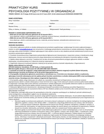 FORMULARZ ZGŁOSZENIOWY PRAKTYCZNY KURS PSYCHOLOGII POZYTYWNEJ W ORGANIZACJI TERMIN I MIEJSCE: 16-17 lutego, 02-03 marca oraz 16-17 marca 2017r. (6 dni szkoleniowych) WARSZAWA-REMBERTÓW DANE UCZESTNIKA: Imię i nazwisko: ............................................................. Stanowisko: .............................................................. e-mail: ........................................................................ Telefon: .................................................................... Nazwa Firmy............................................................... NIP: ................................................. Ulica, nr domu, nr lokalu: .............................................. Miejscowość i kod pocztowy: ....................................... PROSIMY O ZAZNACZENIE ODPOWIEDNIEJ OPCJI: o 4410 zł/os (w tym 23% VAT) przy zgłoszeniu do 23 stycznia 2017 r. Cena obejmuje: udział w sześciodniowym kursie, materiały, przerwy kawowe, zaświadczenie ukończenia kursu. o 4900 zł/os (w tym 23% VAT) przy zgłoszeniu od 24 stycznia 2017 r. Cena obejmuje: udział w sześciodniowym kursie, materiały, przerwy kawowe, zaświadczenie ukończenia kursu. EWENTUALNE UWAGI: ...................................................................................................................................... WARUNKI ZGŁOSZENIA: 1. Warunkiem zgłoszenia udziału w usłudze edukacyjnej jest przesłanie wypełnionego i podpisanego formularza zgłoszeniowego emailem na adres [email protected] oraz otrzymanie e-mailowego potwierdzenia uczestnictwa w usłudze edukacyjnej. Organizator zastrzega sobie prawo kontaktu z osobami zgłaszającymi chęć udziału w kursie w celu zbadania potrzeb szkoleniowych przed oraz po przesłaniu potwierdzenia zgłoszenia. 2. Przesłane Uczestnikowi przez Organizatora potwierdzenie Zgłoszenia jest równoznaczne z zawarciem umowy o świadczenie usługi edukacyjnej, stanowi warunek dopuszczenia do usługi edukacyjnej oraz podstawę do obciążenia Uczestnika opłatą za usługę. 3. Wpłaty należy dokonać w terminie 7 (siedmiu) dni od daty otrzymania potwierdzenia przyjęcia zgłoszenia udziału w usłudze edukacyjnej, nie później jednak niż 2 (dwa) dni przed jej rozpoczęciem. 4. Organizator dopuszcza możliwość płatności ratalnej (w tej sprawie prosimy o kontakt indywidualny z Organizatorem). Wpłaty należy dokonać na rachunek: ENTUZJA Szkolenia i doradztwo, 43-100 Tychy, ul. Zwierzyniecka 96, BRE Bank Spółka Akcyjna w Warszawie 30 1140 2004 0000 3602 3568 6637. 5. Uczestnik ma prawo do rezygnacji z usługi edukacyjnej pod warunkiem złożenia rezygnacji na piśmie (listem lub pocztą elektroniczną) w terminie nie krótszym niż 14 dni przed rozpoczęciem kursu. 6. W przypadku nieodwołania zgłoszenia uczestnictwa w określonym w p. 5 terminie oraz niewzięcia udziału w wydarzeniu, zgłaszający Uczestnik zobowiązany jest do zapłaty pełnych kosztów uczestnictwa w usłudze edukacyjnej (100% ceny) wynikających z zawartej umowy. Decydująca jest data wpływu rezygnacji do Organizatora. 7. W przypadku, gdyby usługa edukacyjna nie odbyła się z powodów niezależnych od Organizatora, Uczestnikowi zostanie zaproponowany udział w usłudze edukacyjnej w innym terminie lub w ciągu 14 dni roboczych zostanie zwrócona pełna kwota wpłaty. 8. Organizator zastrzega sobie prawo odmowy uczestnictwa w usłudze edukacyjnej. W przypadku dokonania wpłaty za uczestnictwo w usłudze edukacyjnej, pełna kwota wpłaty zostanie zwrócona w ciągu 14 dni roboczych. 9. Dokonanie Zgłoszenia jest równoznaczne z akceptacją niniejszych warunków oraz akceptacją warunków Regulaminu i upoważnieniem Organizatora do wystawienia faktury VAT bez składania podpisu przez Uczestnika albo osobę upoważnioną ze strony zgłaszającego Uczestnika. 10. Organizator zastrzega sobie prawo do wprowadzania zmian dot. programu wynikających ze zbadanych potrzeb szkoleniowych, zmian prelegentów w przypadkach nagłych oraz do odwołania wydarzenia. 11. Organizator dołoży wszelkich starań, by poziom usługi spełniał najwyższe standardy edukacyjne, nie jest jednak odpowiedzialny za poziom nabytej przez Uczestnika wiedzy, jak również za efekty wykorzystania wszelkich informacji przekazanych przez Organizatora w trakcie szkolenia. o Wyrażam zgodę na przetwarzanie podanych w formularzu danych osobowych w zakresie niezbędnym do obsługi logistycznej zgłoszenia, zgodnie z ustawą z dnia 18 lipca 2002 r. o świadczeniu usług drogą elektroniczną oraz ustawą z dnia 29 sierpnia 1997 r. o ochronie danych osobowych. Administratorem danych jest Entuzja. Szkolenia i doradztwo z siedzibą w Tychach, ul. Zwierzyniecka 96. Informujemy, że mają Państwo prawo dostępu do swoich danych oraz możliwość ich poprawiania. Podanie danych ma charakter dobrowolny, jest jednak niezbędne, żeby móc zarejestrować Państwa zgłoszenie na kurs. o Wyrażam zgodę na przetwarzanie danych osoby dokonującej zgłoszenia w celach marketingowych, w tym na otrzymywanie informacji handlowych na podany w formularzu adres e-mail, zgodnie z ustawą z dnia 18 lipca 2002 r. o świadczeniu usług drogą elektroniczną oraz ustawą z dnia 29 sierpnia 1997 r. o ochronie danych osobowych. Podanie danych ma charakter dobrowolny, jednak bez wyrażenia zgody nie będziemy mogli wysyłać do Państwa newslettera utrwalającego wiedzę po kursie, informacji o nowościach i aktualnych promocjach. Informujemy również, że mają Państwo prawo dostępu do swoich danych oraz możliwość ich poprawiania. Administratorem danych jest Entuzja. Szkolenia i doradztwo z siedzibą w Tychach, ul. Zwierzyniecka 96. miejscowość, data i podpis pieczątka firmy (opcjonalnie)