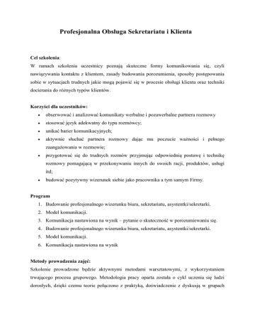 Profesjonalna Obsługa Sekretariatu i Klienta Cel szkolenia: W ramach szkolenia uczestnicy poznają skuteczne formy komunikowania się, czyli nawiązywania kontaktu z klientem, zasady budowania porozumienia, sposoby postępowania sobie w sytuacjach trudnych jakie mogą pojawić się w procesie obsługi klienta oraz techniki docierania do różnych typów klientów. Korzyści dla uczestników: obserwować i analizować komunikaty werbalne i pozawerbalne partnera rozmowy stosować język adekwatny do typu rozmówcy; unikać barier komunikacyjnych; aktywnie słuchać partnera rozmowy dając mu poczucie ważności i pełnego zaangażowania w rozmowie; przygotować się do trudnych rozmów przyjmując odpowiednią postawę i technikę rozmowy pomagającą w przekonywaniu innych do swoich racji, produktów, usługi itd; budować pozytywny wizerunek siebie jako pracownika a tym samym Firmy. Program 1. Budowanie profesjonalnego wizerunku biura, sekretariatu, asystentki/sekretarki. 2. Model komunikacji. 3. Komunikacja nastawiona na wynik – pytanie o skuteczność w porozumiewaniu się. 4. Budowanie profesjonalnego wizerunku biura, sekretariatu, asystentki/sekretarki. 5. Model komunikacji. 6. Komunikacja nastawiona na wynik Metody prowadzenia zajęć: Szkolenie prowadzone będzie aktywnymi metodami warsztatowymi, z wykorzystaniem trwającego procesu grupowego. Metodologia pracy oparta została o cykl uczenia się ludzi dorosłych, dzięki czemu teorie połączono z praktyką, doświadczenie z dyskusją w grupach mająca na celu podsumowanie danego tematu. Trener podsumowuje moduły, dzięki czemu uczestnicy w pełni poznają analizowane zagadnienie. Świadectwo kwalifikacyjne: Zaświadczenia uczestnictwa w szkoleniu wydawane przez Centrum Szkoleń i Certyfikacji Wyższej Szkoły Gospodarki w Bydgoszczy. Egzamin/zaliczenie: Zaliczenie na podstawie systematycznego i aktywnego uczestnictwa w zajęciach. Termin i miejsce: ilość godzin: 16