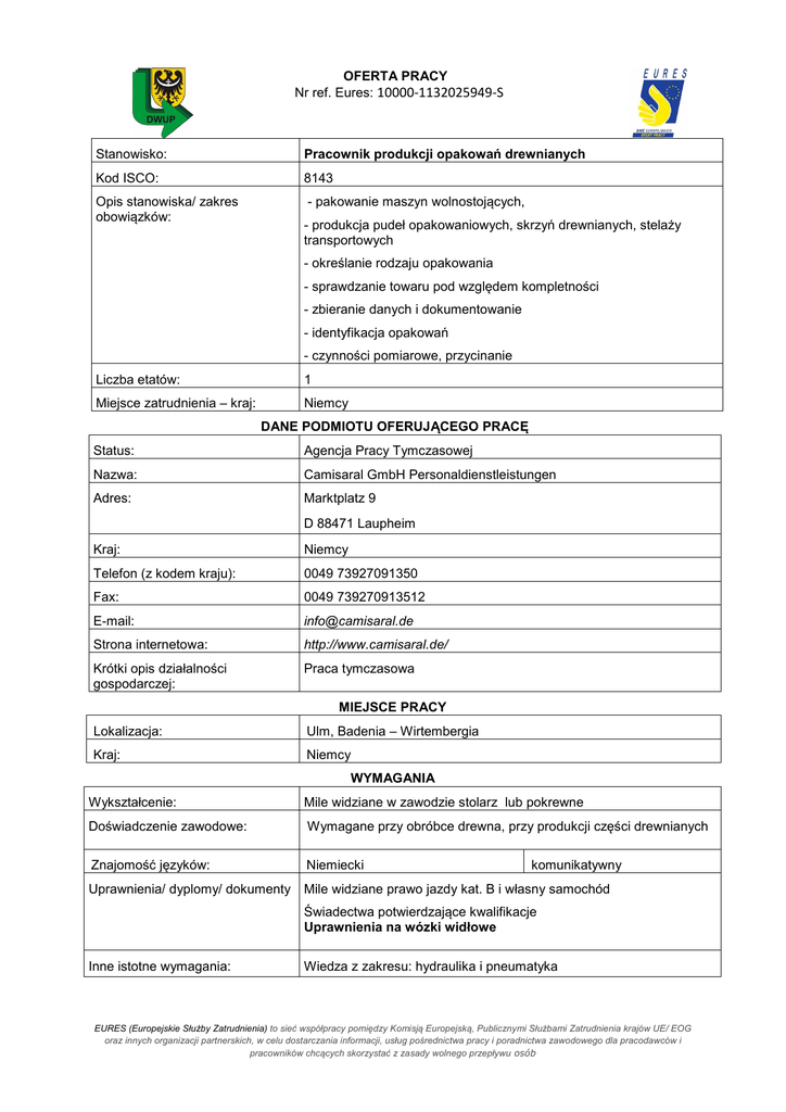OFERTA PRACY Nr ref. Eures: 10000-1132025949-S Stanowisko: Pracownik produkcji opakowań drewnianych Kod ISCO: 8143 Opis stanowiska/ zakres obowiązków: - pakowanie maszyn wolnostojących, - produkcja pudeł opakowaniowych, skrzyń drewnianych, stelaży transportowych - określanie rodzaju opakowania - sprawdzanie towaru pod względem kompletności - zbieranie danych i dokumentowanie - identyfikacja opakowań - czynności pomiarowe, przycinanie Liczba etatów: 1 Miejsce zatrudnienia – kraj: Niemcy DANE PODMIOTU OFERUJĄCEGO PRACĘ Status: Agencja Pracy Tymczasowej Nazwa: Camisaral GmbH Personaldienstleistungen Adres: Marktplatz 9 D 88471 Laupheim Kraj: Niemcy Telefon (z kodem kraju): 0049 73927091350 Fax: 0049 739270913512 E-mail: [email protected] Strona internetowa: http://www.camisaral.de/ Krótki opis działalności gospodarczej: Praca tymczasowa MIEJSCE PRACY Lokalizacja: Ulm, Badenia – Wirtembergia Kraj: Niemcy WYMAGANIA Wykształcenie: Mile widziane w zawodzie stolarz lub pokrewne Doświadczenie zawodowe: Wymagane przy obróbce drewna, przy produkcji części drewnianych Znajomość języków: Niemiecki Uprawnienia/ dyplomy/ dokumenty Mile widziane prawo jazdy kat. B i własny samochód komunikatywny Świadectwa potwierdzające kwalifikacje Uprawnienia na wózki widłowe Inne istotne wymagania: Wiedza z zakresu: hydraulika i pneumatyka EURES (Europejskie Służby Zatrudnienia) to sieć współpracy pomiędzy Komisją Europejską, Publicznymi Służbami Zatrudnienia krajów UE/ EOG oraz innych organizacji partnerskich, w celu dostarczania informacji, usług pośrednictwa pracy i poradnictwa zawodowego dla pracodawców i pracowników chcących skorzystać z zasady wolnego przepływu osób WYNAGRODZENIE I WARUNKI ZATRUDNIENIA Wysokość pensji brutto: 15,50 Euro / godz. Waluta, w jakiej wypłacana jest pensja: Euro Rodzaj stawki wynagrodzenia: Godzinowa Dodatkowe świadczenia: - pracodawca pomaga w znalezieniu zakwaterowania Nazwa firmy, z którą zostanie podpisana umowa: Camisaral GmbH Rodzaj umowy: Umowa o pracę Wymiar czasu pracy Pełen etat Czas trwania umowy: Umowa na czas nieokreślony Liczba godzin tygodniowo: 40 Zmiany i praca w dni wolne: Nie Data rozpoczęcia: Od zaraz SPOSÓB SKŁADANIA WNIOSKU Wymagane dokumenty: CV w j. niemieckim, świadectwa Język, w którym muszą być sporządzone przedkładane dokumenty: Niemiecki Do kogo należy wysłać dokumenty: Do Agencji Pracy Tymczasowej Gdzie należy wysłać dokumenty: Na adres e-mail: [email protected] W tytule proszę wpisać: „Holzfachwerker” Dane teleadresowe doradcy EURES lub przedstawiciela pracodawcy: Pani Petra Hanrieder - 0049 73927091350 WAŻNOŚĆ Data publikacji: 18.09.2015 r. Termin przedkładania podań o pracę / zakończenia ważności oferty: Do odwołania Agencja pracy tymczasowej Camisaral GmbH Personaldienstleistungen oświadczyła, że prowadzi działalność zgodnie z przepisami obowiązującymi na terenie Niemiec. UWAGA: 1. Umowa z zagranicznym pracodawcą zostanie zawarta zgodnie z prawem kraju zatrudnienia. Oznacza to, że wszystkie roszczenia odnośnie do warunków, które obejmuje umowa, można kierować wyłącznie do odpowiedniego sądu w kraju zatrudnienia. Publiczne służby zatrudnienia (EURES) nie mogą pośredniczyć ani reprezentować pracownika w sądzie kraju zatrudnienia w przypadku sporu z pracodawcą. 2. Publiczne służby zatrudnienia (EURES) dokładają wszelkich starań, aby zapewnić rzetelność i wiarygodność ofert pracy zgłoszonych w lokalnym urzędzie pracy. Należy wyjaśnić, że oferta pracy została zgłoszona przez stronę trzecią i EURES nie odpowiada za ewentualne rozbieżności między warunkami pracy określonymi w ofercie pracy i warunkami oferowanymi przez potencjalnego pracodawcę. 3. Publiczne służby zatrudnienia (EURES) informują, że będą zbierać, przetwarzać i przekazywać potencjalnym pracodawcom zgodnie z przepisami dotyczącymi ochrony danych osobowych wszystkie dane osobowe dostarczone przez osoby poszukujące pracy. EURES (Europejskie Służby Zatrudnienia) to sieć współpracy pomiędzy Komisją Europejską, Publicznymi Służbami Zatrudnienia krajów UE/ EOG oraz innych organizacji partnerskich, w celu dostarczania informacji, usług pośrednictwa pracy i poradnictwa zawodowego dla pracodawców i pracowników chcących skorzystać z zasady wolnego przepływu osób