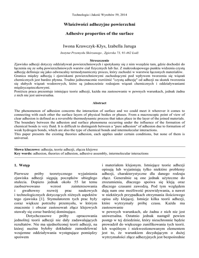 Technologia i Jakość Wyrobów 59, 2014 Właściwości adhezyjne powierzchni Adhesive properties of the surface Iwona Krawczyk-Kłys, Izabella Jaruga Instytut Przemysłu Skórzanego , Zgierska 73, 91-462 Łodź Streszczenie Zjawisko adhezji dotyczy oddziaływań powierzchniowych i spotykamy się z nim wszędzie tam, gdzie dochodzi do łączenia się ze sobą powierzchniowych warstw ciał fizycznych lub faz. Z makroskopowego punktu widzenia czystą adhezję definiuje się jako odwracalny termodynamiczny proces, który zachodzi w warstwie łączonych materiałów. Granica między adhezją i zjawiskami powierzchniowymi zachodzącymi pod wpływem tworzenia się wiązań chemicznych jest bardzo płynna. Trudno jednoznacznie rozróżnić "czystą adhezję" od adhezji na skutek tworzenia się słabych wiązań wodorowych, które są jednocześnie rodzajem wiązań chemicznych i oddziaływaniami międzycząsteczkowymi. Poniższa praca prezentuje istniejące teorie adhezji, każda ma zastosowanie w pewnych warunkach, jednak żadna z nich nie jest uniwersalna. Abstract The phenomenon of adhesion concerns the interaction of surface and we could meet it wherever it comes to connecting with each other the surface layers of physical bodies or phases. From a macroscopic point of view of clear adhesion is defined as a reversible thermodynamic process that takes place in the layer of the joined materials. The boundary between the adhesion and surface phenomena occurring under the influence of the formation of chemical bonds is very fluid. It is difficult to distinguish between a "pure adhesion" of adhesion due to formation of weak hydrogen bonds, which are also the type of chemical bonds and intermolecular interactions. This paper presents the existing theories adhesion, each applies under certain conditions, but none of them is universal. Słowa kluczowe: adhezja, teorie adhezji, złącza klejowe Key words: adhesion, theories of adhesion, adhesive assembly, intermolecular interactions 1. Wstęp Pierwsze próby teoretycznego wyjaśnienia zjawiska adhezji sięgają początków ubiegłego stulecia. Dopiero jednak około 55 lat temu zaobserwowano wzrost zainteresowania i gwałtowny rozwój prac naukowych i technologicznych dotyczących różnych aspektów tego zjawiska [1]. Stymulatorem tych prac były coraz większe potrzeby przemysłu, w którym znaczenie i obszar zastosowań złącz klejowych stawały się coraz bardziej dominujące. Dotychczasowe próby opracowania jednolitej teorii adhezji nie dały zadawalających rezultatów. Nie ma ujednoliconej teorii adhezji, na której można byłoby dokładnie zamodelować wzajemne oddziaływania występujące pomiędzy spoiwem i materiałem klejonym. Istniejące teorie adhezji opisują lub wyjaśniają tylko niektóre problemy adhezji, charakterystyczne dla danego rodzaju złącz. Generalnie są one jednak użyteczne do zrozumienia, dlaczego spoiwa się kleją oraz dlaczego czasami zawodzą. Pod tym względem dają nam one możliwość przewidywania, a nawet w niektórych przypadkach otrzymania ilościowego opisu siły klejącej. Istnieje kilka teorii adhezji, które wytrzymały próbę czasu. Każda ma zastosowanie w pewnych warunkach, ale żadna z nich nie jest uniwersalna. Ostatnio jednak nastąpił pewien postęp w tej dziedzinie, który nieuchronnie będzie prowadził do większego zunifikowania tych teorii. Ich wspólnym i niekwestionowanym elementem jest to, że warunkiem decydującym o dużej wytrzymałości złącz adhezyjnych jest bezpośrednie Technologia i Jakość Wyrobów 59, 2014 zbliżenie do siebie cząsteczek kleju i danego materiału. Efektem tego zbliżenia jest pojawienie się oddziaływań międzycząsteczkowych, które są głównym czynnikiem wpływającym na wytrzymałość tych złącz [1]. 2. Teorie adhezji 2.1. Teoria adsorpcji Najbardziej powszechne teorie adhezji oparte są na zjawisku adsorpcji, prostym mechanicznym sczepianiu, dyfuzji, oddziaływaniach elektrostatycznych i koncepcji słabych warstwach granicznych. Teoria adsorpcji stwierdza, że adhezja wynika z kontaktu molekularnego między dwoma materiałami i z obecności sił powierzchniowych. Cząsteczki kleju są adsorbowane na podłożu w wyniku działania sił przyciągania, zazwyczaj przypisywanych siłom van der Waalsa. Aby powstały te siły, odpowiednie powierzchnie nie mogą być oddalone od siebie o więcej niż 0,5 nm. Wobec tego spoiwo musi stanowić ścisły, molekularny kontakt z powierzchnią podłoża. Proces tworzenia ciągłego kontaktu pomiędzy klejem a podłożem określa się mianem zwilżania. Dobre zwilżanie występuje, gdy klej wpływa do wgłębień i szczelin na powierzchni podłoża, słabe – gdy klej tworzy mosty nad wgłębieniami uformowanymi przez te szczeliny. Osiągnięcie szczelnego kontaktu kleju z powierzchnią zasadniczo zapewnia stan, w którym międzyfazowe skazy są zminimalizowane lub wyeliminowane. Słabe zwilżenie powoduje mniejszą rzeczywistą kontaktu pomiędzy klejem powierzchnię i materiałem klejonym, a rozwijają się obszary naprężeń w małych przestrzeniach wypełnionych powietrzem wzdłuż obszaru międzyfazowego, co prowadzi do zmniejszenia całkowitej wytrzymałości połączenia. Zwilżanie można określić poprzez pomiar kątów zwilżania, którego idea jest schematycznie przedstawiona na rysunku 1. Rysunek 1. Idea pomiaru kąta zwilżania. Idea pomiaru kąta zwilżania oparta jest na równaniu Younga, które wiąże równowagowy kąt zwilżania, θ , tworzony pomiędzy kroplą czynnika zwilżającego a powierzchnią podłoża, z odpowiednimi napięciami powierzchniowymi w punkcie styku trzech faz, tzn. ciała stałego (podłoża), cieczy zwilżającej i jej pary: σ SV = σ SL + σ LV ⋅ cos θ (1) gdzie: σ SV − napięcie powierzchniowe ciała stałego (polimeru) w równowadze z parą nasyconą cieczy, σ LV − napięcie powierzchniowe cieczy w równowadze z parą nasyconą tej cieczy, σ SL − międ