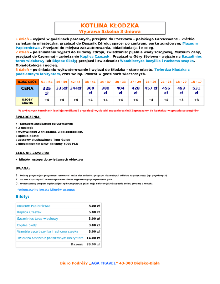 KOTLINA KŁODZKA Wyprawa Szkolna 3 dniowa 1 dzień – wyjazd w godzinach porannych, przejazd do Paczkowa – polskiego Carcassonne - krótkie zwiedzanie miasteczka, przejazd do Dusznik Zdroju; spacer po centrum, parku zdrojowym; Muzeum Papiernictwa . Przejazd do miejsca zakwaterowania, obiadokolacja i nocleg. 2 dzień – po śniadaniu wyjazd do Kudowy Zdroju, zwiedzanie: pijalnia wody zdrojowej, Muzeum Żaby, przejazd do Czermnej – zwiedzanie Kaplica Czaszek . Przejazd w Góry Stołowe - wejście na Szczeliniec taras widokowy lub Błędne Skały; przejazd i zwiedzanie: Wambierzyce bazylika i ruchoma szopka. Obiadokolacja i nocleg. 3 dzień – po śniadaniu wykwaterowanie i wyjazd do Kłodzka – stare miasto, Twierdza Kłodzka z podziemnym labiryntem, czas wolny. Powrót w godzinach wieczornych. ILOŚĆ OSÓB 51 - 54 CENA 325 zł OSOBY GRATIS +4 46 - 50 42- 45 335zł 344zł +4 +4 38 - 41 34 - 37 30 - 33 27 - 29 24 - 26 21 - 23 18 - 20 15 - 17 360 zł 380 zł 404 zł 428 zł 457 zł 456 zł 493 zł 531 zł +4 +4 +4 +4 +4 +4 +3 +3 W wybranych terminach istnieje możliwość organizcji wycieczki znacznie taniej! Zapraszamy do kontaktu w sprawie szczegółów! ŚWIADCZENIA: ● ● ● ● ● ● Transport autokarem turystycznym 2 noclegi; wyżywienie: 2 śniadania, 2 obiadokolacje, opieka pilota; zestawy słuchawkowe Tour Guide ubezpieczenie NNW do sumy 5000 PLN CENA NIE ZAWIERA: biletów wstępu do zwiedzanych obiektów ● UWAGA: 1. 2. 3. Podany program jest programem ramowym i może ulec zmianie z przyczyn niezależnych od biura turystycznego (np. pogodowych) Ostateczną kolejność zwiedzanych obiektów na wyjazdach grupowych ustala pilot Prezentowany program wycieczki jest tylko propozycją. Jeżeli mają Państwo jakieś sugestie zmian, prosimy o kontakt. *orientacyjne koszty biletów wstępu: Bilety: Muzeum Papiernictwa 8,00 zł Kaplica Czaszek 5,00 zł Szczeliniec taras widokowy 3,00 zł Błędne Skały 3,00 zł Wambierzyce bazylika i ruchoma szopka 3,00 zł Twierdza Kłodzka z podziemnym labiryntem 14,00 zł Razem: 36,00 zł Biuro Podróży „AGA TRAVEL” 43-300 Bielsko-Biała ul. Konfederatów Barskich 8/9, tel/fax: 33/8160150, e-mail: [email protected]