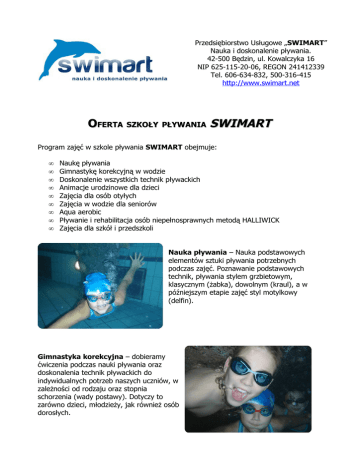 Przedsiębiorstwo Usługowe „SWIMART” Nauka i doskonalenie pływania. 42-500 Będzin, ul. Kowalczyka 16 NIP 625-115-20-06, REGON 241412339 Tel. 606-634-832, 500-316-415 http://www.swimart.net OFERTA SZKOŁY PŁYWANIA SWIMART Program zajęć w szkole pływania SWIMART obejmuje: • • • • • • • • • Naukę pływania Gimnastykę korekcyjną w wodzie Doskonalenie wszystkich technik pływackich Animacje urodzinowe dla dzieci Zajęcia dla osób otyłych Zajęcia w wodzie dla seniorów Aqua aerobic Pływanie i rehabilitacja osób niepełnosprawnych metodą HALLIWICK Zajęcia dla szkół i przedszkoli Nauka pływania – Nauka podstawowych elementów sztuki pływania potrzebnych podczas zajęć. Poznawanie podstawowych technik, pływania stylem grzbietowym, klasycznym (żabka), dowolnym (kraul), a w późniejszym etapie zajęć styl motylkowy (delfin). Gimnastyka korekcyjna – dobieramy ćwiczenia podczas nauki pływania oraz doskonalenia technik pływackich do indywidualnych potrzeb naszych uczniów, w zależności od rodzaju oraz stopnia schorzenia (wady postawy). Dotyczy to zarówno dzieci, młodzieży, jak również osób dorosłych. Pływanie niepełnosprawnych - nasza firma w ramach zajęć w wodzie prowadzi również naukę pływania oraz rehabilitację ruchową dla osób niepełnosprawnych metodą HALLIWICK. Prowadzimy zajęcia dla osób po porażeniu mózgowym, wylewach, urazach rdzenia kręgowego niedowładem kończyn, niewidomych, niedosłyszących, z zespołem Downa oraz osób z chorobami o podłożu psychicznym i neurologicznym. Nauka oraz rehabilitacja prowadzone są w małych grupach lub indywidualnie. Animacje urodzinowe dla dzieci to coraz bardziej popularna forma organizowania zabawy urodzinowej, tak rozpowszechniona w ostatnim okresie w BAWILANDACH i centrach rozrywki Animacje urodzinowe to głównie oferta dla Rodziców, którzy szukają innowacyjnej, oryginalnej i wyjątkowej formy przyjęcia urodzinowego dla swojej Pociechy i Jej przyjaciół. To impreza realizowana w formie zajęć rekreacyjno-sportowych organizowanych w formie WODNEJ ZABAWY, scenerii i charakterze Aquaparku. Gry, zabawy, konkursy na basenach PARKU WODNEGO !!! Aqua Aerobic - (gimnastyka w wodzie) polecany jest jako forma usprawniania, dostępna dla wszystkich bez względu na wiek, poziom sprawności i umiejętności pływackie. Ćwiczenia w wodzie, wykonywane przy muzyce, powodują odciążenie kręgosłupa. Taka gimnastyka przynosi dużo korzystniejsze rezultaty niż ćwiczenia na sali treningowej. Naszą kilkuletnią współpracę prowadzimy z parkiem wodnym NEMO w Dąbrowie Górniczej, kilkudziesięcioma szkołami i przedszkolami na terenie woj. Śląskiego, rodzicami i ich pociechami. Zapraszamy do skorzystania z naszej oferty! Przedsiębiorstwo usługowe „SWIMART”. Wszelkie prawa zastrzeżone.