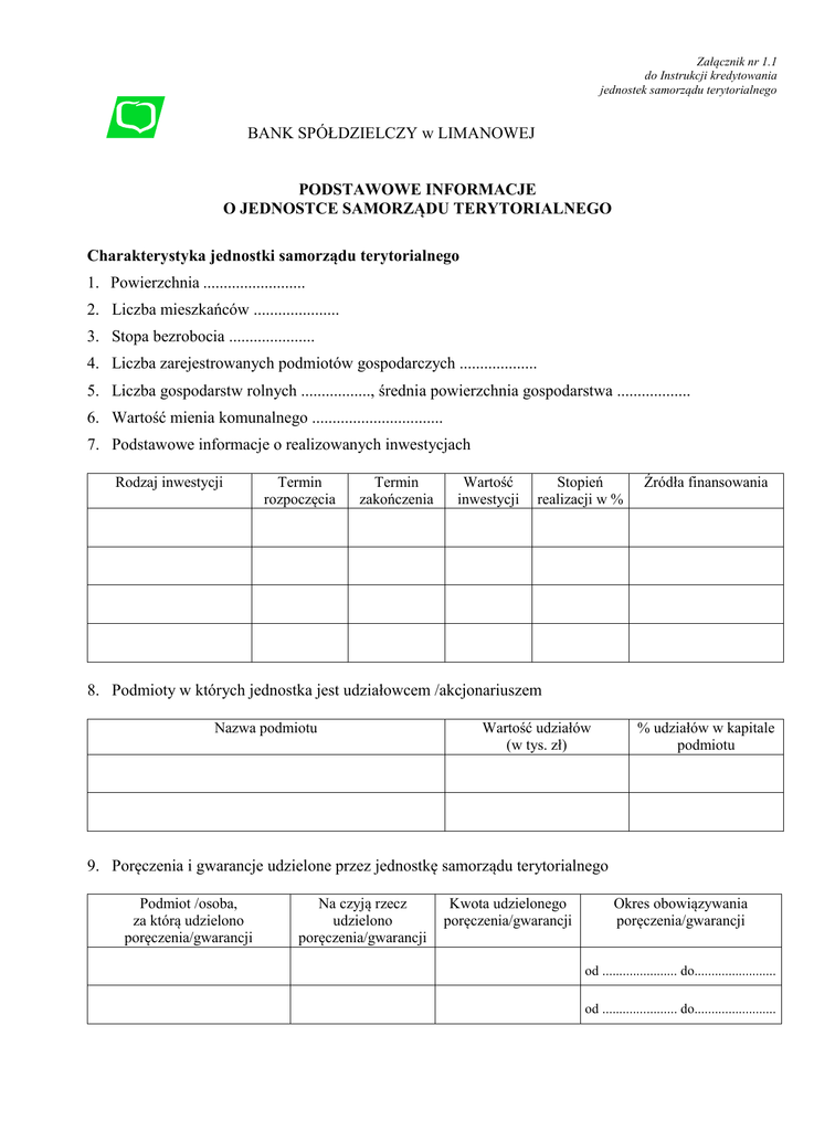 Załącznik nr 1.1 do Instrukcji kredytowania jednostek samorządu terytorialnego BANK SPÓŁDZIELCZY w LIMANOWEJ PODSTAWOWE INFORMACJE O JEDNOSTCE SAMORZĄDU TERYTORIALNEGO Charakterystyka jednostki samorządu terytorialnego 1. Powierzchnia ......................... 2. Liczba mieszkańców ..................... 3. Stopa bezrobocia ..................... 4. Liczba zarejestrowanych podmiotów gospodarczych ................... 5. Liczba gospodarstw rolnych ................., średnia powierzchnia gospodarstwa .................. 6. Wartość mienia komunalnego ................................ 7. Podstawowe informacje o realizowanych inwestycjach Rodzaj inwestycji Termin rozpoczęcia Termin zakończenia Wartość inwestycji Stopień realizacji w % Źródła finansowania 8. Podmioty w których jednostka jest udziałowcem /akcjonariuszem Nazwa podmiotu Wartość udziałów (w tys. zł) % udziałów w kapitale podmiotu 9. Poręczenia i gwarancje udzielone przez jednostkę samorządu terytorialnego Podmiot /osoba, za którą udzielono poręczenia/gwarancji Na czyją rzecz udzielono poręczenia/gwarancji Kwota udzielonego poręczenia/gwarancji Okres obowiązywania poręczenia/gwarancji od ...................... do........................ od ...................... do........................ 10. Należności z tytułu pożyczek udzielonych przez jednostkę samorządu terytorialnego Podmiot/osoba, której udzielono pożyczki Data udzielenia pożyczki Ostateczny termin spłaty pożyczki Kwota udzielonej pożyczki 11. Rachunek bankowy Nazwa banku Numer rachunku 12. Zobowiązania inne niż, z tytułu zaciągniętych kredytów i pożyczek Podmiot wobec którego istnieje zobowiązanie Tytuł zobowiązania Kwota Data powstania Data zobowiązania zobowiązania wygaśnięcia pozostała do spłaty zobowiązania Zabezpieczenia 13. Zobowiązania z tytułu zaciągniętych kredytów i pożyczek należy wypełnić w załączniku nr 1.3, a zobowiązania z tytułu wyemitowanych papierów wartościowych w załączniku nr 1.4. 14. Inne istotne informacje, w tym informacje o zobowiązaniach wymagalnych. .......................................................................................................................................................................................................... .......................................................................................................................................................................................................... .......................................................................................................................................................................................................... ............................................................................................. (Data, pieczęć i podpis Skarbnika/Głównego Księgowego) Uwaga: w przypadku braku miejsca na informacje wymienione we wniosku prosimy o ich podanie w oddzielnym załączniku. 2