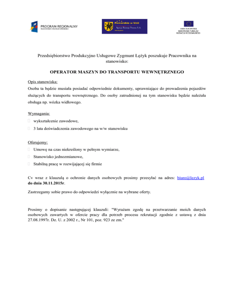 Przedsiębiorstwo Produkcyjno Usługowe Zygmunt Łężyk poszukuje Pracownika na stanowisko: OPERATOR MASZYN DO TRANSPORTU WEWNĘTRZNEGO Opis stanowiska: Osoba ta będzie musiała posiadać odpowiednie dokumenty, uprawniające do prowadzenia pojazdów służących do transportu wewnętrznego. Do osoby zatrudnionej na tym stanowisku będzie należała obsługa np. wózka widłowego. Wymagania: wykształcenie zawodowe, 3 lata doświadczenia zawodowego na w/w stanowisku Oferujemy: Umowę na czas niekreślony w pełnym wymiarze, Stanowisko jednozmianowe, Stabilną pracę w rozwijającej się firmie Cv wraz z klauzulą o ochronie danych osobowych prosimy przesyłać na adres: [email protected] do dnia 30.11.2015r. Zastrzegamy sobie prawo do odpowiedzi wyłącznie na wybrane oferty. Prosimy o dopisanie następującej klauzuli: "Wyrażam zgodę na przetwarzanie moich danych osobowych zawartych w ofercie pracy dla potrzeb procesu rekrutacji zgodnie z ustawą z dnia 27.08.1997r. Dz. U. z 2002 r., Nr 101, poz. 923 ze zm."