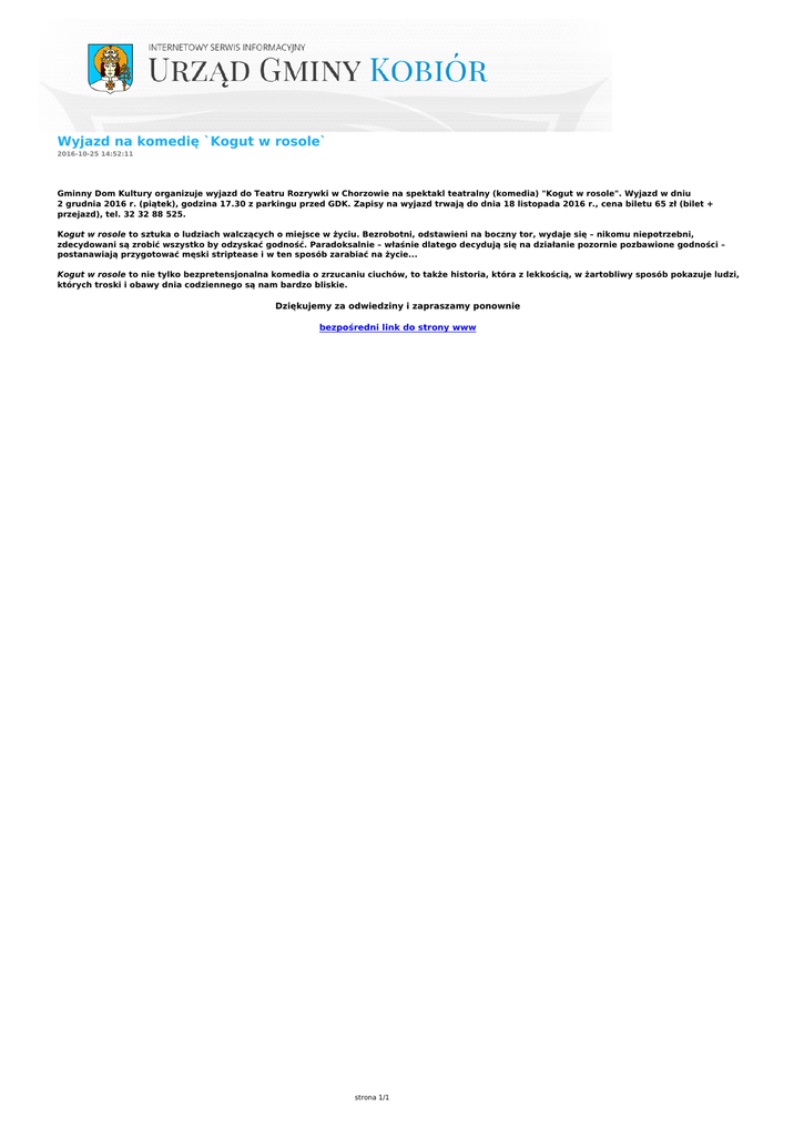 Wyjazd na komedię `Kogut w rosole` 2016-10-25 14:52:11 Gminny Dom Kultury organizuje wyjazd do Teatru Rozrywki w Chorzowie na spektakl teatralny (komedia) "Kogut w rosole". Wyjazd w dniu 2 grudnia 2016 r. (piątek), godzina 17.30 z parkingu przed GDK. Zapisy na wyjazd trwają do dnia 18 listopada 2016 r., cena biletu 65 zł (bilet + przejazd), tel. 32 32 88 525. Kogut w rosole to sztuka o ludziach walczących o miejsce w życiu. Bezrobotni, odstawieni na boczny tor, wydaje się – nikomu niepotrzebni, zdecydowani są zrobić wszystko by odzyskać godność. Paradoksalnie – właśnie dlatego decydują się na działanie pozornie pozbawione godności – postanawiają przygotować męski striptease i w ten sposób zarabiać na życie... Kogut w rosole to nie tylko bezpretensjonalna komedia o zrzucaniu ciuchów, to także historia, która z lekkością, w żartobliwy sposób pokazuje ludzi, których troski i obawy dnia codziennego są nam bardzo bliskie. Dziękujemy za odwiedziny i zapraszamy ponownie bezpośredni link do strony www strona 1/1 Powered by TCPDF (www.tcpdf.org)
