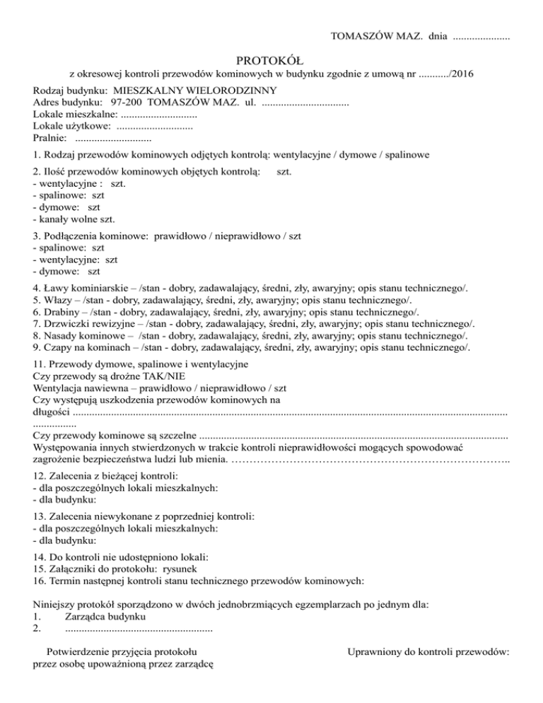 TOMASZÓW MAZ. dnia ..................... PROTOKÓŁ z okresowej kontroli przewodów kominowych w budynku zgodnie z umową nr .........../2016 Rodzaj budynku: MIESZKALNY WIELORODZINNY Adres budynku: 97-200 TOMASZÓW MAZ. ul. ................................ Lokale mieszkalne: ............................ Lokale użytkowe: ............................ Pralnie: ............................ 1. Rodzaj przewodów kominowych odjętych kontrolą: wentylacyjne / dymowe / spalinowe 2. Ilość przewodów kominowych objętych kontrolą: - wentylacyjne : szt. - spalinowe: szt - dymowe: szt - kanały wolne szt. szt. 3. Podłączenia kominowe: prawidłowo / nieprawidłowo / szt - spalinowe: szt - wentylacyjne: szt - dymowe: szt 4. Ławy kominiarskie – /stan - dobry, zadawalający, średni, zły, awaryjny; opis stanu technicznego/. 5. Włazy – /stan - dobry, zadawalający, średni, zły, awaryjny; opis stanu technicznego/. 6. Drabiny – /stan - dobry, zadawalający, średni, zły, awaryjny; opis stanu technicznego/. 7. Drzwiczki rewizyjne – /stan - dobry, zadawalający, średni, zły, awaryjny; opis stanu technicznego/. 8. Nasady kominowe – /stan - dobry, zadawalający, średni, zły, awaryjny; opis stanu technicznego/. 9. Czapy na kominach – /stan - dobry, zadawalający, średni, zły, awaryjny; opis stanu technicznego/. 11. Przewody dymowe, spalinowe i wentylacyjne Czy przewody są drożne TAK/NIE Wentylacja nawiewna – prawidłowo / nieprawidłowo / szt Czy występują uszkodzenia przewodów kominowych na długości ............................................................................................................................................................... ................ Czy przewody kominowe są szczelne ................................................................................................................. Występowania innych stwierdzonych w trakcie kontroli nieprawidłowości mogących spowodować zagrożenie bezpieczeństwa ludzi lub mienia. ………………………………………………………………….. 12. Zalecenia z bieżącej kontroli: - dla poszczególnych lokali mieszkalnych: - dla budynku: 13. Zalecenia niewykonane z poprzedniej kontroli: - dla poszczególnych lokali mieszkalnych: - dla budynku: 14. Do kontroli nie udostępniono lokali: 15. Załączniki do protokołu: rysunek 16. Termin następnej kontroli stanu technicznego przewodów kominowych: Niniejszy protokół sporządzono w dwóch jednobrzmiących egzemplarzach po jednym dla: 1. Zarządca budynku 2. ...................................................... Potwierdzenie przyjęcia protokołu przez osobę upoważnioną przez zarządcę Uprawniony do kontroli przewodów: