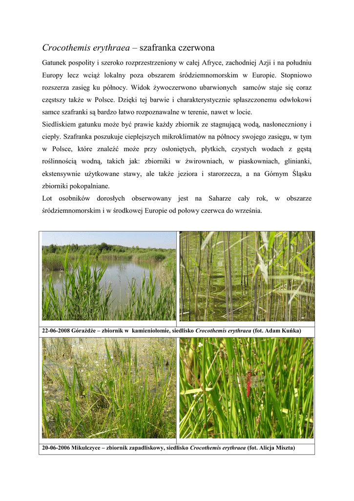 Crocothemis erythraea – szafranka czerwona Gatunek pospolity i szeroko rozprzestrzeniony w całej Afryce, zachodniej Azji i na południu Europy lecz wciąż lokalny poza obszarem śródziemnomorskim w Europie. Stopniowo rozszerza zasięg ku północy. Widok żywoczerwono ubarwionych samców staje się coraz częstszy także w Polsce. Dzięki tej barwie i charakterystycznie spłaszczonemu odwłokowi samce szafranki są bardzo łatwo rozpoznawalne w terenie, nawet w locie. Siedliskiem gatunku może być prawie każdy zbiornik ze stagnującą wodą, nasłoneczniony i ciepły. Szafranka poszukuje cieplejszych mikroklimatów na północy swojego zasięgu, w tym w Polsce, które znaleźć może przy osłoniętych, płytkich, czystych wodach z gęstą roślinnością wodną, takich jak: zbiorniki w żwirowniach, w piaskowniach, glinianki, ekstensywnie użytkowane stawy, ale także jeziora i starorzecza, a na Górnym Śląsku zbiorniki pokopalniane. Lot osobników dorosłych obserwowany jest na Saharze cały rok, w obszarze śródziemnomorskim i w środkowej Europie od połowy czerwca do września. 22-06-2008 Górażdże – zbiornik w kamieniołomie, siedlisko Crocothemis erythraea (fot. Adam Kuńka) 20-06-2006 Mikulczyce – zbiornik zapadliskowy, siedlisko Crocothemis erythraea (fot. Alicja Miszta) IDENTYFIKACJA Cechy ogólne Całkowita długość ciała osobników 36-45mm, samego odwłoka 18-33mm. Młode samce i samice wydają się zupełnie inne niż całkowicie czerwone dojrzałe samce. Są one brązowożółte z bladymi paskami w przedniej i grzbietowej części tułowia (pomiędzy skrzydłami) i często z bardzo cienkimi czarniawymi liniami na odwłoku. Niektóre samice mogą mieć czerwoną barwę ciała przypominającą samce. W każdym wieku skrzydła są przezroczyste, ze sporą bursztynowej barwy plamą u nasady tylnych skrzydeł. Ta plama, szeroki tułów i odwłok, brak czerni na nogach, głowie i tułowiu odróżniają ten gatunek od wszystkich innych (np. od Sympetrum fonscolombii, z którym mogą być mylone przez początkujących obserwatorów, szczególnie przy obserwacji z dalszej odległości i w pozycji bocznej). Zachowanie Samce są terytorialne i agresywnie przeganiają konkurentów z upatrzonego miejsca, rzadko odlatują od brzegów wody, często przysiadają na przybrzeżnych roślinach. Po połączeniu się w tandem z samicą latają wspólnie nad powierzchnią wody, rzadko przysiadając na roślinach. Samice składają jaja samotnie zwykle w miejscach, gdzie jest większe zagęszczenie roślin zanurzonych w wodzie. W naszych warunkach klimatycznych rozwój larw trwa zwykle jeden rok a wylot rozpoczyna się z końcem maja i trwa do końca września, natomiast w południowym zasięgu gatunek ma dwie generacje w ciągu roku. Są doniesienia, że i w Polsce mogą występować lokalnie na południu dwie generacje. Osobniki późno latające we wrześniu mogą być drugą generacją. Warto poszukać wylinek na roślinności przybrzeżnej i przesłać do oznaczenia, ponieważ ich obecność jest dowodem na rodzime występowanie gatunku. Dorosłe samce Crocothemis erythraea (fot. Adam Kuńka) Juwenilne samce Crocothemis erythraea (fot. Adam Kuńka) Samice Crocothemis erythraea (fot. Bogusław Daraż, Adam Kuńka)