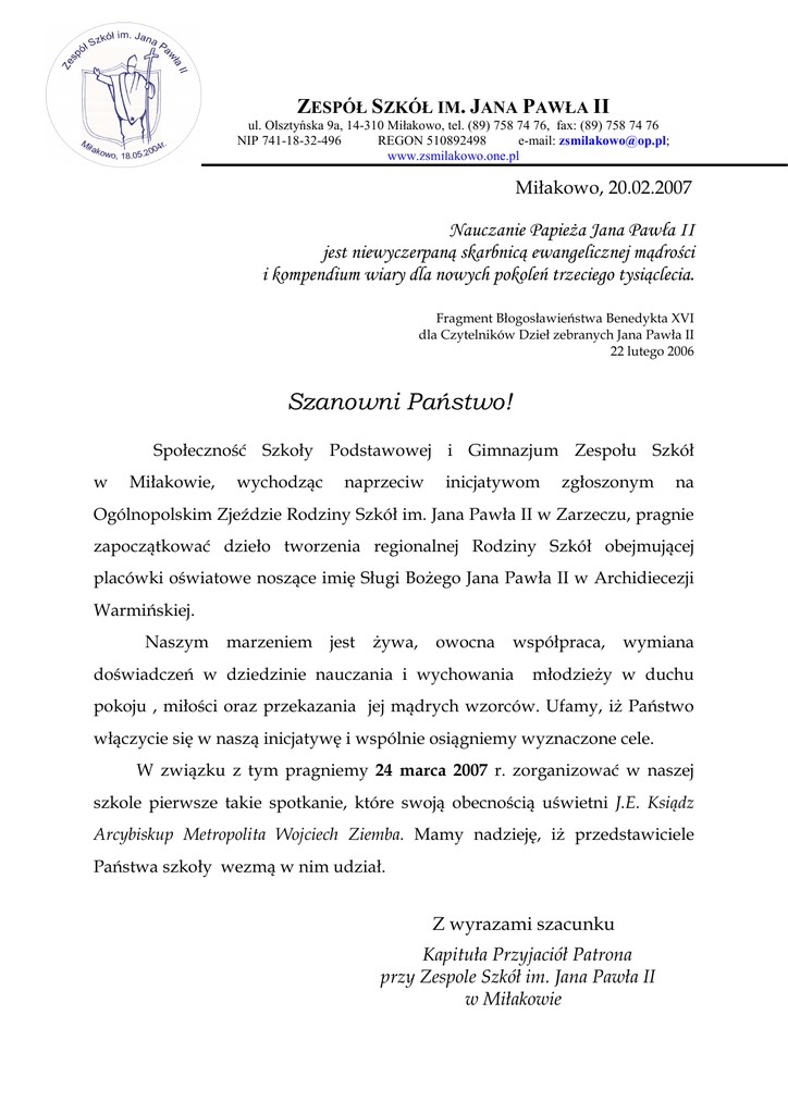 ZESPÓŁ SZKÓŁ IM. JANA PAWŁA II ul. Olsztyńska 9a, 14-310 Miłakowo, tel. (89) 758 74 76, fax: (89) 758 74 76 NIP 741-18-32-496 REGON 510892498 e-mail: [email protected]; www.zsmilakowo.one.pl Miłakowo, 20.02.2007 Nauczanie PapieŜa Jana Pawła II jest niewyczerpaną skarbnicą ewangelicznej mądrości i kompendium wiary dla nowych pokoleń trzeciego tysiąclecia. Fragment Błogosławieństwa Benedykta XVI dla Czytelników Dzieł zebranych Jana Pawła II 22 lutego 2006 Szanowni Państwo! Społeczność Szkoły Podstawowej i Gimnazjum Zespołu Szkół w Miłakowie, wychodząc naprzeciw inicjatywom zgłoszonym na Ogólnopolskim Zjeździe Rodziny Szkół im. Jana Pawła II w Zarzeczu, pragnie zapoczątkować dzieło tworzenia regionalnej Rodziny Szkół obejmującej placówki oświatowe noszące imię Sługi BoŜego Jana Pawła II w Archidiecezji Warmińskiej. Naszym marzeniem jest Ŝywa, owocna współpraca, doświadczeń w dziedzinie nauczania i wychowania wymiana młodzieŜy w duchu pokoju , miłości oraz przekazania jej mądrych wzorców. Ufamy, iŜ Państwo włączycie się w naszą inicjatywę i wspólnie osiągniemy wyznaczone cele. W związku z tym pragniemy 24 marca 2007 r. zorganizować w naszej szkole pierwsze takie spotkanie, które swoją obecnością uświetni J.E. Ksiądz Arcybiskup Metropolita Wojciech Ziemba. Mamy nadzieję, iŜ przedstawiciele Państwa szkoły wezmą w nim udział. Z wyrazami szacunku Kapituła Przyjaciół Patrona przy Zespole Szkół im. Jana Pawła II w Miłakowie