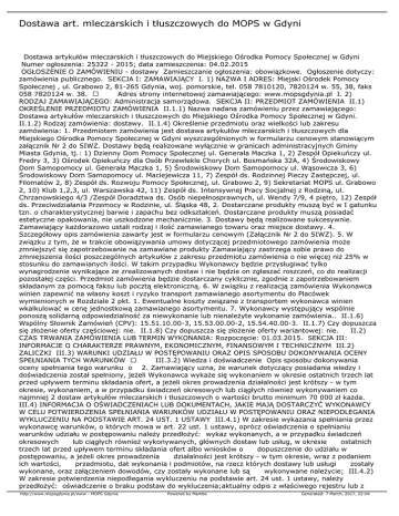 Dostawa art. mleczarskich i tłuszczowych do MOPS w Gdyni Dostawa artykułów mleczarskich i tłuszczowych do Miejskiego Ośrodka Pomocy Społecznej w Gdyni Numer ogłoszenia: 25322 - 2015; data zamieszczenia: 04.02.2015 OGŁOSZENIE O ZAMÓWIENIU - dostawy Zamieszczanie ogłoszenia: obowiązkowe. Ogłoszenie dotyczy: zamówienia publicznego. SEKCJA I: ZAMAWIAJĄCY I. 1) NAZWA I ADRES: Miejski Ośrodek Pomocy Społecznej , ul. Grabowo 2, 81-265 Gdynia, woj. pomorskie, tel. 058 7810120, 7820124 w. 55, 38, faks 058 7820124 w. 38. · Adres strony internetowej zamawiającego: www.mopsgdynia.pl I. 2) RODZAJ ZAMAWIAJĄCEGO: Administracja samorządowa. SEKCJA II: PRZEDMIOT ZAMÓWIENIA II.1) OKREŚLENIE PRZEDMIOTU ZAMÓWIENIA II.1.1) Nazwa nadana zamówieniu przez zamawiającego: Dostawa artykułów mleczarskich i tłuszczowych do Miejskiego Ośrodka Pomocy Społecznej w Gdyni. II.1.2) Rodzaj zamówienia: dostawy. II.1.4) Określenie przedmiotu oraz wielkości lub zakresu zamówienia: 1. Przedmiotem zamówienia jest dostawa artykułów mleczarskich i tłuszczowych dla Miejskiego Ośrodka Pomocy Społecznej w Gdyni wyszczególnionych w formularzu cenowym stanowiącym załącznik Nr 2 do SIWZ. Dostawy będą realizowane wyłącznie w granicach administracyjnych Gminy Miasta Gdynia, tj.: 1) Dzienny Dom Pomocy Społecznej ul. Generała Maczka 1, 2) Zespół Opiekuńczy ul. Fredry 3, 3) Ośrodek Opiekuńczy dla Osób Przewlekle Chorych ul. Bosmańska 32A, 4) Środowiskowy Dom Samopomocy ul. Generała Maczka 1, 5) Środowiskowy Dom Samopomocy ul. Wąsowicza 3, 6) Środowiskowy Dom Samopomocy ul. Maciejewicza 11, 7) Zespół ds. Rodzinnej Pieczy Zastępczej, ul. Filomatów 2, 8) Zespół ds. Rozwoju Pomocy Społecznej, ul. Grabowo 2, 9) Sekretariat MOPS ul. Grabowo 2, 10) Klub 1,2,3, ul. Warszawska 42, 11) Zespół ds. Intensywnej Pracy Socjalnej z Rodziną, ul. Chrzanowskiego 4/3 /Zespół Doradztwa ds. Osób niepełnosprawnych, ul. Wendy 7/9, 4 piętro, 12) Zespół ds. Przeciwdziałania Przemocy w Rodzinie, ul. Śląska 48, 2. Dostarczane produkty muszą być w I gatunku tzn. o charakterystycznej barwie i zapachu bez odkształceń. Dostarczane produkty muszą posiadać estetyczne opakowania, nie uszkodzone mechanicznie. 3. Dostawy będą realizowane sukcesywnie. Zamawiający każdorazowo ustali rodzaj i ilość zamawianego towaru oraz miejsce dostawy. 4. Szczegółowy opis zamówienia zawarty jest w formularzu cenowym (Załącznik Nr 2 do SIWZ). 5. W związku z tym, że w trakcie obowiązywania umowy dotyczącej przedmiotowego zamówienia może zmniejszyć się zapotrzebowanie na zamawiane produkty Zamawiający zastrzega sobie prawo do zmniejszenia ilości poszczególnych artykułów z zakresu przedmiotu zamówienia o nie więcej niż 25% w stosunku do zamawianych ilości. W takim przypadku Wykonawcy będzie przysługiwać tylko wynagrodzenie wynikające ze zrealizowanych dostaw i nie będzie on zgłaszać roszczeń, co do realizacji pozostałej części. Przedmiot zamówienia będzie dostarczany cyklicznie, zgodnie z zapotrzebowaniem składanym za pomocą faksu lub pocztą elektroniczną. 6. W związku z realizacją zamówienia Wykonawca winien zapewnić na własny koszt i ryzyko transport zamawianego asortymentu do Placówek wymienionych w Rozdziale 2 pkt. 1. Ewentualne koszty związane z transportem wykonawca winien wkalkulować w cenę jednostkową zamawianego asortymentu. 7. Wykonawcy występujący wspólnie ponoszą solidarną odpowiedzialność za niewykonanie lub nienależyte wykonanie zamówienia.. II.1.6) Wspólny Słownik Zamówień (CPV): 15.51.10.00-3, 15.53.00.00-2, 15.54.40.00-3. II.1.7) Czy dopuszcza się złożenie oferty częściowej: nie. II.1.8) Czy dopuszcza się złożenie oferty wariantowej: nie. II.2) CZAS TRWANIA ZAMÓWIENIA LUB TERMIN WYKONANIA: Rozpoczęcie: 01.03.2015. SEKCJA III: INFORMACJE O CHARAKTERZE PRAWNYM, EKONOMICZNYM, FINANSOWYM I TECHNICZNYM III.2) ZALICZKI III.3) WARUNKI UDZIAŁU W POSTĘPOWANIU ORAZ OPIS SPOSOBU DOKONYWANIA OCENY SPEŁNIANIA TYCH WARUNKÓW · III.3.2) Wiedza i doświadczenie Opis sposobu dokonywania oceny spełniania tego warunku o 2. Zamawiający uzna, że warunek dotyczący posiadania wiedzy i doświadczenia został spełniony, jeżeli Wykonawca wykaże się wykonaniem w okresie ostatnich trzech lat przed upływem terminu składania ofert, a jeżeli okres prowadzenia działalności jest krótszy - w tym okresie, wykonaniem, a w przypadku świadczeń okresowych lub ciągłych również wykonywaniem co najmniej 2 dostaw artykułów mleczarskich i tłuszczowych o wartości brutto minimum 70 000 zł każda. III.4) INFORMACJA O OŚWIADCZENIACH LUB DOKUMENTACH, JAKIE MAJĄ DOSTARCZYĆ WYKONAWCY W CELU POTWIERDZENIA SPEŁNIANIA WARUNKÓW UDZIAŁU W POSTĘPOWANIU ORAZ NIEPODLEGANIA WYKLUCZENIU NA PODSTAWIE ART. 24 UST. 1 USTAWY III.4.1) W zakresie wykazania spełniania przez wykonawcę warunków, o których mowa w art. 22 ust. 1 ustawy, oprócz oświadczenia o spełnianiu warunków udziału w postępowaniu należy przedłożyć: wykaz wykonanych, a w przypadku świadczeń okresowych lub ciągłych również wykonywanych, głównych dostaw lub usług, w okresie ostatnich trzech lat przed upływem terminu składania ofert albo wniosków o dopuszczenie do udziału w postępowaniu, a jeżeli okres prowadzenia działalności jest krótszy - w tym okresie, wraz z podaniem ich wartości, przedmiotu, dat wykonania i podmiotów, na rzecz których dostawy lub usługi zostały wykonane, oraz załączeniem dowodów, czy zostały wykonane lub są wykonywane należycie; III.4.2) W zakresie potwierdzenia niepodlegania wykluczeniu na podstawie art. 24 ust. 1 ustawy, należy przedłożyć: oświadczenie o braku podstaw do wykluczenia;aktualny odpis z właściwego rejestru lub z http://www.mopsgdynia.pl/www - MOPS Gdynia Powered by Mambo Generated: 7 March, 2017, 22:04 centralnej ewidencji i informacji o działalności gospodarczej, jeżeli odrębne przepisy wymagaj