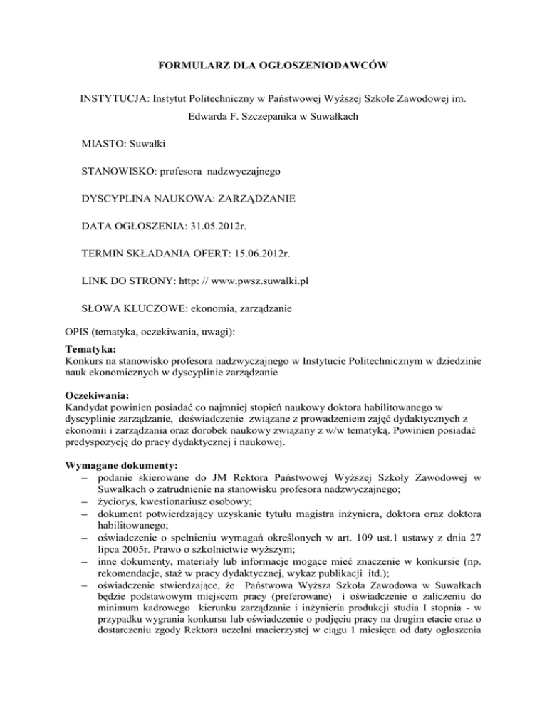FORMULARZ DLA OGŁOSZENIODAWCÓW INSTYTUCJA: Instytut Politechniczny w Państwowej Wyższej Szkole Zawodowej im. Edwarda F. Szczepanika w Suwałkach MIASTO: Suwałki STANOWISKO: profesora nadzwyczajnego DYSCYPLINA NAUKOWA: ZARZĄDZANIE DATA OGŁOSZENIA: 31.05.2012r. TERMIN SKŁADANIA OFERT: 15.06.2012r. LINK DO STRONY: http: // www.pwsz.suwalki.pl SŁOWA KLUCZOWE: ekonomia, zarządzanie OPIS (tematyka, oczekiwania, uwagi): Tematyka: Konkurs na stanowisko profesora nadzwyczajnego w Instytucie Politechnicznym w dziedzinie nauk ekonomicznych w dyscyplinie zarządzanie Oczekiwania: Kandydat powinien posiadać co najmniej stopień naukowy doktora habilitowanego w dyscyplinie zarządzanie, doświadczenie związane z prowadzeniem zajęć dydaktycznych z ekonomii i zarządzania oraz dorobek naukowy związany z w/w tematyką. Powinien posiadać predyspozycję do pracy dydaktycznej i naukowej. Wymagane dokumenty: podanie skierowane do JM Rektora Państwowej Wyższej Szkoły Zawodowej w Suwałkach o zatrudnienie na stanowisku profesora nadzwyczajnego; życiorys, kwestionariusz osobowy; dokument potwierdzający uzyskanie tytułu magistra inżyniera, doktora oraz doktora habilitowanego; oświadczenie o spełnieniu wymagań określonych w art. 109 ust.1 ustawy z dnia 27 lipca 2005r. Prawo o szkolnictwie wyższym; inne dokumenty, materiały lub informacje mogące mieć znaczenie w konkursie (np. rekomendacje, staż w pracy dydaktycznej, wykaz publikacji itd.); oświadczenie stwierdzające, że Państwowa Wyższa Szkoła Zawodowa w Suwałkach będzie podstawowym miejscem pracy (preferowane) i oświadczenie o zaliczeniu do minimum kadrowego kierunku zarządzanie i inżynieria produkcji studia I stopnia - w przypadku wygrania konkursu lub oświadczenie o podjęciu pracy na drugim etacie oraz o dostarczeniu zgody Rektora uczelni macierzystej w ciągu 1 miesięca od daty ogłoszenia wyników konkursu a także oświadczenie o zaliczeniu do minimum kadrowego kierunku zarządzanie i inżynieria produkcji studia I stopnia w przypadku wygrania konkursu. Dokumenty na konkurs na stanowisko profesora nadzwyczajnego (w pełnym wymiarze czasu pracy) w Instytucie Politechnicznym należy składać w Państwowej Wyższej Szkole Zawodowej im. Edwarda F. Szczepanika w Suwałkach, ul. Noniewicza 10 pokój nr 220 w terminie do dnia 15.06.2012r. Rozstrzygnięcie konkursu nastąpi do dnia 20.06.2012 roku.