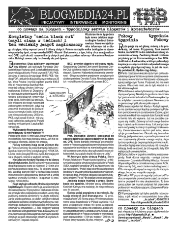 wpisz tylko blogmedia24.pl i zostañ z nami! 8 X 2013 ========================================================================================== 168 co nowego na blogach - tygodniowy serwis blogerów i komentatorów ========================================================================================== Wydarzeniem tygodnia tygodnia Kompletny "media black out" była nowa odsłona zega- Po³owy Po³owy ru długów fundacji Balce- tygodnia (czyli cisza w mediach) i rowicza. Nowa wersja liczten wœciek³y jazgot zag³uszaczy nika informuje też o dłuyba psuje się od głowy, mówią, a tu progu ukrytym, który wynosi ponad 3 biliony złotych. Potem nastapiła walka buldogów na dywanie pomiędzy tymi, co wprowadzali OFE - Buzek i Balcerowicz, a tym, który chce znacjonalizować OFE, czyli ukraść nasze miliardy złotych pod płaszczykiem reformy - Vincentem Rostowskim. Buldogi zawarczały i schowały sie pod dywan. B alcerowicz: Dług publiczny przekroczył trzy biliony! Jak wyliczyła Fundacja Obywatelskiego Rozwoju prof. Leszka Balcerowicza, jawny dług publiczny Polski wynosi 57,3% PKB, ale wraz z częścią ukrytą sięga 193% PKB. Według FOR, aktualnie dług publiczny przekracza 25 tys. zł na Polaka i wynosi ogółem prawie 936,5 mld zł. Nowa wersja licznika informuje też o długu ukrytym, który wynosi ponad 3 biliony zł. Dług ukryty to przyszłe zobowiązania ZUS wobec dzisiejszych emerytów oraz osób, które dziś już pracują. Nie wliczono do niego natomiast zobowiązań rentowych, gdyż są znacznie trudniejsze do policzenia czy emerytur osób, które jeszcze nie rozpoczęli pracy. 250 proc. PKB, czyli ponad 4 bln zł - tyle wynosi całkowite zadłużenie Polski według wyliczeń prof. Leszka Balcerowicza. Wykluczenie finansowe: problem dotyczy 10 mln Polaków. W Polsce żyje około 10 mln ludzi, którzy mają znikome dochody. Nie mają konta w banku, ani nie korzystają z internetu, często nie pracują. Polscy seniorzy mają coraz większe długi. Polscy seniorzy są coraz bardziej zadłużeni wynika z danych firmy windykacyjnej KRUK SA. Liczba osób powyżej 65 roku życia, borykających się z długami, rośnie w szybkim tempie. Niespłacone kredyty hipoteczne to biznes dla windykatorów. Banki wystawiły na sprzedaż długi hipoteczne warte co najmniej 210 mln zł w pierwszej połowie tego roku. To dopiero początek. Według danych NBP z końca lipca kredyty mieszkaniowe gospodarstw domowych z utratą wartości wynosiły 9,8 mld zł. To o ponad 17 proc. więcej niż rok temu. Rząd szykuje całkowitą likwidację emerytur kapitałowych. Eksperci alarmują, że zniechęca to do oszczędzania. W przyszłości czeka nas obniżenie emerytur albo zwiększenie podatków. Jawny dług publiczny zostanie zamieniony na ukryte zobowiązania skarbu państwa, co ułatwi politykom dalsze zadłużanie państwa i zwiększy ryzyko kryzysu nadmiernego zadłużenia i konieczności zmniejszenia emerytur w przyszłości (...). Taki księgowy zabieg nie podniesie wiarygodności Polski, bo w wyniku kryzysu finansowego zobowiązania emerytalne państw znajdują się pod obserwacją władz UE i rynków finansowych - napisali eksperci. BCC: premier ciągnie w dół oceny rządu. Gospodarczy Gabinet Cieni ocenił Business Centre Club działania rządu w mijających trzech miesiącach. Surowo. Najbardziej dostało się premierowi. - Długo szukałem przejawów pozytywnych działań premiera Donalda Tuska. Nie dostrzegłem ich - mówi Marek Goliszewski, prezes BCC. Prof. Staniszkis: Ujawnić i pociągnąć do odpowiedzialności odpowiedzialnych za błędy ws. OFE. Tuska bardziej interesuje go produkowanie w Polsce wyspecjalizowanych pracowników na poziomie techników na niemiecki rynek pracy, niż tworzenie warunków, aby wykształcić nowe pokolenie tak, by rządziło lepiej niż obecne „elity” . W Ameryce znów straszą Polską. Steve Forbes felietonem “Pazerni polscy politycy”, w którym jednocześnie skrytykował socjalistów z Polski i USA, nagłośnił tematykę OFE za Atlantykiem. Ma już następców. “Polski rząd skonfiskował połowę środków w prywatnychfunduszach emerytalnych, by spłacić dług. Przejmie obligacje i zostawi fundusze z akcjami. Po co? By jeszcze więcej pożyczać”. Jesienią będzie trudniej o pracę. Bezrobocie nie spadnie. Minister pracy Władysław Kosiniak-Kamysz ma nadzieję, że nie przekroczy ono 14 procent. Europa wciąż pogrążona z bezrobociu. Sytuacja młodych jest dramatyczna. 12 proc. mieszkańców UE nie ma pracy. Wyrównana sezonowo stopa bezrobocia w Polsce wyniosła 10,3 proc. w sierpniu br. wobec 10,4 proc. w poprzednim miesiącu i 10,3 proc. rok wcześniej, podał unijny urząd statystyczny Eurostat w komunikacie. Liczba bezrobotnych w Polsce wyniosła w tych miesiącach odpowiednio: 1 784 tys. wobec 1 793 tys. W Polsce pracy szukało 26 proc. młodych. 2 R szę, od noska. Przypomnę, Tusk zwolnił Noska, szefa SKW, bo ten załatwił wcześniej wiceministra obrony. Zwolniony Nosek zostanie przytulony przez Komorowskiego w tzw. BBN. Jeśli ktoś szuka dowodów, w którym pałacu były inspiracje usunięcia ministra odpowiedzialnego za wydanie gigantycznej kasy, to już nie musi. Się potwierdziło. Będzie ciąg dalszy... Partia rządząca nakazała dyżurnym politautorytetom podpisanie listu w sprawie zdezawuowania sensu referendum w Warszawie i obrony partyjnej zastępczyni Tuska. Podpisali, bo nie mieli wyboru. Właściwie mieli, ale to było kiedyś no i tak właśnie wybrali. Ten list sam z siebie był śmieszny i nie warto było dopisywać pointy. Niestety druga strona nie chciała być gorsza i w ramach odruchu Pawłowa wyskoczyła z antylistem ze swoimi podpisami. Nie wiem co to za geniusz wymyślił, ale wszystko zepsuł... Był jeszcze jeden list. Kiedy o. Rydzyk ogłosił, że ma zamiar stworzyć kaplicę poświęconą Polakom pomordowanym za ratowanie Żydów, gość nazwiskiem Hartman napisał dość furiacki tekst 