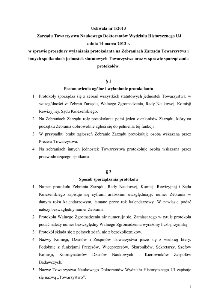 Uchwała nr 1/2013 Zarządu Towarzystwa Naukowego Doktorantów Wydziału Historycznego UJ z dnia 14 marca 2013 r. w sprawie procedury wyłaniania protokolanta na Zebraniach Zarządu Towarzystwa i innych spotkaniach jednostek statutowych Towarzystwa oraz w sprawie sporządzania protokołów. §1 Postanowienia ogólne i wyłanianie protokolanta 1. Protokoły sporządza się z zebrań wszystkich statutowych jednostek Towarzystwa, w szczególności z: Zebrań Zarządu, Walnego Zgromadzenia, Rady Naukowej, Komisji Rewizyjnej, Sądu Koleżeńskiego. 2. Na Zebraniach Zarządu rolę protokolanta pełni jeden z członków Zarządu, który na początku Zebrania dobrowolnie zgłosi się do pełnienia tej funkcji. 3. W przypadku braku zgłoszeń Zebranie Zarządu protokołuje osoba wskazana przez Prezesa Towarzystwa. 4. Na zebraniach innych jednostek Towarzystwa protokołuje osoba wskazana przez przewodniczącego spotkania. §2 Sposób sporządzania protokołu 1. Numer protokołu Zebrania Zarządu, Rady Naukowej, Komisji Rewizyjnej i Sądu Koleżeńskiego zapisuje się cyframi arabskimi uwzględniając numer Zebrania w danym roku kalendarzowym, łamane przez rok kalendarzowy. W nawiasie podać należy bezwzględny numer Zebrania. 2. Protokołu Walnego Zgromadzenia nie numeruje się. Zamiast tego w tytule protokołu podać należy numer bezwzględny Walnego Zgromadzenia wyrażony liczbą rzymską. 3. Protokół składa się z pełnych zdań, nie z bezokoliczników. 4. Nazwy Komisji, Działów i Zespołów Towarzystwa pisze się z wielkiej litery. Podobnie z funkcjami Prezesów, Wiceprezesów, Skarbników, Sekretarzy, Szefów Komisji, Koordynatorów Działów Naukowych i Kierowników Zespołów Badawczych. 5. Nazwę Towarzystwa Naukowego Doktorantów Wydziału Historycznego UJ zapisuje się nazwą „Towarzystwo”. 1 6. Protokół sporządza się w trybie czasu przeszłego. 7. W odniesieniu do głosowań podaje się liczbę głosów za, przeciw i wstrzymujących się – nawet jeśli wyniosły one zero. 8. Podana jest godzina rozpoczęcia i zakończenia obrad. 9. Protokolant dba o poprawność językową protokołu. 10. Protokół sporządza się czcionką Times New Roman, rozmiar 12. 11. Tekst protokołu powinien być wyjustowany. Akapity wprowadza się tabulaturą, a nie spacją. 12. W tekście używa się opcji „numerowanie” i „punktowanie”, nie zaś ręcznego numerowania i ręcznego punktowania. 13. Protokół Zebrania Zarządu sporządza się według wzoru, który stanowi załącznik numer 1 do niniejszej uchwały. 14. Protokół ze spotkań innych jednostek statutowych Towarzystwa się według wzoru, który stanowi załącznik numer 2 do niniejszej uchwały. 15. Nazwę protokołu w postaci dokumentu elektronicznego zapisuje się jak następuje: [data spotkania]_[numer i nazwa spotkania]_protokół. Data zapisywana jest w formacie: rrrr.mm.dd. §3 Tryb zgłaszania poprawek do protokołu Zebrania Zarządu 1. Protokolant po zredagowaniu protokołu zamieszcza jego wstępną wersję w miejscu dostępnym dla pozostałych członków Zarządu (np. siedziba Towarzystwa, lista mailingowa). 2. Protokolant nanosi zgłoszone poprawki za zgodą pozostałych członków Zarządu. §4 Zatwierdzenie protokołu z Zebrania Zarządu 1. Poprawiony protokół z Zebrania Zarządu protokolant zobowiązany jest dostarczyć na kolejne Zebranie Zarządu. 2. Przyjęcie protokołu z poprzedniego Zebrania Zarządu następuje bezpośrednio po wyborze protokolanta. 3. Zatwierdzony przez Zarząd protokół protokolant zobowiązany jest do 10 dni po zatwierdzeniu wydrukować w dwóch egzemplarzach, podpisać i przekazać Sekretarzowi. Oba egzemplarze oprócz protokolanta podpisuje Prezes. Ponadto 2 protokolant sporządza egzemplarz elektroniczny w formacie PDF, który przesyła pozostałym członkom Zarządu drogą elektroniczną. Jeden wydrukowany egzemplarz Sekretarz archiwizuje w siedzibie Towarzystwa, drugi pozostawia tamże do wglądu. 4. Protokoły ze spotkań Rady Naukowej podpisuje protokolant i Wiceprezes ds. Naukowych. Protokoły ze spotkań innych niż Zebranie Zarządu i Rada Naukowa podpisuje protokolant i prowadzący spotkanie. Następnie jak w pkt. 3 § 4. 3 Załącznik nr 1 do Uchwały Zarządu Towarzystwa Naukowego Doktorantów Wydziału Historycznego UJ z dnia 14 marca 2013 r. w sprawie procedury wyłaniania protokolanta na Zebraniach Zarządu Towarzystwa i innych spotkaniach jednostek statutowych Towarzystwa oraz w sprawie sporządzania protokołów. Protokół [nr; np. 1/2013 (2)] Zebrania Zarządu Towarzystwa Naukowego Doktorantów Wydziału Historycznego Uniwersytetu Jagiellońskiego w dniu [dzień, miesiąc rok] roku Kraków, [data sporządzenia protokołu] Posiedzenie Zebrania Zarządu Towarzystwa odbyło się w dniu [dzień miesiąc rok] o godzinie [godzina] w [miejsce, np. w siedzibie TNDWHUJ]. W posiedzeniu uczestniczyli członkowie Towarzystwa w następującym składzie: Członkowie Zarządu: [kolejność: prezes, członkowie Zarządy alfabetycznie; bez numerowania] Goście: [kolejność według piastowanych funkcji, dalej alfabetycznie, bez numerowania] 4 Porządek Obrad: 1. Wybór protokolanta Zebrania Zarządu Towarzystwa. 2. Przyjęcie protokołu z poprzedniego Zebrania Zarządu Towarzystwa. 3. [kolejne punkty porządku obrad] 4. … … Wolne wnioski. … Zamknięcie obrad. Zebranie otworzył/-a o [godzina] [tytuł, imię, nazwisko i funkcja osoby otwierającej posiedzenie]. Ad 1. [treść obrad dotyczących danego punktu. Tekst ciągły. Każdy nowy akapit rozpoczyna się wcięciem] Ad … [Osoba upoważniona do zamknięcia obrad] zamknął/-ęła o [godzina] [numer posiedzenia] Zebranie Zarządu Towarzystwa. Protokołował/-a: [imię i nazwisko protokolanta] 5 Prezes Zarządu: [imię i nazwisko Prezesa Zarządu] [Jeśli występują: Załączniki: 1…. 2….] 6 Załącznik nr 2 do Uchwały Zarządu Towarzystwa Naukowego Doktorantów Wydziału Historycznego UJ z dnia 14 marca 2013 r. w s