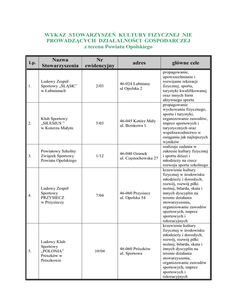 WYKAZ STOWARZYSZEŃ KULTURY FIZYCZNEJ NIE PROWADZĄCYCH DZIAŁALNOŚCI GOSPODARCZEJ z terenu Powiatu Opolskiego Lp. Nazwa Stowarzyszenia Nr ewidencyjny adres 1. Ludowy Zespół Sportowy „ŚLĄSK” w Łubnianach 2/03 46-024 Łubniany ul Opolska 2 2. Klub Sportowy „SILESIUS ” w Kotorzu Małym 5/03 46-045 Kotórz Mały ul. Boiskowa 1 3. Powiatowy Szkolny Związek Sportowy Powiatu Opolskiego 1/12 46-040 Ozimek ul. Częstochowska 27 4. Ludowy Zespół Sportowy PRZYSIECZ w Przysieczy 7/04 46-060 Przysiecz ul. Opolska 54 5. Ludowy Klub Sportowy „POLONIA” Prószków w Prószkowie 10/04 46-060 Prószków ul. Sportowa główne cele propagowanie, upowszechnianie i rozwijanie rekreacji fizycznej, sportu, turystyki kwalifikowanej oraz innych form aktywnego sportu propagowanie wychowania fizycznego, sportu i turystyki, organizowanie zawodów, imprez sportowych i turystycznych oraz współzawodnictwo w osiąganiu jak najlepszych wyników realizuje zadania w zakresie kultury fizycznej i sportu dzieci i młodzieży na rzecz rozwoju sportu szkolnego krzewienie kultury fizycznej w środowisku młodzieży i dorosłych, rozwój, rozwój piłki nożnej, bilarda, skata i innych dyscyplin na terenie działania stowarzyszenia, organizowanie zawodów sportowych, imprez sportowych i rekreacyjnych krzewienie kultury fizycznej w środowisku młodzieży i dorosłych, rozwój, rozwój piłki nożnej, bilarda, skata i innych dyscyplin na terenie działania stowarzyszenia, organizowanie zawodów sportowych, imprez sportowych i rekreacyjnych 6. Klub Skata Sportowego „RAMSCH” w Chrzowicach 1/05 46-060 Chrzowice ul. Opolska 10 7. Ludowy Klub Sportowy „BIZON” Kurznie 2/06 46-090 Popielów ul. Opolska 13 8. Ludowy Klub Sportowy „START” Siołkowice 4/06 46-090 Popielów ul. Opolska 13 9. Ludowy Klub Sportowy POPIELÓW 5/06 46-090 Popielów ul. Opolska 13 10. Ludowy Klub Sportowy „POLONIA” w Karłowicach 6/06 46-090 Popielów ul. Opolska 13 11. Klub Jeździecki „JUMPING TEAM BRYNICA” w Brynicy 1/07 Brynica ul. Łubiańska 25 12. Ludowy Zespół Sportowy w KUP 2/07 46-081 Kup ul. Ligonia 13. Ludowy Zespół Sportowy LUBOSZYCE 3/07 46-022 Luboszyce ul. Opolska 21 Organizowanie i popularyzowanie gry w skata na zasadach sportowych jako racjonalne formy uprawiania sportu i rekreacji Organizowanie i popularyzowanie różnorodnych form uprawiania sportu i rekreacji Organizowanie i popularyzowanie różnorodnych form uprawiania sportu i rekreacji Organizowanie i popularyzowanie różnorodnych form uprawiania sportu i rekreacji Organizowanie i popularyzowanie różnorodnych form uprawiania sportu i rekreacji Prowadzenie działalności wychowawczej i popularyzatorskiej w zakresie jeździectwa, organizowanie nauki jazdy konnej w ramach szkółek jeździeckich, promowanie ekologicznych i korzystnych dla zdrowia aspektów jazdy konnej, zajęcia hipoterapii, prowadzenie hodowli i chowu koni w tym pensjonat koni. Propagowanie i rozwój kultury fizycznej na terenie działania stowarzyszenia ze szczególnym uwzględnieniem problematyki środowiska wiejskiego. Propagowanie i rozwój kultury fizycznej na terenie działania stowarzyszenia ze 14. Ludowy Zespół Sportowy- Fan Club w Żelaznej 6/07 49-120 Żelazna ul. Leśna 10 15. Ludowy Zespół Sportowy w Mechnicach 7/07 46-073 Mechnice ul Strażacka 6a 16. Ludowy Zespół Sportowy LIGOTA TURAWSKA 9/07 46-046 Ligota Turawska ul. Kadłubska 17. Ludowy Zespół Sportowy „Strażak” Węgry 10/07 46-023 Węgry ul. Opolska 11a 18. 1.FC CHRONSTAU – CHRZĄSTOWICE w Chrząstowicach 11/07 46-053 Chrząstowice ul. Ozimska 3a 19. Ludowy Zespół Sportowy ORZEŁ PRĄDY 12/07 49-120 Prądy ul. Niemodlińska 43 20. Ludowy Zespół Sportowy w Dębskiej 13/07 46-053 Dębska Kuźnia szczególnym uwzględnieniem problematyki środowiska wiejskiego. Propagowanie i rozwój kultury fizycznej na terenie działania stowarzyszenia ze szczególnym uwzględnieniem problematyki środowiska wiejskiego. Propagowanie i rozwój kultury fizycznej na terenie działania stowarzyszenia ze szczególnym uwzględnieniem problematyki środowiska wiejskiego. Propagowanie i rozwój kultury fizycznej na terenie działania stowarzyszenia ze szczególnym uwzględnieniem problematyki środowiska wiejskiego. Propagowanie i rozwój kultury fizycznej na terenie działania stowarzyszenia ze szczególnym uwzględnieniem problematyki środowiska wiejskiego. Propagowanie i rozwój kultury fizycznej na terenie działania stowarzyszenia ze szczególnym uwzględnieniem problematyki środowiska wiejskiego. Propagowanie i rozwój kultury fizycznej na terenie działania stowarzyszenia ze szczególnym uwzględnieniem problematyki środowiska wiejskiego. Propagowanie i rozwój kultury fizycznej na Kuźni ul. Ozimska 4 21. Ludowy Zespół Sportowy w Dąbrowie 14/07 49-120 Dąbrowa ul. Ciepielowska 22. Ludowy Zespół Sportowy Stare Budkowice 15/07 46-030 Murów ul. Opolska 23. Ludowy Zespół Sportowy „Unia” Raszowa-Daniec w Dańcu 16/07 46-053 Daniec ul. Dębskiej Kuźni 11 24. Ludowy Zespół Sportowy SKARBISZÓW 18/07 49-120 Skarbiszów ul. Opolska 25. Ludowy Zespół Sportowy KOSOROWICE 19/07 46-050 Kosorowice ul. Opolska 102 26. Ludowy Zespół Sportowy „ODRA” Kąty Opolskie 20/07 46-050 Kąty Opolskie ul. Opolska 102 terenie działania stowarzyszenia ze szczególnym uwzględnieniem problematyki środowiska wiejskiego. Propagowanie i rozwój kultury fizycznej na terenie działania stowarzyszenia ze szczególnym uwzględnieniem problematyki środowiska wiejskiego. Propagowanie i rozwój kultury fizycznej na terenie działania stowarzyszenia ze szczególnym uwzględnieniem problematyki środowiska wiejskiego. Propagowanie i rozwój kultury fizycznej na terenie działania stowarzyszenia ze szczególnym uwzględnieniem problematyki środowiska wiejskiego. Propagowanie i rozwój kultury fizycznej na terenie działania stowarzyszenia ze szczególnym uwzględnieniem problematyki środowiska wiejskiego. Propagowani