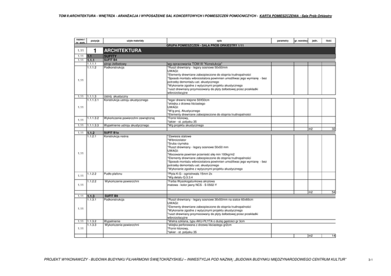 TOM II:ARCHITEKTURA - WNĘTRZA - ARANŻACJA I WYPOSAŻENIE SAL KONCERTOWYCH I POMIESZCZEŃ POMOCNICZYCH - KARTA POMIESZCZENIA : Sala Prób Orkiestry nazwa i nr. pom. pozycja 1.11 1 użyte materiały opis strop żelbetowy wg opracowania TOM III "Konstukcja" Podkonstrukcja *Ruszt drewniany - legary sosnowe 50x50mm UWAGI: *Elementy drewniane zabezpieczone do stopnia trudnopalności *Sposob montażu wibroizolatora powinnien umożlliwac jego wymianę - bez potrzeby demontażu ust. akustycznego *Wykonanie zgodne z wytycznymi projektu akustycznego *ruszt drewniany przymocowany do płyty żelbetowej przez przekładki wibroizolacyjne 1.1.1.3 1.1.1.3.1 Ustrój akustyczny Konstrukcja ustroju akustycznego 1.1.1.3.2 Wykończenie powierzchni zewnętrznej 1.11 1.1.1.3.3 Wypełnienie ustroju akustycznego 1.11 1.1.2 1.1.2.1 SUFIT B1a Konstrukcja nośna 1.1.2.2 Pudło plafonu 1.1.2.2 Wykończenie powierzchni 1.1.3 1.1.3.1 SUFIT B9 Podkonstrukcja 1.1.3.2 1.1.3.3 Wypełnienie Wykończenie powierzchni 1.11 1.11 1.11 1.11 1.11 1.11 1.11 1.11 1.11 ilość SUFITY 1.1.1.1 1.1.1.2 1.11 jedn. ARCHITEKTURA SUFIT B4 1.11 gr. warstwy GRUPA POMIESZCZEŃ - SALA PRÓB ORKIESTRY 1/11 1.1 1.1.1 1.11 1.11 parametry *legar drewno klejone 50X50cm *sklejka z drzewa liściastego UWAGI: *W/g proj. Akustycznego *Elementy drewniane zabezpieczone do stopnia trudnopalności *Fornir klonowy, *lakier - st. połysku 35 *Wg projektu akustycznego m2 32 m2 54 m2 14 *Zawiesia stalowe *Wibroizolator *Sruba rzymska *Ruszt drewniany - legary sosnowe 50x50 mm UWAGI: *Mocowanie powinien przenieść siłę min 100kg/m2 *Elementy drewniane zabezpieczone do stopnia trudnopalności *Sposob montażu wibroizolatora powinnien umożlliwac jego wymianę - bez potrzeby demontażu ust. akustycznego *Wykonanie zgodne z wytycznymi projektu akustycznego *Płyta K-G - ogniotrwała 15mm 2x *Wg detalu Q.3.3.4 *Farba Wysokogatunkowa akrylowa matowa - kolor jasny NCS - S 0502-Y *Ruszt drewniany - legary sosnowe 30x50mm na siatce 60x60cm UWAGI: *Elementy drewniane zabezpieczone do stopnia trudnopalności *Wykonanie zgodne z wytycznymi projektu akustycznego *ruszt drewniany przymocowany do płyty żelbetowej przez przekładki wibroizolacyjne *Wełna szklana, typu AKU-PŁYTA o dużej gęstości gr 3cm *sklejka perforowana z drzewa liściastego gr2cm *Fornir klonowy, *lakier - st. połysku 35 PROJEKT WYKONAWCZY - BUDOWA BUDYNKU FILHARMONII ŚWIĘTOKRZYSKIEJ – INWESTYCJA POD NAZWĄ: „BUDOWA BUDYNKU MIĘDZYNARODOWEGO CENTRUM KULTUR” 3-1 TOM II:ARCHITEKTURA - WNĘTRZA - ARANŻACJA I WYPOSAŻENIE SAL KONCERTOWYCH I POMIESZCZEŃ POMOCNICZYCH - KARTA POMIESZCZENIA : Sala Prób Orkiestry 1.11 1.11 1.2. 1.2.1 ŚCIANY Ściana wydzielająca sale od budynku 1.2.1.1 Izolacja akustyczna *Wełna szklana, typu AKU-PŁYTA o dużej gęstości 1.2.1.2 Ściana murowana 1.2.1.3. Półka systemowa ścian *Cegła pełna rozbiórkowa *Zaprawia cem. - wap *Kotwy stalowe systemowe UWAGI: *Kotwy systemowe w ilości 10 szt/m2 *spoina pełna *Wg projekt konstrukcji UWAGI: *Do zawieszania ścian ceglanych 1.11 1.11 1.11 1.11 1.11 1.11 1.2.2 1.2.2.1 1.2.2.1.1 A>1000 8,0 cm m2 0.00 12,0 cm m2 0.00 komplet 1.00 m2 107 Okładziny ścian C8 Ustrój akustyczny Konstrukcja ustroju akustycznego *W/g proj. akustycznego *Legary z drewna lisciastego UWAGI: *przekładka wibroizolująca między ścianą a konstrukcją *Elementy drewniane zabezpieczone do stopnia trudnopalności *Elementy drewniane mocowane za pomoca klejenia i kołkowania * wg Detalu nr.............. 1.11 1.2.2.1.2 Wypełnienie ustroju akustycznego 1.2.2.1.3 Wykończenie powierzchni zewnętrznej 1.2.2.2 1.2.3.2.1 Dodatkowe wykończenia Cokół 1.11 1.11 1.11 1.11 1.11 1.11 1.11 *dyfuzor ze sklejki drzewa lisciastego *lub welna mineralna *ściśle W/g proj. akustycznego *Sklejka z drzewa liściastego gr. 2cm *Fornir klonowy na froncie ustroju *fornir dębowy wybarwiony na ciemne bejcą (jako referencja Tikkurila 5069 Simes) na bokach pudeł ustrojów akustycznych *Lakier - poł. stopnia 35 UWAGI: *Fornirowana od strony pomieszczenia *Sklejka gr 2cm wysokość 10cm *Fornir klonowy *lakier - st.połysku 35 UWAGI: *Skejka wykończona fornirem klonowym od strony zewnętrznej 1.2.3 Okładziny ścian C9 1.2.3.1 Ustrój akustyczny - konstrukcja *Legar z drzewa klejonego 8x5 cm *przekladka wibroizolacyjna między listwą a warstwą cegły 1.2.3.2 Wypełnienie ustroju akustycznego *Wełna szklana, typu AKU-PŁYTA o dużej gęstości *ściśle W/g proj. akustycznego * 4mm PROJEKT WYKONAWCZY - BUDOWA BUDYNKU FILHARMONII ŚWIĘTOKRZYSKIEJ – INWESTYCJA POD NAZWĄ: „BUDOWA BUDYNKU MIĘDZYNARODOWEGO CENTRUM KULTUR” 3-2 TOM II:ARCHITEKTURA - WNĘTRZA - ARANŻACJA I WYPOSAŻENIE SAL KONCERTOWYCH I POMIESZCZEŃ POMOCNICZYCH - KARTA POMIESZCZENIA : Sala Prób Orkiestry 1.2.3.3 Okładzina 1.2.3.4 1.2.3.4.1 Dodatkowe wykończenia Cokół 1.11 1.11 1.11 1.2.4 1.11 1.2.4.1 1.2.5 1.2.5.1 *Sklejka gr 2cm wysokość 10cm *Fornir klonowy *lakier - st.połysku 35 UWAGI: *Skejka wykończona fornirem klonowym od strony zewnętrznej m2 48 m2 15 kpl 1 Okładziny ścian C16a Wykończenie powierzchni zewnętrznej 1.11 1cm *Sklejka z drzewa liściastego 1cm *Fornir klonowy *Lakier - st.połysku 35 UWAGI: *Fornirowane i lakierowane od strony zewnetrznej *Farba Wysokogatunkowa akrylowa matowa - kolor jasny NCS - S 0502-Y UWAGI: *malowanie dwukrotne muru z cegły rozbiorkowej Zabudowa otworów ściana przesuwna *5 paneli systemowe o szer. 120cm, wys.265cm *2x drzwi dwuskrzydlowe o wymiarach 200 x 210 cm *okucia skrzydła - stal nierdzewna szczotkowana, szyld prostokątny *zawiasy systemowe *Podwójne uszczelki *Mechanizmy wrzecionowe dociskajace do podłogi *zamek systemowy *prowadnica sufitowa aluminiowa *wózek jezdny (dwa wozki na panel) *fornir klonowy *lakier - stopien połysku 35 UWAGI: *konstrukcja panela - korpus z ksztaltowników metalowych i aluminiowych, usztywnienie - trudnozapalna płyta wiórowa 16mm, *wypełnienie - wełna szklana i maty akustyczne *pr