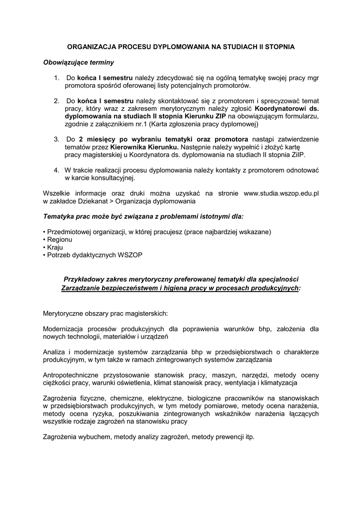 ORGANIZACJA PROCESU DYPLOMOWANIA NA STUDIACH II STOPNIA Obowiązujące terminy 1. Do końca I semestru naleŜy zdecydować się na ogólną tematykę swojej pracy mgr promotora spośród oferowanej listy potencjalnych promotorów. 2. Do końca I semestru naleŜy skontaktować się z promotorem i sprecyzować temat pracy, który wraz z zakresem merytorycznym naleŜy zgłosić Koordynatorowi ds. dyplomowania na studiach II stopnia Kierunku ZIP na obowiązującym formularzu, zgodnie z załącznikiem nr.1 (Karta zgłoszenia pracy dyplomowej) 3. Do 2 miesięcy po wybraniu tematyki oraz promotora nastąpi zatwierdzenie tematów przez Kierownika Kierunku. Następnie naleŜy wypełnić i złoŜyć kartę pracy magisterskiej u Koordynatora ds. dyplomowania na studiach II stopnia ZiIP. 4. W trakcie realizacji procesu dyplomowania naleŜy kontakty z promotorem odnotować w karcie konsultacyjnej. Wszelkie informacje oraz druki moŜna uzyskać na stronie www.studia.wszop.edu.pl w zakładce Dziekanat > Organizacja dyplomowania Tematyka prac moŜe być związana z problemami istotnymi dla: • Przedmiotowej organizacji, w której pracujesz (prace najbardziej wskazane) • Regionu • Kraju • Potrzeb dydaktycznych WSZOP Przykładowy zakres merytoryczny preferowanej tematyki dla specjalności Zarządzanie bezpieczeństwem i higieną pracy w procesach produkcyjnych: Merytoryczne obszary prac magisterskich: Modernizacja procesów produkcyjnych dla poprawienia warunków bhp, załoŜenia dla nowych technologii, materiałów i urządzeń Analiza i modernizacje systemów zarządzania bhp w przedsiębiorstwach o charakterze produkcyjnym, w tym takŜe w ramach zintegrowanych systemów zarządzania Antropotechniczne przystosowanie stanowisk pracy, maszyn, narzędzi, metody oceny cięŜkości pracy, warunki oświetlenia, klimat stanowisk pracy, wentylacja i klimatyzacja ZagroŜenia fizyczne, chemiczne, elektryczne, biologiczne pracowników na stanowiskach w przedsiębiorstwach produkcyjnych, w tym metody pomiarowe, metody ocena naraŜenia, metody ocena ryzyka, poszukiwania zintegrowanych wskaźników naraŜenia łączących wszystkie rodzaje zagroŜeń na stanowisku pracy ZagroŜenia wybuchem, metody analizy zagroŜeń, metody prewencji itp. Prawna ochrona pracy, propozycje zmian na podstawie analizy obowiązujących aktów prawnych dla poprawienia warunków bhp i dostosowania aktów prawnych do realiów określonych przedsiębiorstw produkcyjnych, grup przedsiębiorstw, wytyczne dla instrukcji bhp, procedur itp. Poprawa warunków bezpieczeństwa przy pracach remontowych i w sytuacjach awaryjnych w przedsiębiorstwach produkcyjnych Modelowanie i symulacje w przedsiębiorstwie produkcyjnym dla poprawienia warunków bhp przy zastosowaniu technik informatycznych, systemy wspomagania decyzji, prognozowania Bezpieczeństwo związane z transportem wewnętrznym i magazynowaniem w przedsiębiorstwie produkcyjnym, w tym transport kołowy, przenośniki, suwnice, podnośniki itp. Dopuszcza się takŜe prace w ramach powyŜszych obszarów w innych typach niŜ produkcyjne przedsiębiorstw, takich jak oczyszczalnie ścieków, stacje uzdatniania wody, warsztaty itp. Przykładowy zakres merytoryczny preferowanej tematyki dla specjalności Zarządzanie środowiskiem i gospodarka odpadami: Merytoryczne obszary prac magisterskich: Programowanie rozwoju zrównowaŜonego w gminie, zarządzanie środowiskiem w gminie, programowanie rozwoju lokalnego. Rola i znaczenie rozwiązań organizacyjnych i instytucjonalnych w polityce ekologicznej. Świadomość ekologiczna społeczeństwa. Ekonomia środowiskowa, rachunkowość środowiskowa. Szacowanie strat ekonomicznych powodowanych degradacją kapitału ludzkiego i przyrodniczego. Fundusze ochrony środowiska. Wpływ czynników antropogenicznych na środowisko przyrodnicze, ekologiczne uwarunkowania rozwoju gospodarczego, rekultywacja i rewitalizacja terenów poprzemysłowych. Ochrona przyrody i programy rozwoju obszarów wiejskich. Biocydy w środowisku. Formy korzystania ze środowiska przez podmioty gospodarcze, zarządzanie środowiskiem w przedsiębiorstwie, gospodarka odpadami w zakładach pracy. ZagroŜenia chemiczne i zabezpieczenie przed nimi w przemyśle i transporcie. Oceny oddziaływania działalności gospodarczej na środowisko. Bezpieczeństwo i zarządzanie procesami technologicznymi w oczyszczalniach ścieków, analizy rozwiązań technologicznych i funkcjonalności oczyszczalni ścieków, współczesne rozwiązania technologiczne oczyszczalni ścieków komunalnych i przemysłowych. Problematyka unieszkodliwiania osadów ściekowych. Postępowanie z odpadami, właściwości, odzysk, recykling, unieszkodliwianie. Aspekty techniczno-technologiczne i ekonomiczne wytwarzania paliw alternatywnych z odpadów. Wykorzystanie odpadów tworzyw syntetycznych. Zarządzanie gospodarką odpadami na poszczególnych poziomach administracyjnych. Międzynarodowe przemieszczanie odpadów. Rozprzestrzenianie zanieczyszczeń w atmosferze, monitoring powietrza. Bilans emisji z procesów przemysłowych i komunikacji. Alternatywne źródła energii. Właściwości chemiczne atmosfery obszarów miejskich. Przemysłowe substancje chemiczne jako zagroŜenie dla atmosfery. Przykładowy zakres merytoryczny preferowanej tematyki dla specjalności Zarządzanie Zasobami ludzkimi: Merytoryczne obszary prac magisterskich: Zarządzanie zasobami ludzkimi w kontekście bezpieczeństwa pracy i profilaktyki wypadków Zbadanie jak poszczególne instrumenty polityki personalnej (przyjmowanie do pracy, szkolenia, system motywacyjny, oceny pracownicze.) mogą wpływać na poprawę bezpieczeństwa pracy i profilaktyki wypadków. Istotne, z praktycznego punktu widzenia, jest pytanie czy firmy w ogóle dostrzegają, poza uregulowaniami prawnymi obowiązującymi pracodawców, moŜliwości oddziaływania tzw. „miękkiego” na pracowników, w kwestii szeroko rozumianego bezpieczeństwa pracy oraz jakie miejsce w cał