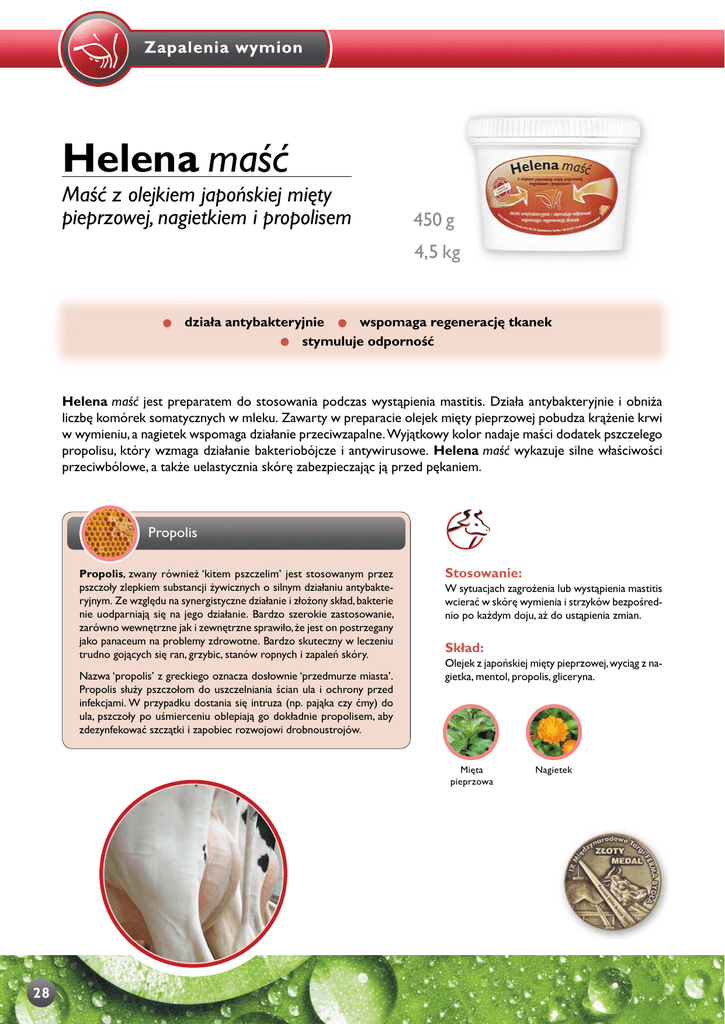 Helena maść Maść z olejkiem japońskiej mięty pieprzowej, nagietkiem i propolisem 450 g 4,5 kg • • działa antybakteryjnie wspomaga regenerację tkanek stymuluje odporność • Helena maść jest preparatem do stosowania podczas wystąpienia mastitis. Działa antybakteryjnie i obniża liczbę komórek somatycznych w mleku. Zawarty w preparacie olejek mięty pieprzowej pobudza krążenie krwi w wymieniu, a nagietek wspomaga działanie przeciwzapalne. Wyjątkowy kolor nadaje maści dodatek pszczelego propolisu, który wzmaga działanie bakteriobójcze i antywirusowe. Helena maść wykazuje silne właściwości przeciwbólowe, a także uelastycznia skórę zabezpieczając ją przed pękaniem. Propolis Propolis, zwany również ‘kitem pszczelim’ jest stosowanym przez pszczoły zlepkiem substancji żywicznych o silnym działaniu antybakteryjnym. Ze względu na synergistyczne działanie i złożony skład, bakterie nie uodparniają się na jego działanie. Bardzo szerokie zastosowanie, zarówno wewnętrzne jak i zewnętrzne sprawiło, że jest on postrzegany jako panaceum na problemy zdrowotne. Bardzo skuteczny w leczeniu trudno gojących się ran, grzybic, stanów ropnych i zapaleń skóry. Nazwa ‘propolis’ z greckiego oznacza dosłownie ‘przedmurze miasta’. Propolis służy pszczołom do uszczelniania ścian ula i ochrony przed infekcjami. W przypadku dostania się intruza (np. pająka czy ćmy) do ula, pszczoły po uśmierceniu oblepiają go dokładnie propolisem, aby zdezynfekować szczątki i zapobiec rozwojowi drobnoustrojów. Stosowanie: W sytuacjach zagrożenia lub wystąpienia mastitis wcierać w skórę wymienia i strzyków bezpośrednio po każdym doju, aż do ustąpienia zmian. Skład: Olejek z japońskiej mięty pieprzowej, wyciąg z nagietka, mentol, propolis, gliceryna. Mięta pieprzowa 28 Nagietek