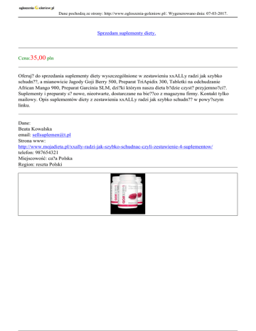 Dane pochodzą ze strony: http://www.ogloszenia-goleniow.pl/. Wygenerowano dnia: 07-03-2017. Sprzedam suplementy diety. Cena:35,00 pln Oferuj? do sprzedania suplementy diety wyszczególnione w zestawieniu xxALLy radzi jak szybko schudn??, a mianowicie Jagody Goji Berry 500, Preparat TriApidix 300, Tabletki na odchudzanie African Mango 900, Preparat Garcinia SLM, dzi?ki którym nasza dieta b?dzie czyst? przyjemno?ci?. Suplementy i preparaty s? nowe, nieotwarte, dostarczane na bie??co z magazynu firmy. Kontakt tylko mailowy. Opis suplementów diety z zestawienia xxALLy radzi jak szybko schudn?? w powy?szym linku. Dane: Beata Kowalska email: [email protected] Strona www: http://www.mojadieta.pl/xxally-radzi-jak-szybko-schudnac-czyli-zestawienie-4-suplementow/ telefon: 987654321 Miejscowość: ca?a Polska Region: reszta Polski