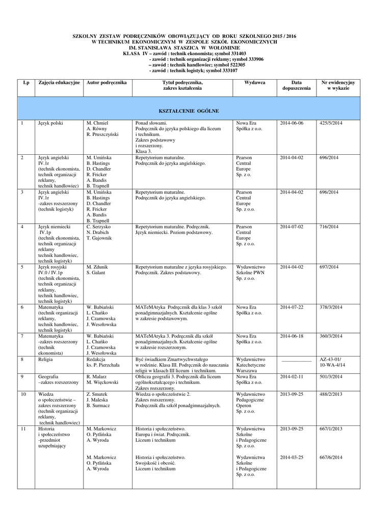 SZKOLNY ZESTAW PODRĘCZNIKÓW OBOWIĄZUJĄCY OD ROKU SZKOLNEGO 2015 / 2016 W TECHNIKUM EKONOMICZNYM W ZESPOLE SZKÓŁ EKONOMICZNYCH IM. STANISŁAWA STASZICA W WOŁOMINIE KLASA IV – zawód : technik ekonomista; symbol 331403 - zawód : technik organizacji reklamy; symbol 333906 – zawód : technik handlowiec; symbol 522305 - zawód : technik logistyk; symbol 333107 Lp Zajęcia edukacyjne Autor podręcznika Tytuł podręcznika, zakres kształcenia Wydawca Data dopuszczenia Nr ewidencyjny w wykazie KSZTAŁCENIE OGÓLNE 1 Język polski M. Chmiel A. Równy R. Pruszczyński 2 Język angielski IV.1r (technik ekonomista, technik organizacji reklamy, technik handlowiec) Język angielski IV.1r -zakres rozszerzony (technik logistyk) M. Umińska B. Hastings D. Chandler R. Fricker A. Bandis B. Trapnell M. Umińska B. Hastings D. Chandler R. Fricker A. Bandis B. Trapnell C. Serzysko N. Drabich T. Gajownik 3 4 5 6 7 8 Język niemiecki IV.1p (technik ekonomista, technik organizacji reklamy technik handlowiec, technik logistyk) Język rosyjski IV.0 / IV.1p (technik ekonomista, technik organizacji reklamy, technik handlowiec, technik logistyk) Matematyka (technik organizacji reklamy, technik handlowiec, technik logistyk) Matematyka -zakres rozszerzony (technik ekonomista) Religia Ponad słowami. Podręcznik do języka polskiego dla liceum i technikum. Zakres podstawowy i rozszerzony. Klasa 3. Repetytorium maturalne. Podręcznik do języka angielskiego. Nowa Era Spółka z o.o. 2014-06-06 425/5/2014 Pearson Central Europe Sp. z o. 2014-04-02 696/2014 Repetytorium maturalne. Podręcznik do języka angielskiego. Pearson Central Europe Sp. z o.o. 2014-04-02 696/2014 Repetytorium maturalne. Podręcznik. Język niemiecki. Poziom podstawowy. Pearson Central Europe Sp. z o.o. 2014-07-02 716/2014 M. Zdunik S. Galant Repetytorium maturalne z języka rosyjskiego. Podręcznik. Zakres podstawowy. Wydawnictwo Szkolne PWN Sp. z o.o. 2014-04-02 697/2014 W. Babiański L. Chańko J. Czarnowska J. Wesołowska MATeMAtyka Podręcznik dla klas 3 szkół ponadgimnazjalnych. Kształcenie ogólne w zakresie podstawowym. Nowa Era Spółka z o.o. 2014-07-22 378/3/2014 W. Babiański L. Chańko J. Czarnowska J. Wesołowska Redakcja ks. P. Pierzchała MATeMAtyka 3. Podręcznik dla szkół ponadgimnazjalnych. Kształcenie ogólne w zakresie rozszerzonym. Nowa Era Spółka z o.o. 2014-06-18 360/3/2014 Wydawnictwo Katechetyczne Warszawa Nowa Era Spółka z o.o. 9 Geografia –zakres rozszerzony R. Malarz M. Więckowski 10 Wiedza o społeczeństwie – zakres rozszerzony (technik organizacji reklamy, technik handlowiec) Historia i społeczeństwo -przedmiot uzupełniający Z. Smutek J. Maleska B. Surmacz Być świadkiem Zmartwychwstałego w rodzinie. Klasa III. Podręcznik do nauczania religii w klasach III liceum i technikum. Oblicza geografii 3. Podręcznik dla liceum ogólnokształcącego i technikum. Zakres rozszerzony. Wiedza o społeczeństwie 2. Zakres rozszerzony. Podręcznik dla szkół ponadgimnazjalnych. M. Markowicz O. Pytlińska A. Wyroda M. Markowicz O. Pytlińska A. Wyroda 11 ____________ AZ-43-01/ 10-WA-4/14 2014-02-11 501/3/2014 Wydawnictwo Pedagogiczne Operon Sp. z o.o. 2013-09-25 488/2/2013 Historia i społeczeństwo. Europa i świat. Podręcznik. Liceum i technikum Wydawnictwa Szkolne i Pedagogiczne Sp. z o.o. 2013-09-25 667/1/2013 Historia i społeczeństwo. Swojskość i obcość. Liceum i technikum Wydawnictwa Szkolne i Pedagogiczne Sp. z o.o. 2014-03-25 667/6/2014 KSZTAŁCENIE ZAWODOWE - TECHNIK EKONOMISTA 12 13 Rachunkowość finansowa Biuro rachunkowe G. Borowska I. Frymark Księgowość i kalkulacja. Część 2 A.36 Wydawnictwa Szkolne i Pedagogiczne Sp. z o.o. 2013 B. Padurek Rachunkowość finansowa. Część III. Produkty pracy i ich sprzedaż. Obrót towarowy. Inwentaryzacja. Źródła finansowania zasobów majątkowych. Pozostała działalność operacyjna. Działalność finansowa. Straty i zyski nadzwyczajne. Wynik finansowy. A.36 (materiał ćwiczeniowy) Biuro rachunkowe. Dokumentacja księgowa. Sprawozdawczość i analiza finansowa. Obsługa programu finansowo- księgowego REWIZOR GT. A.36 (materiał ćwiczeniowy) Wydawnictwo Bożena Padurek _____________ ____________ Wydawnictwo Bożena Padurek _____________ ____________ ____________ ___________ Pracownia rachunkowości. Część 2. Moja firma. A.36 (materiał ćwiczeniowy) Wydawnictwa Szkolne i Pedagogiczne Sp. z o.o. __________ B. Padurek B. Jaworska 62/2013 KSZTAŁCENIE ZAWODOWE - TECHNIK ORGANIZACJI REKLAMY 14 15 16 Elementy prawa, etyki i psychologii w reklamie Organizacja i techniki reklamy Projektowanie kampanii reklamowej ________________ ___________________________________ ______________ _____________ ________________ ___________________________________ ______________ _____________ ________________ ___________________________________ ______________ _____________ __________ __________ KSZTAŁCENIE ZAWODOWE - TECHNIK HANDLOWIEC 17 Marketing w działalności handlowej 18 Język rosyjski w działalności handlowej Język niemiecki w działalności handlowej Symulacyjna firma handlowa 19 20 H. Szulce M. Florek K. Janiszewska T. Żyminkowski ________________ Marketing w działalności gospodarczej A.22 ___________________________________ Wydawnictwa Szkolne i Pedagogiczne Sp. z o.o. ______________ 2013 36/2013 ____________ _______________ _________________ ___________________________________ ______________ ____________ ___________ _________________ ___________________________________ ______________ ____________ ___________ ___________ KSZTAŁCENIE ZAWODOWE - TECHNIK LOGISTYK 21 22 23 24 Logistyka w jednostkach gospodarczych i administracyjnych Język angielski w logistyce Obsługa jednostek zewnętrznych Planowanie przepływu zasobów i informacji _________________ ___________________________________ ______________ ____________ _________________ ___________________________________ ______________ ____________ _________________ ____________________