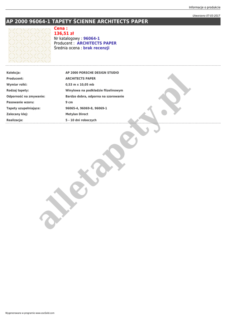 Informacje o produkcie Utworzono 07-03-2017 AP 2000 96064-1 TAPETY ŚCIENNE ARCHITECTS PAPER Cena : 136,51 zł AP 2000 PORSCHE DESIGN STUDIO Producent: ARCHITECTS PAPER Wymiar rolki: 0,53 m x 10,05 mb Rodzaj tapety: Winylowa na podkładzie flizelinowym Odporność na zmywanie: Bardzo dobra, odporna na szorowanie Pasowanie wzoru: 9 cm Tapety uzupełniające: 96065-4, 96069-8, 96069-1 Zalecany klej: Metylan Direct Realizacja: 5 - 10 dni roboczych al le ta pe ty Kolekcja: .p l Nr katalogowy : 96064-1 Producent : ARCHITECTS PAPER Średnia ocena : brak recenzji Wygenerowano w programie www.oscGold.com