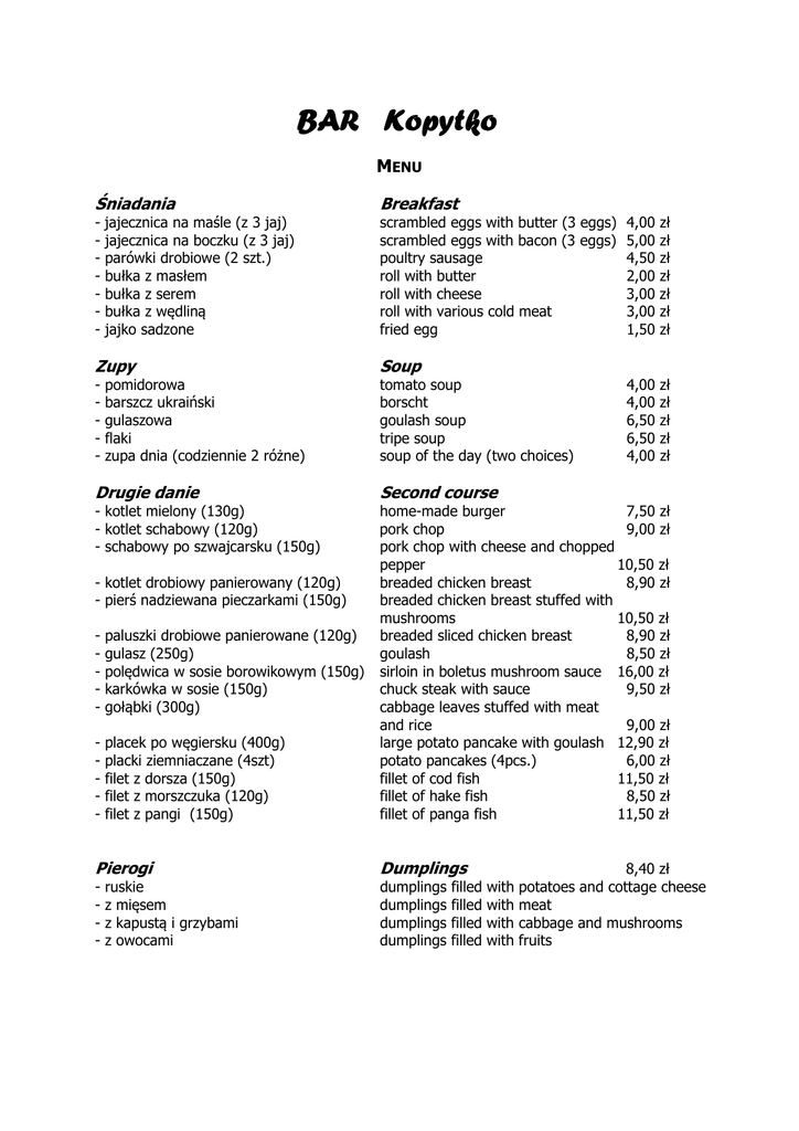 BAR Kopytko MENU Śniadania Breakfast - jajecznica na maśle (z 3 jaj) - jajecznica na boczku (z 3 jaj) - parówki drobiowe (2 szt.) - bułka z masłem - bułka z serem - bułka z wędliną - jajko sadzone scrambled eggs with butter (3 eggs) scrambled eggs with bacon (3 eggs) poultry sausage roll with butter roll with cheese roll with various cold meat fried egg Zupy Soup Drugie danie Second course - pomidorowa barszcz ukraiński gulaszowa flaki zupa dnia (codziennie 2 różne) - kotlet mielony (130g) - kotlet schabowy (120g) - schabowy po szwajcarsku (150g) - kotlet drobiowy panierowany (120g) - pierś nadziewana pieczarkami (150g) - paluszki drobiowe panierowane (120g) gulasz (250g) polędwica w sosie borowikowym (150g) karkówka w sosie (150g) gołąbki (300g) - placek po węgiersku (400g) placki ziemniaczane (4szt) filet z dorsza (150g) filet z morszczuka (120g) filet z pangi (150g) Pierogi - ruskie z mięsem z kapustą i grzybami z owocami tomato soup borscht goulash soup tripe soup soup of the day (two choices) 4,00 5,00 4,50 2,00 3,00 3,00 1,50 zł zł zł zł zł zł zł 4,00 4,00 6,50 6,50 4,00 zł zł zł zł zł home-made burger 7,50 zł pork chop 9,00 zł pork chop with cheese and chopped pepper 10,50 zł breaded chicken breast 8,90 zł breaded chicken breast stuffed with mushrooms 10,50 zł breaded sliced chicken breast 8,90 zł goulash 8,50 zł sirloin in boletus mushroom sauce 16,00 zł chuck steak with sauce 9,50 zł cabbage leaves stuffed with meat and rice 9,00 zł large potato pancake with goulash 12,90 zł potato pancakes (4pcs.) 6,00 zł fillet of cod fish 11,50 zł fillet of hake fish 8,50 zł fillet of panga fish 11,50 zł Dumplings dumplings dumplings dumplings dumplings filled filled filled filled with with with with 8,40 zł potatoes and cottage cheese meat cabbage and mushrooms fruits Dania na słodko: - omlet z sosem śmietanowym i owocami - naleśniki z serem 2 szt. - naleśniki z dżemem 2 szt. Dodatki: - ziemniaki (300g) - kasza gryczana (200g) - ryż (200g) - kopytka (300g) - frytki (150g) Surówki i salatki: - kapusta pekińska (150g) kapusta biała (150g) kapusta kiszona (150g) buraczki czerwone (150g) ogórek kiszony (2szt) marchewka ze śmietaną na słodko (150g) - marchewka z groszkiem (150g) - warzywa gotowane (150g) - kapusta zasmażana (150g) Napoje - kompot (300ml) barszcz (250ml) herbata (200ml) kawa (200ml) kawa Inka (250ml) kakao (250ml) napój (puszka 0,33l) piwo (butelka 0,5l) opakowanie na wynos – 1,00 zł to take-away – 1,00 zł Sweet dishes Omlette with sweet cream and fruits Pancake rolls filled with cheese (2pcs.) Pancake rolls filled with jam (2pcs.) Optional additions potatoes buckwheat rice potato dumplings chips 9,90 zł 7,00 zł 5,90 zł 3,00 3,50 3,50 6,00 4,00 zł zł zł zł zł salad with chinese lettuce salad with white cabbage sauerkraut beetroot gherkin grated carrot in sweet cream 2,90 2,90 2,90 2,90 2,90 2,90 zł zł zł zł zł zł carrot and pea salad steamed vegetables fried cabbage 4,20 zł 4,20 zł 4,20 zł Salads Drinks cold home-made fruit compote hot beetroot drink tea coffee coffee Inka cocoa soft drink (can 0,33l) beer (bottle 0,5l) 1,80 zł 2,50 zł 3,00 zł 4,00 zł 3.00 zł 3.00 zł 3.00 zł 5,00 zł