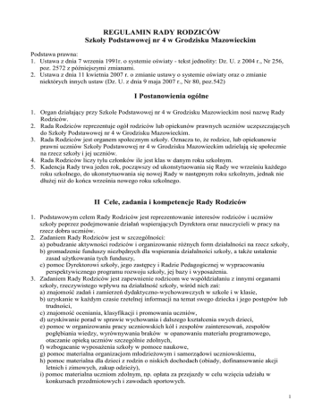 REGULAMIN RADY RODZICÓW Szkoły Podstawowej nr 4 w Grodzisku Mazowieckim Podstawa prawna: 1. Ustawa z dnia 7 wrzenia 1991r. o systemie oświaty - tekst jednolity: Dz. U. z 2004 r., Nr 256, poz. 2572 z późniejszymi zmianami. 2. Ustawa z dnia 11 kwietnia 2007 r. o zmianie ustawy o systemie oświaty oraz o zmianie niektórych innych ustaw (Dz. U. z dnia 9 maja 2007 r., Nr 80, poz.542) I Postanowienia ogólne 1. Organ działający przy Szkole Podstawowej nr 4 w Grodzisku Mazowieckim nosi nazwę Rady Rodziców. 2. Rada Rodziców reprezentuje ogół rodziców lub opiekunów prawnych uczniów uczęszczających do Szkoły Podstawowej nr 4 w Grodzisku Mazowieckim. 3. Rada Rodziców jest organem społecznym szkoły. Oznacza to, że rodzice, lub opiekunowie prawni uczniów Szkoły Podstawowej nr 4 w Grodzisku Mazowieckim udzielają się społecznie na rzecz szkoły i jej uczniów. 4. Rada Rodziców liczy tylu członków ile jest klas w danym roku szkolnym. 5. Kadencja Rady trwa jeden rok, począwszy od ukonstytuowania się Rady we wrześniu każdego roku szkolnego, do ukonstytuowania się nowej Rady w następnym roku szkolnym, jednak nie dłużej niż do końca września nowego roku szkolnego. II Cele, zadania i kompetencje Rady Rodziców 1. Podstawowym celem Rady Rodziców jest reprezentowanie interesów rodziców i uczniów szkoły poprzez podejmowanie działań wspierających Dyrektora oraz nauczycieli w pracy na rzecz dobra uczniów. 2. Zadaniem Rady Rodziców jest w szczególności: a) pobudzanie aktywności rodziców i organizowanie różnych form działalności na rzecz szkoły, b) gromadzenie funduszy niezbędnych dla wspierania działalności szkoły, a także ustalenie zasad użytkowania tych funduszy, c) pomoc Dyrektorowi szkoły, jego zastępcy i Radzie Pedagogicznej w wypracowaniu perspektywicznego programu rozwoju szkoły, jej bazy i wyposażenia. 3. Zadaniem Rady Rodziców jest zapewnienie rodzicom we współdziałaniu z innymi organami szkoły, rzeczywistego wpływu na działalność szkoły, wśród nich zaś: a) znajomość zadań i zamierzeń dydaktyczno-wychowawczych w szkole i w klasie, b) uzyskanie w każdym czasie rzetelnej informacji na temat swego dziecka i jego postępów lub trudności, c) znajomość oceniania, klasyfikacji i promowania uczniów, d) uzyskiwanie porad w sprawie wychowania i dalszego kształcenia swych dzieci, e) pomoc w organizowaniu pracy uczniowskich kół i zespołów zainteresowań, zespołów pogłębiania wiedzy, wyrównywania braków w opanowaniu materiału programowego, otaczanie opieką uczniów szczególnie zdolnych, f) wzbogacanie wyposażenia szkoły w pomoce naukowe, g) pomoc materialna organizacjom młodzieżowym i samorządowi uczniowskiemu, h) pomoc materialna dla dzieci z rodzin o niskich dochodach (obiady, dofinansowanie akcji letnich i zimowych, zakup odzieży), i) pomoc materialna uczniom zdolnym, np. opłata za przejazdy w celu wzięcia udziału w konkursach przedmiotowych i zawodach sportowych. 1 4. Do kompetencji Rady Rodziców należy : a) uchwalanie w porozumieniu z Radą Pedagogiczną programu wychowawczego szkoły i programu profilaktyki , b) opiniowanie programu poprawy efektywności wychowania i kształcenia, c) opiniowanie szkolnego zestawu programów nauczania i szkolnego zestawu podręczników, d) opiniowanie projektu planu finansowego szkoły. e) występowanie do Dyrektora i innych organów szkoły,organu prowadzącego szkołę oraz organu sprawującego nadzór pedagogiczny z wnioskami i opiniami we wszystkich sprawach szkoły, f) wyrażanie opinii przy ocenie dorobku zawodowego nauczyciela stażysty, kontraktowego i mianowanego za okres stażu, g) wnioskowanie o dokonanie oceny pracy nauczyciela h) udział w pracach komisji konkursowej wyłaniającej kandydata na stanowisko dyrektora szkoły. III Organizacja działania Rady Rodziców. 1. Podstawowym ogniwem organizacyjnym ogółu rodziców szkoły jest zebranie rodziców klasy. 2. Zebranie rodziców wybiera spośród siebie w głosowaniu jawnym klasową Radę Rodziców, składającą się co najmniej z trzech osób. W przypadkach koniecznych może zostać zarządzone głosowanie tajne. Zgłoszeni kandydaci muszą wyrazić ustnie lub pisemnie (jeśli nie mogą wziąć udziału w zebraniu wyborczym) swoją zgodę na kandydowanie. 3. Na pierwszym zebraniu rodziców w każdym roku szkolnym wybiera się również w głosowaniu jawnym lub tajnym przedstawiciela rodziców, który będzie reprezentował daną klasę w szkolnej Radzie Rodziców. W skład szkolnej Rady Rodziców wchodzi po jednym przedstawicielu Rad klasowych. 4. Przebieg wyborów: - powołanie komisji do przeprowadzenia wyborów - ustalenie przez komisję listy obecności i stwierdzenie prawomocności zebrania, - przypomnienie zasad wyborczych oraz ustalenie przez komisję listy kandydatów, - głosowanie, - ogłoszenie wyników wyborów przez przewodniczącego komisji. - wybrani zostają ci kandydaci, którzy uzyskali 50% plus 1 głos uczestników prawomocnego zebrania wyborczego. -przy równej ilości uzyskanych głosów zarządza się ponowne głosowanie. 5. Nowo wybrani członkowie szkolnej Rady Rodziców mają obowiązek ukonstytuowania się na pierwszym swoim zebraniu. 6. Ustala się następujący porządek obrad pierwszego zebrania szkolnej Rady Rodziców: -wybór nowego prezydium Rady Rodziców -wybór Komisji Rewizyjnej -informacja Dyrektora szkoły o stanie organizacyjnym i funkcjonowaniu placówki, -przyjęcie Preliminarza wydatków Rady Rodziców na obecny rok szkolny. -ewentualne wystąpienie zaproszonych przedstawicieli innych organów szkoły lub organizacji, -plenarna dyskusja programowa, -wolne głosy i wnioski. 7. Prezydium Rady Rodziców składa się z przewodniczącego, wiceprzewodniczącego, sekretarza i skarbnika. 8. Komisja rewizyjna składa się z co najmniej 3, ale nie więcej niż 5 osób. Co najmniej jeden członek komisji powinien być zorientowany w przepisach prawa finansowego i ra