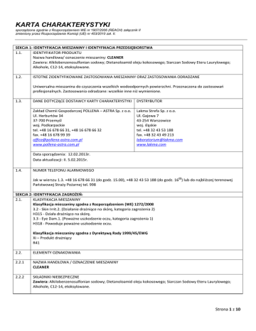 KARTA CHARAKTERYSTYKI sporządzona zgodnie z Rozporządzeniem WE nr 1907/2006 (REACH) załącznik II zmieniony przez Rozporządzenie Komisji (UE) nr 453/2010 zał. II. SEKCJA 1: IDENTYFIKACJA MIESZANINY I IDENTYFIKACJA PRZEDSIĘBIORSTWA 1.1. IDENTYFIKATOR PRODUKTU Nazwa handlowa/ oznaczenie mieszaniny: CLEANER Zawiera: Alkilobenzenosulfonian sodowy; Dietanoloamid oleju kokosowego; Siarczan Sodowy Eteru Laurylowego; Alkohole, C12-14, etoksylowane. 1.2. ISTOTNE ZIDENTYFIKOWANE ZASTOSOWANIA MIESZANINY ORAZ ZASTOSOWANIA ODRADZANE Uniwersalna mieszanina do czyszczenia wszelkich wodoodpornych powierzchni. Przeznaczona do zastosowań profesjonalnych. Zastosowania odradzane: wszelkie inne niż wymienione. 1.3. DANE DOTYCZĄCE DOSTAWCY KARTY CHARAKTERYSTYKI DYSTRYBUTOR Zakład Chemii Gospodarczej POLLENA – ASTRA Sp. z o.o. Ul. Herburtów 34 37-700 Przemyśl woj. Podkarpackie tel. +48 16 678 66 31, +48 16 678 66 32 fax. +48 16 678 99 39 [email protected] www.pollena-astra.com.pl Lakma Strefa Sp. z o.o. Ul. Gajowa 7 43-254 Warszowice woj. śląskie tel. +48 32 43 53 188 fax. +48 32 43 49 213 [email protected] www.lakma.com Data sporządzenia: 12.02.2013r. Data aktualizacji: II. 5.02.2015r. 1.4. NUMER TELEFONU ALARMOWEGO 00 Jak w wierszu 1.3. +48 16 678 66 31 (do godz. 15.00), +48 32 43 53 188 (do godz. 16 ) lub do najbliższej terenowej Państwowej Straży Pożarnej tel. 998 SEKCJA 2: IDENTYFIKACJA ZAGROŻEŃ: 2.1. KLASYFIKACJA MIESZANINY Klasyfikacja mieszaniny zgodna z Rozporządzeniem (WE) 1272/2008 3.2 - Skin Irrit.2. (Działanie drażniące na skórę, kategoria zagrożenia 2) H315 - Działa drażniąco na skórę. 3.3 - Eye Dam.1. (Poważne uszkodzenie oczu, kategoria zagrożenia 1) H318 - Powoduje poważne uszkodzenie oczu. Klasyfikacja mieszaniny zgodna z Dyrektywą Rady 1999/45/EWG Xi – Produkt drażniący R41 2.2. ELEMENTY OZNAKOWANIA 2.2.1 NAZWA HANDLOWA / OZNACZENIE MIESZANINY CLEANER 2.2.2 SKŁADNIKI NIEBEZPIECZNE Zawiera: Alkilobenzenosulfonian sodowy; Dietanoloamid oleju kokosowego; Siarczan Sodowy Eteru Laurylowego; Alkohole, C12-14, etoksylowane. Strona 1 z 10 KARTA CHARAKTERYSTYKI sporządzona zgodnie z Rozporządzeniem WE nr 1907/2006 (REACH) załącznik II zmieniony przez Rozporządzenie Komisji (UE) nr 453/2010 zał. II. 2.2.3 SYMBOLE, ZWROTY I NAPISY OSTRZEGAWCZE Piktogramy: Hasło ostrzegawcze: Niebezpieczeństwo Zwroty wskazujące rodzaj zagrożenia: H315 - Działa drażniąco na skórę. H318 - Powoduje poważne uszkodzenie oczu. Zwroty wskazujące środki ostrożności: P264 – Dokładnie umyć ręce po użyciu. P280 - Stosować rękawice ochronne/ochronę oczu/ochronę twarzy. P302+P352 - W PRZYPADKU KONTAKTU ZE SKÓRĄ: Umyć dużą ilością wody z mydłem. P332+P313 – W przypadku wystąpienia podrażnienia skóry: Zasięgnąć porady/zgłosić się pod opiekę lekarza. P305+P351+P338 – W PRZYPADKU DOSTANIA SIĘ DO OCZU: Ostrożnie płukać wodą przez kilka minut. Wyjąć soczewki kontaktowe, jeżeli są i można je łatwo usunąć. Nadal płukać. P310 – Natychmiast skontaktować się z OŚRODKIEM ZATRUĆ lub lekarzem. Napisy dodatkowe: Produkt przeznaczony do użytku profesjonalnego. 2.3. INNE ZAGROŻENIA Mieszanina nie spełnia kryteriów klasyfikacji PBT i vPvB wymienionych w załączniku XIII Rozporządzenia REACH. Inne nieodzwierciedlone w klasyfikacji zagrożenia: Nieznane . SEKCJA 3: SKŁAD/INFORMACJA O SKŁADNIKACH 3.2 MIESZANINY NIEBEZPIECZNE SKŁADNIKI MIESZANINY WG ROZPORZĄDZENIA (WE) 1272/2008 Nazwa substancji/ INCI Nr indeksowy Nr WE Nr CAS Nr rejestru % wagowy Klasa Zwroty H name zagrożenia Alkilobenzenosulfonian sodowy, INCI name: Sodium Dodecylobenzenesulfonate - 270-115-0 68411-30-3 01211948942822-0003 2,0-6,0 3.3- Eye Dam. 1, H318, Dietanoloamid oleju kokosowego, INCI name; Cocamide DEA Siarczan Sodowy Eteru Laurylowego INCI name: Sodium Laureth Sulfate - 271-657-0 68603-42-9 - 1,5-4,0 H315, H318, - 500-234-8 68891-38-3 01211948863916-xxxx 1,0-2,5 Alkohole, C12-14, etoksylowane, INCI name: Laureth-10 - polimer 6540-99-4 - 1,0-2,0 3.2-Skin Irrit 2, 3.3-Eye Dam.1, 3.2-Skin Irrit. 2, 3.3-Eye Dam. 1, 4.1–Aquatic Chronic 3, 3.1-Acute Tox. 4, 3.3-Eye Dam. 1, Symbole Zwroty R Nazwa substancji/ INCI NIEBEZPIECZNE SKŁADNIKI MIESZANINY WG DYREKTYWY 67/548 /EWG Nr indeksowy Nr WE Nr CAS Nr rejestru % wagowy H315, H318, H412 H302, H318, Strona 2 z 10 KARTA CHARAKTERYSTYKI sporządzona zgodnie z Rozporządzeniem WE nr 1907/2006 (REACH) załącznik II zmieniony przez Rozporządzenie Komisji (UE) nr 453/2010 zał. II. name zagrożenia Alkilobenzenosulfonian sodowy, INCI name: Sodium Dodecylobenzenesulfonate - 270-115-0 Dietanoloamid oleju kokosowego, INCI name: Cocamide DEA Siarczan Sodowy Eteru Laurylowego INCI name: Sodium Laureth Sulfate Alkohole, C12-14, etoksylowane, INCI name: Laureth-10 - 271-657-0 - - 68411-30-3 01211948942822-0003 2,0-6,0 Xn, Xi, Xi, R22, R38, R41, 68603-42-9 - 1,5-4,0 Xi, R38, R41, 500-234-8 68891-38-3 01211948863916-xxxx 1,0-2,5 Xi, R41, R38 polimer 6540-99-4 - 1,0-2,0 Xn, Xi, R22, R41, Pełny tekst klas zagrożeń, symboli zagrożeń, zwrotów R i zwrotów H jak powyżej podano w sekcji 16. SEKCJA 4: ŚRODKI PIERWSZEJ POMOCY 4.1. OPIS ŚRODKÓW PIERWSZEJ POMOCY Uwagi ogólne: Natychmiast wyprowadzić poszkodowanego na świeże powietrze. W przypadku wystąpienia jakichkolwiek niepokojących objawów wezwać natychmiast lekarza lub odwieźć poszkodowanego do szpitala, pokazać opakowanie preparatu lub etykietę. Wdychanie: W przypadku zatrzymania oddechu zastosować sztuczne oddychanie. Zapewnić poszkodowanemu ciepło i warunki do odpoczynku. Wezwać natychmiast pomoc medyczną. Skóra: Zdjąć skażoną odzież. Natychmiast umyć skórę dużą ilością letniej wody, najlepiej bieżącej. W przypadku podrażnienia skóry (zaczerwienienie) skonsultować się natychmiast z lekarzem. Oczy: Zdjąć szkła kontaktowe. Natychmiast przemywać oczy dużą ilością letniej wody - co najmniej 15 min. (przy odwiniętych powieka
