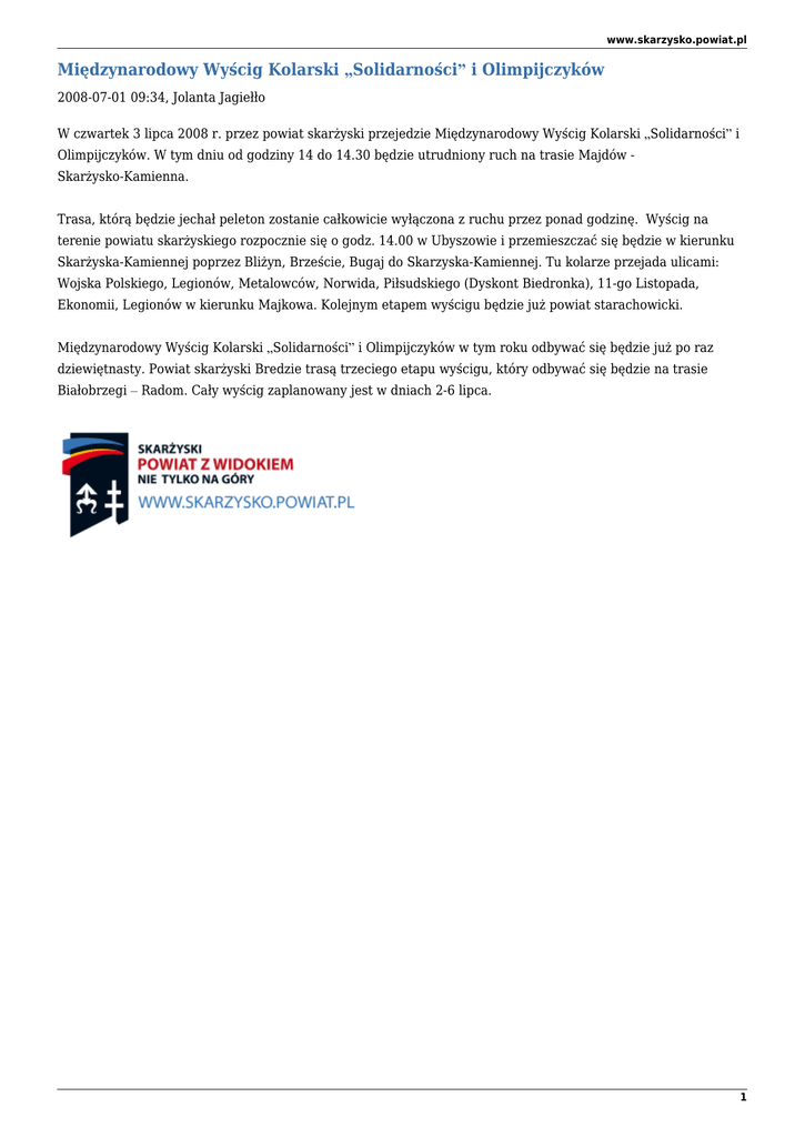 www.skarzysko.powiat.pl Międzynarodowy Wyścig Kolarski „Solidarności” i Olimpijczyków 2008-07-01 09:34, Jolanta Jagiełło W czwartek 3 lipca 2008 r. przez powiat skarżyski przejedzie Międzynarodowy Wyścig Kolarski „Solidarności” i Olimpijczyków. W tym dniu od godziny 14 do 14.30 będzie utrudniony ruch na trasie Majdów Skarżysko-Kamienna. Trasa, którą będzie jechał peleton zostanie całkowicie wyłączona z ruchu przez ponad godzinę. Wyścig na terenie powiatu skarżyskiego rozpocznie się o godz. 14.00 w Ubyszowie i przemieszczać się będzie w kierunku Skarżyska-Kamiennej poprzez Bliżyn, Brzeście, Bugaj do Skarzyska-Kamiennej. Tu kolarze przejada ulicami: Wojska Polskiego, Legionów, Metalowców, Norwida, Piłsudskiego (Dyskont Biedronka), 11-go Listopada, Ekonomii, Legionów w kierunku Majkowa. Kolejnym etapem wyścigu będzie już powiat starachowicki. Międzynarodowy Wyścig Kolarski „Solidarności” i Olimpijczyków w tym roku odbywać się będzie już po raz dziewiętnasty. Powiat skarżyski Bredzie trasą trzeciego etapu wyścigu, który odbywać się będzie na trasie Białobrzegi – Radom. Cały wyścig zaplanowany jest w dniach 2-6 lipca. 1