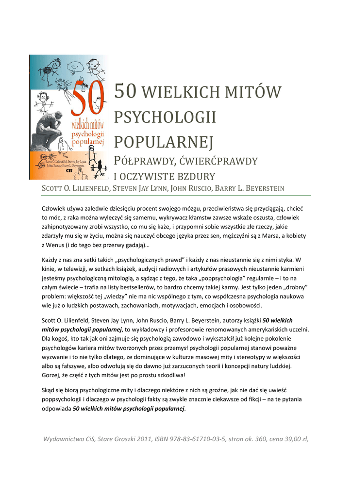 50 WIELKICH MITÓW PSYCHOLOGII POPULARNEJ PÓŁPRAWDY, ĆWIERĆPRAWDY I OCZYWISTE BZDURY SCOTT O. LILIENFELD, STEVEN JAY LYNN, JOHN RUSCIO, BARRY L. BEYERSTEIN Człowiek używa zaledwie dziesięciu procent swojego mózgu, przeciwieństwa się przyciągają, chcieć to móc, z raka można wyleczyć się samemu, wykrywacz kłamstw zawsze wskaże oszusta, człowiek zahipnotyzowany zrobi wszystko, co mu się każe, i przypomni sobie wszystkie złe rzeczy, jakie zdarzyły mu się w życiu, można się nauczyć obcego języka przez sen, mężczyźni są z Marsa, a kobiety z Wenus (i do tego bez przerwy gadają)… Każdy z nas zna setki takich „psychologicznych prawd” i każdy z nas nieustannie się z nimi styka. W kinie, w telewizji, w setkach książek, audycji radiowych i artykułów prasowych nieustannie karmieni jesteśmy psychologiczną mitologią, a sądząc z tego, że taka „poppsychologia” regularnie – i to na całym świecie – trafia na listy bestsellerów, to bardzo chcemy takiej karmy. Jest tylko jeden „drobny” problem: większość tej „wiedzy” nie ma nic wspólnego z tym, co współczesna psychologia naukowa wie już o ludzkich postawach, zachowaniach, motywacjach, emocjach i osobowości. Scott O. Lilienfeld, Steven Jay Lynn, John Ruscio, Barry L. Beyerstein, autorzy książki 50 wielkich mitów psychologii popularnej, to wykładowcy i profesorowie renomowanych amerykańskich uczelni. Dla kogoś, kto tak jak oni zajmuje się psychologią zawodowo i wykształcił już kolejne pokolenie psychologów kariera mitów tworzonych przez przemysł psychologii popularnej stanowi poważne wyzwanie i to nie tylko dlatego, że dominujące w kulturze masowej mity i stereotypy w większości albo są fałszywe, albo odwołują się do dawno już zarzuconych teorii i koncepcji natury ludzkiej. Gorzej, że część z tych mitów jest po prostu szkodliwa! Skąd się biorą psychologiczne mity i dlaczego niektóre z nich są groźne, jak nie dać się uwieść poppsychologii i dlaczego w psychologii fakty są zwykle znacznie ciekawsze od fikcji – na te pytania odpowiada 50 wielkich mitów psychologii popularnej. Wydawnictwo CiS, Stare Groszki 2011, ISBN 978-83-61710-03-5, stron ok. 360, cena 39,00 zł,