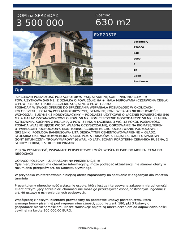 DOM na SPRZEDAŻ 3 500 000 Gościno 630 m2 EXR20578 Secondary 250000 540 2000 3 12 Good Residence Opis SPRZEDAM POSIADŁOŚĆ POD AGROTURYSTYKĘ, STADNINĘ KONI - NAD MORZEM !!! POW. UŻYTKOWA 540 M2, Z DZIAŁKĄ O POW. 25,42 HA + HALA MUROWANA (CZERWONA CEGŁA) O POW. 540 M2 + POMIESZCZENIE SOCJALNE O POW. 120 M2 POSIADAM W SWOJEJ OFERCIE DO SPRZEDANIA WSPANIAŁĄ POSIADŁOŚĆ W OKOLICACH KOŁOBRZEGU, IDEALNĄ POD AGROTURYSTYKĘ, STADNINĘ KONI. W SKŁAD NIERUCHOMOŚCI WCHODZĄ : BUDYNEK 3 KONDYGNACYJNY + PODDASZE UŻYTKOWE O ŁĄCZNEJ POWIERZCHNI 540 M2 + GARAŻ 2-STANOWISKOWY O POW. 50 M2, POMIESZCZENIE GOSPODARCZE 50 M2, PRALNIA, KOTŁOWNIA, KUCHNIA Z JADALNIĄ O POW. 54 M2, 4 ŁAZIENKI, 3 WC, 12 POKOI. POSIADŁOŚĆ POSIADA WŁASNE UJĘCIE WODY, WŁASNĄ OCZYSZCZALNIĘ, OGRZEWANIE NA BIOMASĘ,TEREN UTWARDZONY, OGRODZONY, MONITORING, CZUJNIKI RUCHU. OGRZEWANIE PODŁOGOWE + GRZEJNIKI. PODŁOGA BAMBUSOWA- LITA DESKA.TYNKI CEMENTOWO-WAPIENNE + GŁADZ. STOLARKA OKIENNA KOMMERLING-5 KOM. PCV, 5 TARASÓW, 5 FACJATEK. DACH 4-SPADOWY, GONT BITUMICZNY- TRÓJWYMIAROWY (GWAR. 40 LAT). ŚCIANY POROTERM- CERAMIKA RUBENA, 2 STROPY TERIVA, 1 STROP DREWNIANY. PIĘKNA POSIADŁOŚĆ, WSPANIAŁE PERSPEKTYWY I MOŻLIWOŚCI- BLISKO DO MORZA. CENA DO NEGOCJACJI GORĄCO POLECAM I ZAPRASZAM NA PREZENTACJĘ !!! Opis nieruchomości ma charakter informacyjny, może podlegać aktualizacji, nie stanowi oferty w rozumieniu przepisów art. 66 Kodeksu Cywilnego. W przypadku zainteresowania niniejszą ofertą zapraszamy na spotkanie w dogodnym dla Państwa terminie Prezentujemy nieruchomość wyłącznie osobie, która jest zainteresowana zakupem nieruchomości. Klient otrzymujący adres nieruchomości nie może go przekazywać osobą postronnym. Zgodnie z art. 49 ustawy o ochronie danych osobowych. Współpracę z naszymi Klientami prowadzimy na podstawie umowy pośrednictwa, która wymaga formy pisemnej pod rygorem nieważności, zgodnie z art. 180, pkt 3 Ustawy o gospodarce nieruchomościami. Nasze transakcje objęte są ubezpieczeniem od odpowiedzialności cywilnej na kwotę 200 000,00 EURO. EXTRA DOM Rojszczak BIURO NIERUCHOMOŚCI EXTRA DOM ROJSZCZAK 72-200 Nowogard ul. Boh. Warszawy 1 (przy placówce Alior Banku) www.extradom.net.pl tel./fax 91 392 22 33 Co robimy dla klienta zainteresowanego zakupem: * Sprawdzamy zdolność kredytową * Wyszukujemy odpowiednią nieruchomość, * Pomagamy w prowadzeniu negocjacji, * Pomagamy w uzyskaniu potrzebnych dokumentów * Pomagamy w uzyskaniu kredytu hipotecznego * Współpracujemy z kancelariami notarialnymi, geodetami Korzystając z naszych usług oszczędzasz swój czas, a także zyskujesz pewność, że Twoja transakcja zostanie przeprowadzona z należytą starannością, w sposób profesjonalny i co najważniejsze - BEZPIECZNY. Nr licencji pośredników: 21317, 21318 Dorota Więzowska tel. 517 770 353 tel. (91) 392 22 33 email: [email protected] EXTRA DOM Rojszczak Powered by TCPDF (www.tcpdf.org)