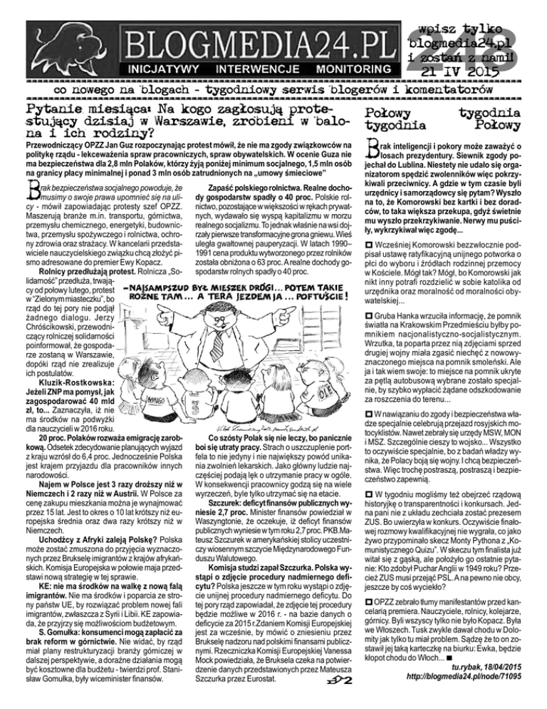 wpisz tylko blogmedia24.pl i zostañ z nami! 21 IV 2015 ========================================================================================== 248 co nowego na blogach - tygodniowy serwis blogerów i komentatorów ========================================================================================== Pytanie miesi¹ca: Na kogo zag³osuj¹ protetygodnia Po³owy stuj¹cy dzisiaj w Warszawie, zrobieni w balo- tygodnia Po³owy na i ich rodziny? Przewodniczący OPZZ Jan Guz rozpoczynając protest mówił, że nie ma zgody związkowców na politykę rządu - lekceważenia spraw pracowniczych, spraw obywatelskich. W ocenie Guza nie ma bezpieczeństwa dla 2,8 mln Polaków, którzy żyją poniżej minimum socjalnego, 1,5 mln osób na granicy płacy minimalnej i ponad 3 mln osób zatrudnionych na „umowy śmieciowe” B rak bezpieczeństwa socjalnego powoduje, że musimy o swoje prawa upomnieć się na ulicy - mówił zapowiadając protesty szef OPZZ. Maszerują branże m.in. transportu, górnictwa, przemysłu chemicznego, energetyki, budownictwa, przemysłu spożywczego i rolnictwa, ochrony zdrowia oraz strażacy. W kancelarii przedstawiciele nauczycielskiego związku chcą złożyć pismo adresowane do premier Ewy Kopacz. Rolnicy przedłużają protest. Rolnicza „Solidarność” przedłuża, trwający od połowy lutego, protest w “Zielonym miasteczku”, bo rząd do tej pory nie podjął żadnego dialogu. Jerzy Chróścikowski, przewodniczący rolniczej solidarności poinformował, że gospodarze zostaną w Warszawie, dopóki rząd nie zrealizuje ich postulatów. Kluzik-Rostkowska: Jeżeli ZNP ma pomysł, jak zagospodarować 40 mld zł, to... Zaznaczyła, iż nie ma środków na podwyżki dla nauczycieli w 2016 roku. 20 proc. Polaków rozważa emigrację zarobkową. Odsetek zdecydowanie planujących wyjazd z kraju wzrósł do 6,4 proc. Jednocześnie Polska jest krajem przyjazdu dla pracowników innych narodowości. Najem w Polsce jest 3 razy droższy niż w Niemczech i 2 razy niż w Austrii. W Polsce za cenę zakupu mieszkania można je wynajmować przez 15 lat. Jest to okres o 10 lat krótszy niż europejska średnia oraz dwa razy krótszy niż w Niemczech. Uchodźcy z Afryki zaleją Polskę? Polska może zostać zmuszona do przyjęcia wyznaczonych przez Brukselę imigrantów z krajów afrykańskich. Komisja Europejska w połowie maja przedstawi nową strategię w tej sprawie. KE: nie ma środków na walkę z nową falą imigrantów. Nie ma środków i poparcia ze strony państw UE, by rozwiązać problem nowej fali imigrantów, zwłaszcza z Syrii i Libii. KE zapowiada, że przyjrzy się możliwościom budżetowym. S. Gomułka: konsumenci mogą zapłacić za brak reform w górnictwie. Nie widać, by rząd miał plany restrukturyzacji branży górniczej w dalszej perspektywie, a doraźne działania mogą być kosztowne dla budżetu - twierdzi prof. Stanisław Gomułka, były wiceminister finansów. Zapaść polskiego rolnictwa. Realne dochody gospodarstw spadły o 40 proc. Polskie rolnictwo, pozostające w większości w rękach prywatnych, wydawało się wyspą kapitalizmu w morzu realnego socjalizmu. To jednak właśnie na wsi dojrzały pierwsze transformacyjne grona gniewu. Wieś uległa gwałtownej pauperyzacji. W latach 1990– 1991 cena produktu wytworzonego przez rolników została obniżona o 63 proc. A realne dochody gospodarstw rolnych spadły o 40 proc. B rak inteligencji i pokory może zaważyć o losach prezydentury. Siewnik zgody pojechał do Lublina. Niestety nie udało się organizatorom spędzić zwolenników więc pokrzykiwali przeciwnicy. A gdzie w tym czasie byli urzędnicy i samorządowcy się pytam? Wyszło na to, że Komorowski bez kartki i bez doradców, to taka większa przekupa, gdyż świetnie mu wyszło przekrzykiwanie. Nerwy mu puściły, wykrzykiwał więc zgodę... Wcześniej Komorowski bezzwłocznie podpisał ustawę ratyfikacyjną unijnego potworka o płci do wyboru i źródłach rodzinnej przemocy w Kościele. Mógł tak? Mógł, bo Komorowski jak nikt inny potrafi rozdzielić w sobie katolika od urzędnika oraz moralność od moralności obywatelskiej... Gruba Hanka wrzuciła informację, że pomnik światła na Krakowskim Przedmieściu byłby pomnikiem nacjonalistyczno-socjalistycznym. Wrzutka, ta poparta przez nią zdjęciami sprzed drugiej wojny miała zgasić niechęć z nowowyznaczonego miejsca na pomnik smoleński. Ale ja i tak wiem swoje: to miejsce na pomnik ukryte za pętlą autobusową wybrane zostało specjalnie, by szybko wypłacić żądane odszkodowanie za roszczenia do terenu... Co szósty Polak się nie leczy, bo panicznie boi się utraty pracy. Strach o uszczuplenie portfela to nie jedyny i nie największy powód unikania zwolnień lekarskich. Jako główny ludzie najczęściej podają lęk o utrzymanie pracy w ogóle. W konsekwencji pracownicy godzą się na wiele wyrzeczeń, byle tylko utrzymać się na etacie. Szczurek: deficyt finansów publicznych wyniesie 2,7 proc. Minister finansów powiedział w Waszyngtonie, że oczekuje, iż deficyt finansów publicznych wyniesie w tym roku 2,7 proc. PKB.Mateusz Szczurek w amerykańskiej stolicy uczestniczy wiosennym szczycie Międzynarodowego Funduszu Walutowego. Komisja studzi zapał Szczurka. Polska wystąpi o zdjęcie procedury nadmiernego deficytu? Polska jeszcze w tym roku wystąpi o zdjęcie unijnej procedury nadmiernego deficytu. Do tej pory rząd zapowiadał, że zdjęcie tej procedury będzie możliwe w 2016 r. - na bazie danych o deficycie za 2015 r.Zdaniem Komisji Europejskiej jest za wcześnie, by mówić o zniesieniu przez Brukselę nadzoru nad polskimi finansami publicznymi. Rzeczniczka Komisji Europejskiej Vanessa Mock powiedziała, że Bruksela czeka na potwierdzenie danych przedstawionych przez Mateusza Szczurka przez Eurostat. 2 W nawiązaniu do zgody i bezpieczeństwa władze specjalnie celebrują przejazd rosyjskich motocyklistów. Nawet zebrały się urzędy MSW, MON