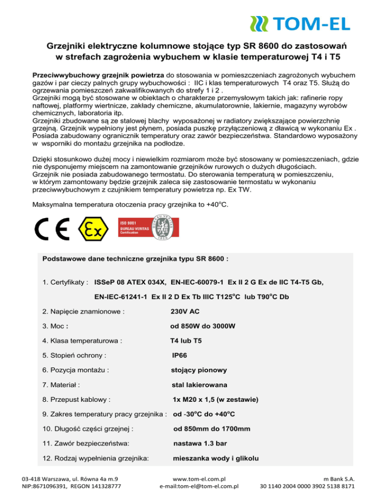 Grzejniki elektryczne kolumnowe stojące typ SR 8600 do zastosowań w strefach zagrożenia wybuchem w klasie temperaturowej T4 i T5 Przeciwwybuchowy grzejnik powietrza do stosowania w pomieszczeniach zagrożonych wybuchem gazów i par cieczy palnych grupy wybuchowości : IIC i klas temperaturowych T4 oraz T5. Służą do ogrzewania pomieszczeń zakwalifikowanych do strefy 1 i 2 . Grzejniki mogą być stosowane w obiektach o charakterze przemysłowym takich jak: rafinerie ropy naftowej, platformy wiertnicze, zakłady chemiczne, akumulatorownie, lakiernie, magazyny wyrobów chemicznych, laboratoria itp. Grzejniki zbudowane są ze stalowej blachy wyposażonej w radiatory zwiększające powierzchnię grzejną. Grzejnik wypełniony jest płynem, posiada puszkę przyłączeniową z dławicą w wykonaniu Ex . Posiada zabudowany ogranicznik temperatury oraz zawór bezpieczeństwa. Standardowo wyposażony w wsporniki do montażu grzejnika na podłodze. Dzięki stosunkowo dużej mocy i niewielkim rozmiarom może być stosowany w pomieszczeniach, gdzie nie dysponujemy miejscem na zamontowanie grzejników rurowych o dużych długościach. Grzejnik nie posiada zabudowanego termostatu. Do sterowania temperaturą w pomieszczeniu, w którym zamontowany będzie grzejnik zaleca się zastosowanie termostatu w wykonaniu przeciwwybuchowym z czujnikiem temperatury powietrza np. Ex TW. Maksymalna temperatura otoczenia pracy grzejnika to +40oC. Podstawowe dane techniczne grzejnika typu SR 8600 : 1. Certyfikaty : ISSeP 08 ATEX 034X, EN-IEC-60079-1 Ex II 2 G Ex de IIC T4-T5 Gb, EN-IEC-61241-1 Ex II 2 D Ex Tb IIIC T125oC lub T90oC Db 2. Napięcie znamionowe : 230V AC 3. Moc : od 850W do 3000W 4. Klasa temperaturowa : T4 lub T5 5. Stopień ochrony : IP66 6. Pozycja montażu : stojący pionowy 7. Materiał : stal lakierowana 8. Przepust kablowy : 1x M20 x 1,5 (w zestawie) 9. Zakres temperatury pracy grzejnika : od -30oC do +40oC 10. Długość części grzejnej : od 850mm do 1700mm 11. Zawór bezpieczeństwa: nastawa 1.3 bar 12. Rodzaj wypełnienia grzejnika: mieszanka wody i glikolu 03-418 Warszawa, ul. Równa 4a m.9 NIP:8671096391, REGON 141328777 www.tom-el.com.pl e-mail:[email protected] m Bank S.A. 30 1140 2004 0000 3902 5138 8171 Grzejniki w wykonaniu przeciwwybuchowym ze stali lakierowanej z ogranicznikiem temperatury oraz zaworem bezpieczeństwa klasa temperaturowa T4 i T5 Grzejniki lakierowane SR 8600 Klasa temperaturowa T4 o ISSeP 08 ATEX 034X Ex II 2 GD Ex d IIC T4 Gb, Ex Tb IIIC T125 C Db Typ Moc w [W] klasa temp. T4 SR 8600/1500 T4 1500 W Długość części grzejnej [mm] 850 SR 8600/2000 T4 2000 W SR 8600/2500 T4 2500 W SR 8600/3000 T4 3000 W Długość całkowita [mm] Wysokość [mm] Napięcie [V] Waga [kg] Kod artykułu 1100 660 230 62,0 TE 230111500 1150 1400 660 230 80,0 TE 230212000 1450 1700 660 230 96,0 TE 230312500 1700 1950 660 230 113,0 TE 230413000 Grzejniki lakierowane SR 8600 Klasa temperaturowa T5 o ISSeP 08 ATEX 034X Ex II 2 GD Ex d IIC T5 Gb, Ex Tb IIIC T90 C Db SR 8600/850 T5 850 W Długość części grzejnej [mm] 850 SR 8600/1150 T5 1150 W 1150 1400 660 230 80,0 TE 230221150 SR 8600/1450 T5 1450 W 1450 1700 660 230 96,0 TE 230321450 SR 8600/1700 T5 1700 W 1700 1950 660 230 113,0 TE 230421700 Typ Moc w [W] klasa temp. T5 03-418 Warszawa, ul. Równa 4a m.9 NIP:8671096391, REGON 141328777 Długość całkowita [mm] Wysokość [mm] Napięcie [V] Waga [kg] Kod artykułu 1100 660 230 62,0 TE 230120850 www.tom-el.com.pl e-mail:[email protected] m Bank S.A. 30 1140 2004 0000 3902 5138 8171 Wymiary grzejników oraz informacje dodatkowe Długość całkowita Długość części grzejnej Uwagi dodatkowe : Dławica kablowa mosiężna M20 x 1,5 w wykonaniu Ex oraz wsporniki podłogowe i ścienne w zestawie. Obudowa grzejnika malowana w standardzie malowana jest w kolorze szarym wg. RAL7032, specjalne rodzaje farb i kolorów dostępne są na zamówienie. Maksymalna dopuszczalna temperatura otoczenia pracy grzejnika to +40oC ! 03-418 Warszawa, ul. Równa 4a m.9 NIP:8671096391, REGON 141328777 www.tom-el.com.pl e-mail:[email protected] m Bank S.A. 30 1140 2004 0000 3902 5138 8171