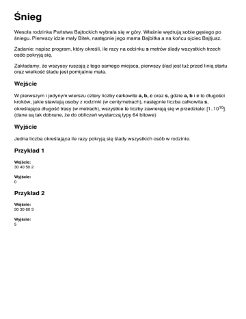 Śnieg Wesoła rodzinka Państwa Bajtockich wybrała się w góry. Właśnie wędrują sobie gęsiego po śniegu. Pierwszy idzie mały Bitek, następnie jego mama Bajbitka a na końcu ojciec Bajtjusz. Zadanie: napisz program, który określi, ile razy na odcinku s metrów ślady wszystkich trzech osób pokryją się. Zakładamy, że wszyscy ruszają z tego samego miejsca, pierwszy ślad jest tuż przed linią startu oraz wielkość śladu jest pomijalnie mała. Wejście W pierwszym i jedynym wierszu cztery liczby całkowite a, b, c oraz s, gdzie a, b i c to długości kroków, jakie stawiają osoby z rodzinki (w centymetrach), następnie liczba całkowita s, określająca długość trasy (w metrach), wszystkie te liczby zawierają się w przedziale: [1..1010]. (dane są tak dobrane, że do obliczeń wystarczą typy 64 bitowe) Wyjście Jedna liczba określająca ile razy pokryją się ślady wszystkich osób w rodzinie. Przykład 1 Wejście: 30 40 50 2 Wyjście: 0 Przykład 2 Wejście: 30 30 60 3 Wyjście: 5