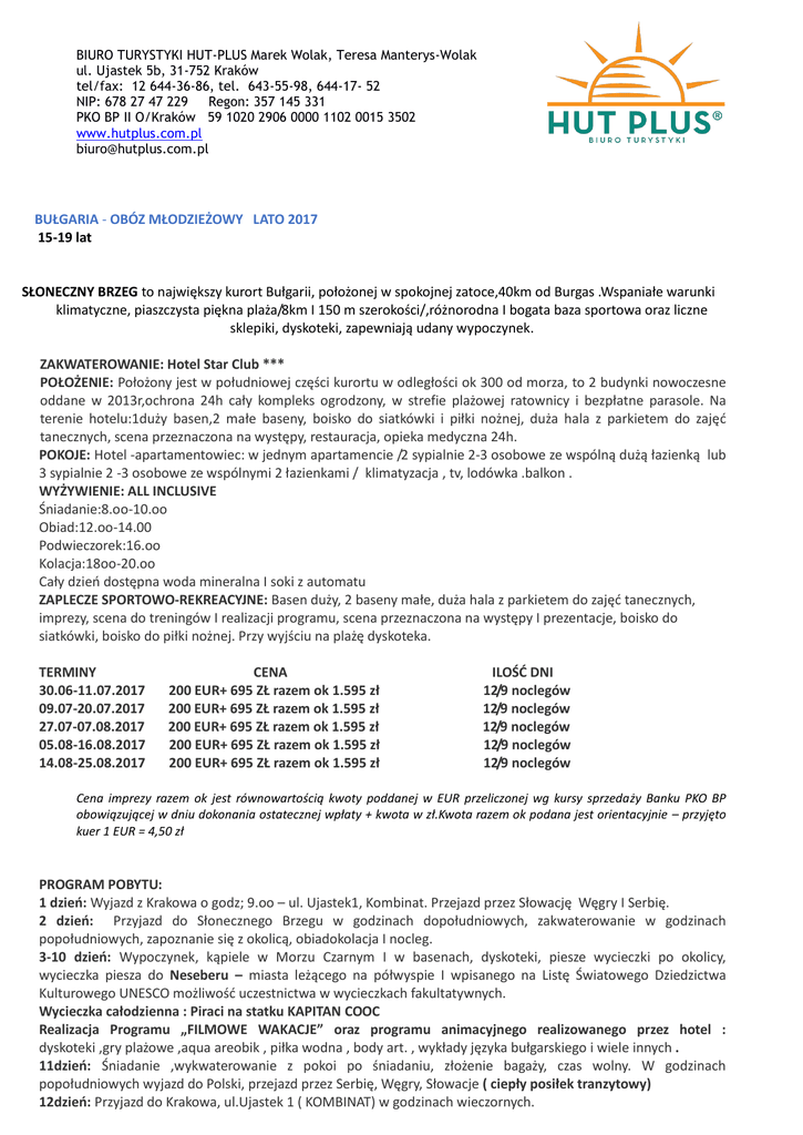 BIURO TURYSTYKI HUT-PLUS Marek Wolak, Teresa Manterys-Wolak ul. Ujastek 5b, 31-752 Kraków tel/fax: 12 644-36-86, tel. 643-55-98, 644-17- 52 NIP: 678 27 47 229 Regon: 357 145 331 PKO BP II O/Kraków 59 1020 2906 0000 1102 0015 3502 www.hutplus.com.pl [email protected] BUŁGARIA - OBÓZ MŁODZIEŻOWY LATO 2017 15-19 lat SŁONECZNY BRZEG to największy kurort Bułgarii, położonej w spokojnej zatoce,40km od Burgas .Wspaniałe warunki klimatyczne, piaszczysta piękna plaża/8km I 150 m szerokości/,różnorodna I bogata baza sportowa oraz liczne sklepiki, dyskoteki, zapewniają udany wypoczynek. ZAKWATEROWANIE: Hotel Star Club *** POŁOŻENIE: Położony jest w południowej części kurortu w odległości ok 300 od morza, to 2 budynki nowoczesne oddane w 2013r,ochrona 24h cały kompleks ogrodzony, w strefie plażowej ratownicy i bezpłatne parasole. Na terenie hotelu:1duży basen,2 małe baseny, boisko do siatkówki i piłki nożnej, duża hala z parkietem do zajęć tanecznych, scena przeznaczona na występy, restauracja, opieka medyczna 24h. POKOJE: Hotel -apartamentowiec: w jednym apartamencie /2 sypialnie 2-3 osobowe ze wspólną dużą łazienką lub 3 sypialnie 2 -3 osobowe ze wspólnymi 2 łazienkami / klimatyzacja , tv, lodówka .balkon . WYŻYWIENIE: ALL INCLUSIVE Śniadanie:8.oo-10.oo Obiad:12.oo-14.00 Podwieczorek:16.oo Kolacja:18oo-20.oo Cały dzień dostępna woda mineralna I soki z automatu ZAPLECZE SPORTOWO-REKREACYJNE: Basen duży, 2 baseny małe, duża hala z parkietem do zajęć tanecznych, imprezy, scena do treningów I realizacji programu, scena przeznaczona na występy I prezentacje, boisko do siatkówki, boisko do piłki nożnej. Przy wyjściu na plażę dyskoteka. TERMINY 30.06-11.07.2017 09.07-20.07.2017 27.07-07.08.2017 05.08-16.08.2017 14.08-25.08.2017 CENA 200 EUR+ 695 ZŁ razem ok 1.595 zł 200 EUR+ 695 ZŁ razem ok 1.595 zł 200 EUR+ 695 ZŁ razem ok 1.595 zł 200 EUR+ 695 ZŁ razem ok 1.595 zł 200 EUR+ 695 ZŁ razem ok 1.595 zł ILOŚĆ DNI 12/9 noclegów 12/9 noclegów 12/9 noclegów 12/9 noclegów 12/9 noclegów Cena imprezy razem ok jest równowartością kwoty poddanej w EUR przeliczonej wg kursy sprzedaży Banku PKO BP obowiązującej w dniu dokonania ostatecznej wpłaty + kwota w zł.Kwota razem ok podana jest orientacyjnie – przyjęto kuer 1 EUR = 4,50 zł PROGRAM POBYTU: 1 dzień: Wyjazd z Krakowa o godz; 9.oo – ul. Ujastek1, Kombinat. Przejazd przez Słowację Węgry I Serbię. 2 dzień: Przyjazd do Słonecznego Brzegu w godzinach dopołudniowych, zakwaterowanie w godzinach popołudniowych, zapoznanie się z okolicą, obiadokolacja I nocleg. 3-10 dzień: Wypoczynek, kąpiele w Morzu Czarnym I w basenach, dyskoteki, piesze wycieczki po okolicy, wycieczka piesza do Neseberu – miasta leżącego na półwyspie I wpisanego na Listę Światowego Dziedzictwa Kulturowego UNESCO możliwość uczestnictwa w wycieczkach fakultatywnych. Wycieczka całodzienna : Piraci na statku KAPITAN COOC Realizacja Programu „FILMOWE WAKACJE” oraz programu animacyjnego realizowanego przez hotel : dyskoteki ,gry plażowe ,aqua areobik , piłka wodna , body art. , wykłady języka bułgarskiego i wiele innych . 11dzień: Śniadanie ,wykwaterowanie z pokoi po śniadaniu, złożenie bagaży, czas wolny. W godzinach popołudniowych wyjazd do Polski, przejazd przez Serbię, Węgry, Słowacje ( ciepły posiłek tranzytowy) 12dzień: Przyjazd do Krakowa, ul.Ujastek 1 ( KOMBINAT) w godzinach wieczornych. BIURO TURYSTYKI HUT-PLUS Marek Wolak, Teresa Manterys-Wolak ul. Ujastek 5b, 31-752 Kraków tel/fax: 12 644-36-86, tel. 643-55-98, 644-17- 52 NIP: 678 27 47 229 Regon: 357 145 331 PKO BP II O/Kraków 59 1020 2906 0000 1102 0015 3502 www.hutplus.com.pl [email protected] Cena zawiera: transport komfortowym autokarem, 9 noclegów wyżywienie All inclusive+ napoje: suchy prowiant na drogę powrotną. Ciepły posiłek tranzytowy w drodze powrotnej ,Opiekę kadry pedagogicznej ,pilota w podróży ,rezydenta; realizacje programu: ubezpieczenie KL + NNW + bagaż SIGNALIDUNAPOLSKA: podatek VAT. Cena nie zawiera: ubezpieczenie od chorób przewlekłych, ubezpieczenia od kosztów rezygnacji z imprezy, dopłaty do połączeń antenowych, świadczeń nie zawartych w ofercie. UWAGA: wymagany co najmniej 1 m-c od daty powrotu paszport lub dowód osobisty. Program wycieczki / Piraci na statku KAPITAN COOC / : 08.00-09.00 Przejazd z hotelu do Pomoria gdzie czeka statek i piraci . 0900-10.00 rejs do Sozopolu nazywanego w czasach ,starożytnych HELOPIOLIS 10.00-11.30 spacer po mieście z polskim przewodnikiem 11.30-14.30 rejs na wyspę Św. Iwana . Spacer , plażowanie , kąpiel , łowienie i przygotowanie małż , gry , animacje , obiad na statku : sznycel z warzywami , ziemniaki gotowane, chleb , arbuz , napoje bezalkoholowe bez ograniczeń . 14.30 -16.00 rejs powrotny do Pomoria , odjazd autokaru do hotelu 16.30-17.00 przejazd do Słonecznego Brzegu . WYCIECZKI FAKULTATYWNE : organizowane są z polskim przewodnikiem przez bułgarskie biuro MIKE z Pomorie; całodzienne wycieczki uczestnicy otrzymują suchy prowiant, napój. Wycieczki fakultatywne w cenie jak wyżej odbywają się przy frekwencji co najmniej 20 osób. WYCIECZKI MOŻNA ZAKUPIĆ W BIURZE TURYSTYKIHUT PLUS LUB NA MIEJSCU U REZYDENTA NESEBER - 15 EUR - historia, spacer, zwiedzanie cerkwi: św. Jana Chrzciciela, św. Paraskewy, św. Sofii; SOZOPOL - 28 EUR - zamek Ravadinowo ; BAŁCZIK - 34 EUR - przyladek KALIAKRIA ; WARNA - 28 EUR - zwiedzanie parku - muzeum Warneńczyka, BUŁGARSKI WIECZÓR - 22 EUR SŁONECZNY BRZEG , 29 EUR NESEBER , PARK WODNY - 16 EUR ISTAMBUŁ 49 EUR + wiza 15 EUR (w cenie śniadanie i obiad) - zwiedzanie Błękitnego meczetu, Hipodromu, Azjatyckiej części Istambułu, Bazaru krytego "Kapały Czarsi", Sułtański Pałac (wstęp 15 EUR). Na BIURO TURYSTYKI HUT-PLUS Marek Wolak, Teresa Manterys-Wolak ul. Ujastek 5b, 31-752 Kraków tel/fax: 12 644-36-86, tel. 643-55-98, 644-17- 52 NIP: 678 27 47 229 Regon: 357 1