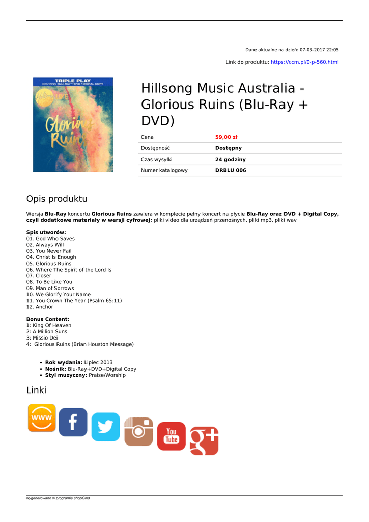 Dane aktualne na dzień: 07-03-2017 22:05 Link do produktu: https://ccm.pl/0-p-560.html Hillsong Music Australia Glorious Ruins (Blu-Ray + DVD) Cena 59,00 zł Dostępność Dostępny Czas wysyłki 24 godziny Numer katalogowy DRBLU 006 Opis produktu Wersja Blu-Ray koncertu Glorious Ruins zawiera w komplecie pełny koncert na płycie Blu-Ray oraz DVD + Digital Copy, czyli dodatkowe materiały w wersji cyfrowej: pliki video dla urządzeń przenośnych, pliki mp3, pliki wav Spis utworów: 01. God Who Saves 02. Always Will 03. You Never Fail 04. Christ Is Enough 05. Glorious Ruins 06. Where The Spirit of the Lord Is 07. Closer 08. To Be Like You 09. Man of Sorrows 10. We Glorify Your Name 11. You Crown The Year (Psalm 65:11) 12. Anchor Bonus Content: 1: King Of Heaven 2: A Million Suns 3: Missio Dei 4: Glorious Ruins (Brian Houston Message) Rok wydania: Lipiec 2013 Nośnik: Blu-Ray+DVD+Digital Copy Styl muzyczny: Praise/Worship Linki wygenerowano w programie shopGold 0 0 0 0 0 0 wygenerowano w programie shopGold Powered by TCPDF (www.tcpdf.org)