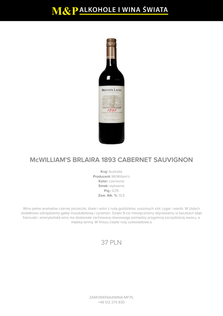 McWILLIAM'S BRLAIRA 1893 CABERNET SAUVIGNON Kraj: Australia Producent: McWilliam's Kolor: czerwone Smak: wytrawne Poj.: 0,75 Zaw. Alk. %: 13,5 Wino pełne aromatów czarnej porzeczki, śliwki i wiśni z nutą goździków, suszonych ziół, cygar i wanilii. W Ustach dodatkowo odnajdziemy gałkę muszkatołową i cynamon. Dzięki 9-cio miesięcznemu dojrzewaniu w beczkach (dąb francuski i amerykański) wino ma doskonale zachowaną równowagę pomiędzy przyjemną soczystością owocu, a miękką taniną. W finiszu ciepłe nuty czekoladowe.a 37 PLN [email protected] +48 512 270 830