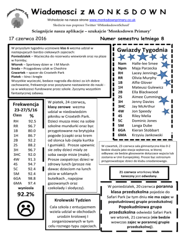 Wiadomosci z M O N K S D O W N Wchodzcie na nasza strone www.monksdownprimary.co.uk Sledzcie nas poprzez Twitter ‘@MonksdownSchool’ Sciagnijcie nasza aplikacje – szukajcie ‘Monksdown Primary’ 17 czerwca 2016 Numer semestru letniego 8 W przyszlym tygodniu uczniowie klas 6 wezma udzial w nastepujacych bardzo ciekawych zajeciach: Poniedzialek – Wycieczka do rezerwatu wiewiorek oraz na plaze w Formby; Wtorek – Sportowy dzien w I M Marsh Sroda – Przygodowy szlak w Cheshire Czwartek – spacer do Croxteth Park Piatek – kino i kregle Wszystkie wycieczki, bedace nagroda dla dzieci za ich dobre zachowanie, frekwencje oraz pozytywne nastawienie do nauki sa w wiekszosci fundowane przez szkole. Zyczymy wszystkim fantastycznej zabawy. Frekwencja 23-27/5/16 Class % RH 92.5 RR 96.7 1B 80.0 1H 86.7 2B 92.2 2S 88.2 3H 96.7 3HC 92.0 4W 91.3 4S 94.7 5C 92.4 5M 92.4 6GA 98.8 6MA 97.4 wyniosla W piatek, 24 czerwca, klasy zerowe wezma udzial w niedzwiedzim % Park.% pikniku w Croxteth Dzieci musza miec na sobie szkolne mundurki oraz byc przygotowane na brytyjska pogode (czapki oraz krem od slonca lub ciepla kurtka I gumiaki). Prosze upewnic sie zeby dzieci mialy ze soba swoje 90.0 misie (male). Prosze zaopatrzyc dzieci w zdrowy lunch (prosze nie dawac dzieciom na lunch picia w szklanych butelkach , napojow gazowanych oraz czekolady i slodyczy). 92.2% Krolewski Tydzien Cala szkola z entuzjazmem wziela udzial w obchodach urodzin krolowej I zorganizowanych w tym celu roznego typu zajeciach. Gwiazdy Tygodnia Nam Npm RH RR 1B 1H 2B 2S 3H 3HC 4W 4S 5C 5M 6GA 6MA Halle-lee Smee Maja Parzecka Lacey Jennings Olivia Murphy Alfie Glover Mateusz Gulewicz Ella Blackwood Aimee Cummings Jenny Davies Jay McArthur Jon Speedy Riley Melia Dominic Jones Langa Dube Kieran Stobbart Krzysiu Jankowski W czwartek, 23 czerwca sala gimnastyczna klas 0-2 bedzie sluzyla jako stacja wyborcza, w ktorej odbywac sie bedzie glosowanie dotyczace wyjscia lub zostania w Unii Europejskiej. Prosze byc ostroznym przyprowadzajac dzieci do klubu sniadaniowego. 21 czerwca wtorkowy klub taneczny jest odwolany. W poniedzialek, 20 czerwca poranna klasa przedszkolna pojedzie do Safari Park (w tym dniu nie ma zajec w popoludniowej grupie przedszkolnej Popokudniowa grupa przedszkolna odwiedzi Safari Park we wtorek, 21 czerwca (nie bedzie wowczas zajec w porannej grupie przedszkolnej).
