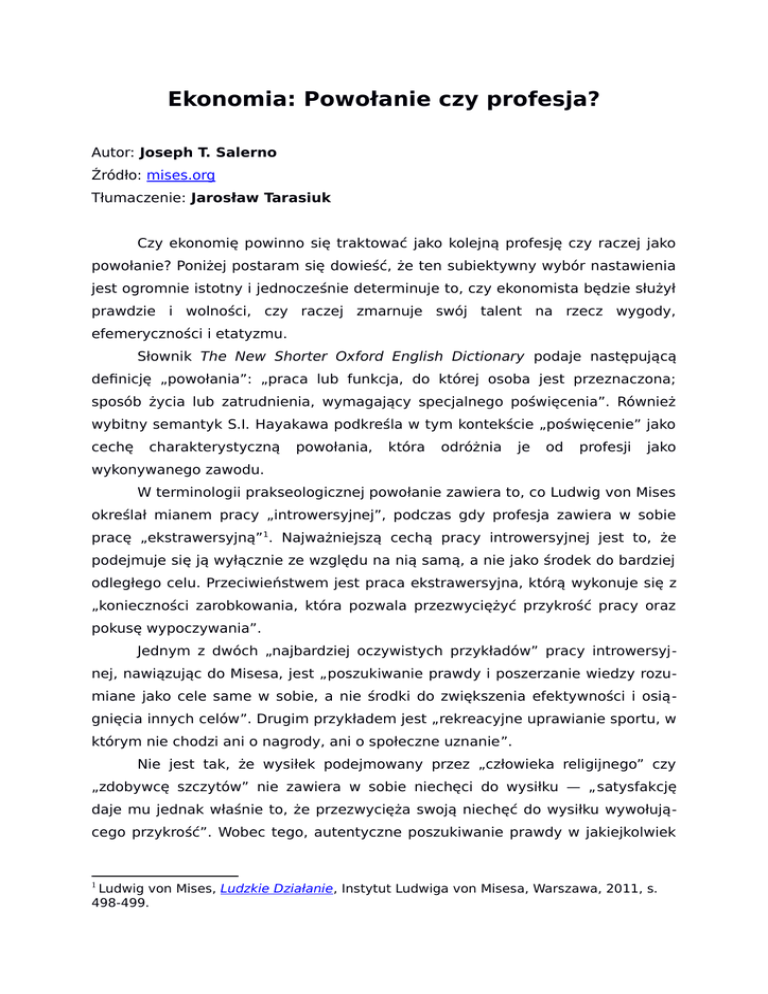 Ekonomia: Powołanie czy profesja? Autor: Joseph T. Salerno Źródło: mises.org Tłumaczenie: Jarosław Tarasiuk Czy ekonomię powinno się traktować jako kolejną profesję czy raczej jako powołanie? Poniżej postaram się dowieść, że ten subiektywny wybór nastawienia jest ogromnie istotny i jednocześnie determinuje to, czy ekonomista będzie służył prawdzie i wolności, czy raczej zmarnuje swój talent na rzecz wygody, efemeryczności i etatyzmu. Słownik The New Shorter Oxford English Dictionary podaje następującą definicję „powołania”: „praca lub funkcja, do której osoba jest przeznaczona; sposób życia lub zatrudnienia, wymagający specjalnego poświęcenia”. Również wybitny semantyk S.I. Hayakawa podkreśla w tym kontekście „poświęcenie” jako cechę charakterystyczną powołania, która odróżnia je od profesji jako wykonywanego zawodu. W terminologii prakseologicznej powołanie zawiera to, co Ludwig von Mises określał mianem pracy „introwersyjnej”, podczas gdy profesja zawiera w sobie pracę „ekstrawersyjną”1. Najważniejszą cechą pracy introwersyjnej jest to, że podejmuje się ją wyłącznie ze względu na nią samą, a nie jako środek do bardziej odległego celu. Przeciwieństwem jest praca ekstrawersyjna, którą wykonuje się z „konieczności zarobkowania, która pozwala przezwyciężyć przykrość pracy oraz pokusę wypoczywania”. Jednym z dwóch „najbardziej oczywistych przykładów” pracy introwersyjnej, nawiązując do Misesa, jest „poszukiwanie prawdy i poszerzanie wiedzy rozumiane jako cele same w sobie, a nie środki do zwiększenia efektywności i osiągnięcia innych celów”. Drugim przykładem jest „rekreacyjne uprawianie sportu, w którym nie chodzi ani o nagrody, ani o społeczne uznanie”. Nie jest tak, że wysiłek podejmowany przez „człowieka religijnego” czy „zdobywcę szczytów” nie zawiera w sobie niechęci do wysiłku — „satysfakcję daje mu jednak właśnie to, że przezwycięża swoją niechęć do wysiłku wywołującego przykrość”. Wobec tego, autentyczne poszukiwanie prawdy w jakiejkolwiek 1 Ludwig von Mises, Ludzkie Działanie, Instytut Ludwiga von Misesa, Warszawa, 2011, s. 498-499. dyscyplinie naukowej jest kwalifikowane pod kątem ekonomicznym jako „konsumpcja” i jednocześnie jako powołanie. Realizacja prawie każdego powołania, jak mówi Mises, związana jest „nie tylko z wysiłkiem zaangażowanych w nią osób, lecz wymaga także materialnych czynników produkcji oraz nakładu pracy ekstrawersyjnej innych ludzi [...] i trzeba ją kupić za płacę”. Innymi słowy, poszukiwania nowej prawdy w ekonomii, jak i w każdej dziedzinie nauki, poza pracą introwersyjną, wymagają zorganizowanej struktury dóbr komplementarnych, które zostały stworzone celowo i racjonalnie przez jednego lub wielu właścicieli prywatnych. Założyciele szkoły austriackiej zgłębiali ekonomię nie dla zysków pieniężnych, uznania wśród innych uczonych czy wpływu na politykę. Według Misesa: „Gdy Menger, Böhm-Bawerk i Wieser rozpoczynali swoje kariery naukowe […] postrzegali je jako powołanie, aby oprzeć teorię ekonomii na solidnych fundamentach. W tym sensie byli oni oddani temu celowi”2. (podkreślenie moje — J.T Salerno). Dlatego też ci trzej wybitni austriacy byli ekonomistami bardziej z powołania, aniżeli z wybranej profesji. Ekonomiści z powołania zajmują pozycje na uniwersytetach lub wybierają ścieżkę kariery w sektorach takich jak bankowość, dziennikarstwo, przemysł bądź w strukturach instytucji państwowych, by uzyskać środki niezbędne dla osiągania konkretnych rezultatów w ich pracy badawczej polegającej na odkrywaniu nowych prawd czy też objaśnianiu i aplikowania prawd już odkrytych. Profesjonalni ekonomiści natomiast w głównej mierze koncentrują się na zarabianiu pieniędzy, wzbudzaniu uznania wśród kolegów po fachu, zdobyciu sławy i posiadaniu wpływu na politykę — a najchętniej łączą te wszystkie cele. Przyglądając się tym różnicom pomiędzy ekonomistami z powołania i profesjonalistom dochodzimy do wniosku, że prawdziwa różnica pomiędzy nimi nie opiera się na obiektywnej metodzie zarabiania na życie, lecz na subiektywnych końcowych celach ich aktywności, które są nieobserwowalne. Niemniej jednak, pomimo tego elementu subiektywizmu, wspomniane dwa typy ekonomistów można z łatwością odróżnić poprzez analizę ich spojrzenia na prowadzone przez nich badania ekonomiczne, a zwłaszcza na ich stosunek do prawdy i spodziewanej nagrody. 2 Ludwig von Mises, Historical Setting of the Austrian School of Economics, Ludwig von Mises Institute, Auburn, Alabama, 1984, s. 6. Ekonomiści z powołania, jak Murray Rothbard, nie obawiają się używać niemodnych terminów jak „prawda” czy „prawo” w odniesieniu do nauki o ekonomii. Dla Rothbarda ekonomia jest wyodrębionym ciałem składającym się z niezmiennych i uniwersalnych praw przyczynowych, które są wyprowadzane w sposób logiczny z faktu, że ludzie stosują wszelkie możliwe środki do osiągania ich najbardziej pożądanych celów. W tym sensie, Rothbard utrzymuje, że „wszystkie te prawa (ekonomii) są absolutnie prawdziwe” i w ten sposób „ekonomia formułuje prawa egzystencjalne”. Ponadto w latach 50. i 60. XX wieku Rothbard pracował nad ekonomią austriacką w osamotnieniu i faktycznej izolacji. Nie uzyskał akademickiego etatu aż do 1966 roku, utrzymując się w tym niepewnym dla niego czasie z grantów akademickich. W tym czasie zmagał się również ze wznoszeniem gmachu austriackiej teorii ekonomii. Rothbard ujawnił w jednym z wywiadów udzielonych w 1990 roku, że był w miarę zadowolony z tego okresu swojego życia: „Każda możliwość napisania książki czy poznania nowych ludzi była ekscytująca”. Jest to postawa godna wzorcowego ekonomisty z powołania. Problem profesjonalizmu Paul Samuelson jest wz