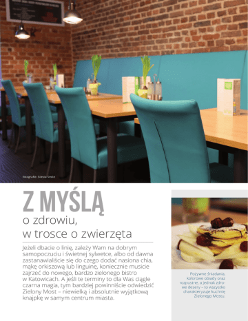 fotografie: Silesia Smile Z myślą o zdrowiu, w trosce o zwierzęta Jeżeli dbacie o linię, zależy Wam na dobrym samopoczuciu i świetnej sylwetce, albo od dawna zastanawialiście się do czego dodać nasiona chia, mąkę orkiszową lub linguinę, koniecznie musicie zajrzeć do nowego, bardzo zielonego bistro w Katowicach. A jeśli te terminy to dla Was ciągle czarna magia, tym bardziej powinniście odwiedzić Zielony Most – niewielką i absolutnie wyjątkową knajpkę w samym centrum miasta. Pożywne śniadania, kolorowe obiady oraz rozpustne, a jednak zdrowe desery – to wszystko charakteryzuje kuchnię Zielonego Mostu. 43 Zielony most Z miłości do zwierząt Weganizm to nie tylko sposób odżywiania, ale także styl życia. Jednym z powodów założenia bistra była ogromna miłość do zwierząt właścicielki lokalu oraz wolontariat w schronisku dla psów. Miłośnicy zwierząt mogą tu spokojnie usiąść ze swoim czworonożnym przyjacielem, na którego przy drzwiach czeka karma i miska z wodą. – Nasze bistro powstało z pasji do roślinnej kuchni i przekonania, że możliwe jest życie i jedzenie zarówno bez zbędnego okrucieństwa wobec zwierząt i bez kulinarnych wyrzeczeń i ascezy – mówi Aleksandra Żerkowska, właścicielka lokalu – Chcemy stworzyć miejsce, w którym nie tylko dobrze zjecie, ale też spędzicie miło czas. Kontakt z gośćmi, uśmiech i rozmowa mają dla nas ogromne znaczenie. Miłość do zwierząt, to przecież także miłość do ludzi, o czym nie zapominamy – podkreśla. Wegańskie nie znaczy nudne! Zielony Most to najlepsze miejsce, by przekonać się o tym, że kuchnia wegańska to nie tylko sałatki. Dostaniemy tu pieczeń warzywną, gryczane kaszotto albo pieczone pierożki. Codziennie do lokalu dostarczane są świeże produkty, z których układane, a następnie zapisywane na tablicy zostaje wyjątkowe menu. Dania przygotowywane są na miejscu i zawierają wyłącznie naturalne i sezonowe produkty. Nie znajdziecie tu tłuszczów trans czy białego cukru, a w razie wątpliwości możecie podpytać kelnera, który chętnie podpowie co oczyści, a co odmłodzi nasz organizm. Dzięki otwartej kuchni możemy oglądać mistrzów przy pracy, a także poznać nieco tajniki zdrowego gotowania. Kameralna atmosfera bistro sprawia, że każdy poczuje się tu jak u siebie - to miejsce gdzie aż chce się jeść, ogrom kolorów i unoszący się w powietrzu aromat przypraw sprawiają, że apetyt rośnie z każdą minutą. Bistro Zielony Most znajdziecie w Katowicach, pod adresem Słowackiego 12. Codzienne menu publikowane jest na profilu restauracji na Facebooku facebook.com/BistroZielonyMost, a o samym miejscu przeczytacie na stronie internetowej – www. zielonymost.katowice.pl
