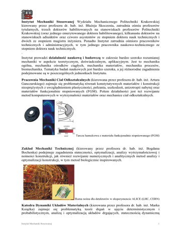 Instytut Mechaniki Stosowanej Wydziału Mechanicznego Politechniki Krakowskiej kierowany przez profesora dr. hab. inż. Błażeja Skoczenia, zatrudnia ośmiu profesorów tytularnych, trzech doktorów habilitowanych na stanowiskach profesorów Politechniki Krakowskiej (oraz jednego emerytowanego doktora habilitowanego), kilkunastu doktorów na stanowiskach adiunktów oraz czworo asystentów ze stopniem doktora nauk technicznych i dwóch ze stopniem magistra inżyniera. Ponadto Instytut zatrudnia ośmioro pracowników technicznych i administracyjnych, w tym jednego pracownika naukowo-technicznego ze stopniem doktora nauk technicznych. . Instytut prowadzi działalność naukową i badawczą w zakresie bardzo szeroko rozumianej mechaniki w aspekcie teoretycznym, doświadczalnym, aplikacyjnym. Jest to mechanika ogólna, mechanika ośrodków ciągłych, mechanika materiałów, mechanika procesów, biomechanika. Tematyka badań naukowych jest bardzo szeroka, a jej różnorodne zagadnienia podejmowane są w poszczególnych jednostkach Instytutu. Pracownia Mechaniki Ciał Odkształcalnych (kierowana przez profesora dr. hab. inż. Artura Ganczarskiego) zajmuje się problematyką równań konstytutywnych materiałów i konstrukcji niesprężystych z uwzględnieniem plastyczności, pełzania, uszkodzeń, anizotropii nabytej oraz materiałów funkcjonalnie stopniowanych (FGM). Polem działalności jest też rozwijanie metod komputerowych w wytrzymałości materiałów oraz mechanice ciał odkształcalnych. Tarcza hamulcowa z materiału funkcjonalnie stopniowanego (FGM) Zakład Mechaniki Technicznej (kierowany przez profesora dr. hab. inż. Bogdana Bochenka) podejmuje zagadnienia stateczności, optymalizacji, analizy wytrzymałościowej i nośności konstrukcji, jak również rozwijanie numerycznych i analitycznych metod analizy i optymalizacji konstrukcji, w tym metod biologicznie inspirowanych. Rama nośna dla detektorów w eksperymencie ALICE (LHC, CERN) Katedra Dynamiki Układów Materialnych (kierowana przez profesora dr. hab. inż. Marka Książka) zajmuje się problematyką teorii drgań w ujęciu deterministycznym i probabilistycznym, analizą i optymalizacją układów drgających, statecznością dynamiczną Instytut Mechaniki Stosowanej 1 układów ciągłych oraz analizą i syntezą aktywnych układów wibroizolacji. Tematyka prac realizowanych we współpracy z innymi ośrodkami naukowymi, krajowymi i zagranicznymi obejmuje także aktywną redukcję drgań i hałasu, analizę drgań struktur kompozytowych, interakcje płyn-ciało stałe w konstrukcjach pełnomorskich, modelowanie człowieka jako układu drgającego, cyfrową akwizycję i przetwarzanie sygnałów pomiarowych, symulacje i modelowanie komputerowe układów dynamicznych. Badanie młotko-wiertarki Profil naukowy Zakładu Mechaniki Doświadczalnej i Biomechaniki (kierowanej przez dr. hab. inż. Grzegorza Milewskiego, prof. PK) obejmuje badania właściwości mechanicznych materiałów, w szczególności tworzyw polimerowych, metody doświadczalnej analizy naprężeń i odkształceń w konstrukcjach i elementach maszyn oraz zagadnienia z zakresu biomechaniki inżynierskiej i biomateriałów. W szczególności w ramach działalności naukowo-badawczej zakładu rozwijane są zagadnienia takie jak: opis zachowania się materiałów i kompozytów polimerowych z uwzględnieniem zmian temperatury, efektów reologicznych, starzenia i zmęczenia oraz modyfikacji struktury i składu tworzyw; recykling polimerów termoplastycznych; techniki tensometryczne w projektowaniu konstrukcji powłokowych, układów nośnych pras hydraulicznych oraz wielolinowych bębnów maszyn wyciągowych; numeryczno-doświadczalna analiza konstrukcji z uwagi na trwałość i wytrzymałość zmęczeniową; badania właściwości mechanicznych tkanek biologicznych oraz materiałów implantacyjnych; Aparat Ilizarowa konstrukcja urządzeń i aparatury ortopedycznej oraz stabilizatorów zewnętrznych do stabilizacji urazów kości; zagadnienia biomechaniki stomatologicznej obejmujące badania Instytut Mechaniki Stosowanej 2 wytrzymałościowe oraz analizę numeryczną MES z zakresu metod rekonstrukcji koron zębów w stomatologii zachowawczej oraz zastosowań implantów w ortodoncji i chirurgii twarzowoszczękowej. Zakład Mechaniki Ciał Stałych (kierowany przez profesora dr. hab. inż. Błażeja Skoczenia) podejmuje zagadnienia, szeroko rozumianej mechaniki materiałów w tym zagadnień równań konstytutywnych materiałów niesprężystych z uwzględnieniem plastyczności i kriogenicznych warunków pracy oraz dyskretno-ciągłego modelowania nanomateriałów z zastosowaniem nieklasycznych modeli ośrodka ciągłego. Do priorytetów badawczych Instytutu zaliczyć należy pozyskiwanie i realizację krajowych i międzynarodowych projektów badawczych, rozwój kadry naukowej przez realizację habilitacji i doktoratów na światowym poziomie oraz ścisłą współpracę z krajowymi i zagranicznymi ośrodkami i przedsiębiorstwami. O wysokim poziomie kadry świadczy duża liczba publikacji w znaczących czasopismach, znacząca liczba wydanych monografii i książek, członkostwo w polskich i międzynarodowych stowarzyszeniach naukowych oraz współpraca z ośrodkami badawczymi w kraju i na świecie. Profil badawczy i naukowy Instytutu znajduje swoje odzwierciedlenie w organizowanych cyklicznie co 3 lata, ogólnopolskich konferencjach z udziałem licznych gości zagranicznych „Tworzywa Sztuczne w Budowie Maszyn”, „Warsztaty Inżynierii Medycznej” (Zakład MDiB) czy „Wpływ Wibracji na otoczenie” (Katedra DUM, od 1977 roku), a także współorganizowana z AGH co dwa lata konferencja „Metody Aktywne Redukcji Drgań i Hałasu”. Instytut jest otwarty na współpracę z innymi jednostkami badawczymi oraz z przemysłem. Przykładami takiej współpracy są: firma INASMET z San Sebastian w Hiszpanii, WerkstoffKompentenzzentrum-Leoben Forschungsgesellschaft m.b