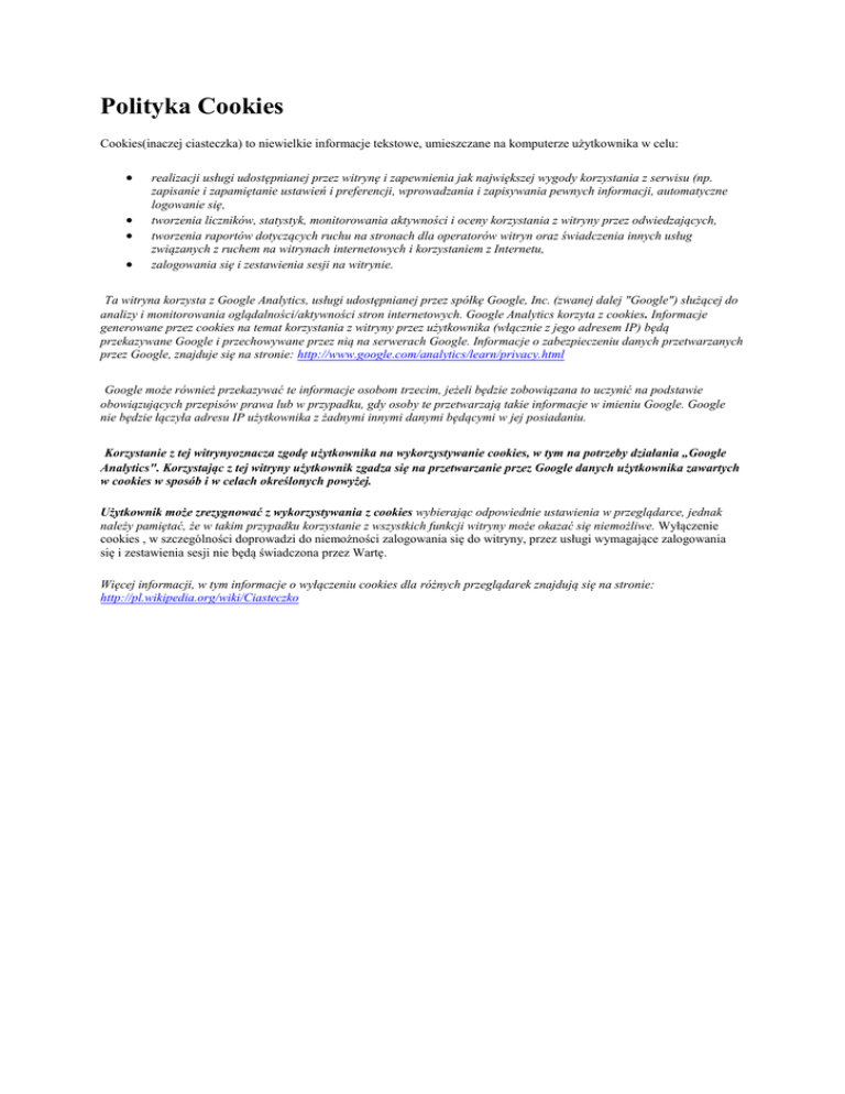 Polityka Cookies Cookies(inaczej ciasteczka) to niewielkie informacje tekstowe, umieszczane na komputerze użytkownika w celu: realizacji usługi udostępnianej przez witrynę i zapewnienia jak największej wygody korzystania z serwisu (np. zapisanie i zapamiętanie ustawień i preferencji, wprowadzania i zapisywania pewnych informacji, automatyczne logowanie się, tworzenia liczników, statystyk, monitorowania aktywności i oceny korzystania z witryny przez odwiedzających, tworzenia raportów dotyczących ruchu na stronach dla operatorów witryn oraz świadczenia innych usług związanych z ruchem na witrynach internetowych i korzystaniem z Internetu, zalogowania się i zestawienia sesji na witrynie. Ta witryna korzysta z Google Analytics, usługi udostępnianej przez spółkę Google, Inc. (zwanej dalej "Google") służącej do analizy i monitorowania oglądalności/aktywności stron internetowych. Google Analytics korzyta z cookies. Informacje generowane przez cookies na temat korzystania z witryny przez użytkownika (włącznie z jego adresem IP) będą przekazywane Google i przechowywane przez nią na serwerach Google. Informacje o zabezpieczeniu danych przetwarzanych przez Google, znajduje się na stronie: http://www.google.com/analytics/learn/privacy.html Google może również przekazywać te informacje osobom trzecim, jeżeli będzie zobowiązana to uczynić na podstawie obowiązujących przepisów prawa lub w przypadku, gdy osoby te przetwarzają takie informacje w imieniu Google. Google nie będzie łączyła adresu IP użytkownika z żadnymi innymi danymi będącymi w jej posiadaniu. Korzystanie z tej witrynyoznacza zgodę użytkownika na wykorzystywanie cookies, w tym na potrzeby działania „Google Analytics". Korzystając z tej witryny użytkownik zgadza się na przetwarzanie przez Google danych użytkownika zawartych w cookies w sposób i w celach określonych powyżej. Użytkownik może zrezygnować z wykorzystywania z cookies wybierając odpowiednie ustawienia w przeglądarce, jednak należy pamiętać, że w takim przypadku korzystanie z wszystkich funkcji witryny może okazać się niemożliwe. Wyłączenie cookies , w szczególności doprowadzi do niemożności zalogowania się do witryny, przez usługi wymagające zalogowania się i zestawienia sesji nie będą świadczona przez Wartę. Więcej informacji, w tym informacje o wyłączeniu cookies dla różnych przeglądarek znajdują się na stronie: http://pl.wikipedia.org/wiki/Ciasteczko