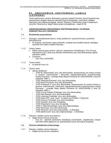 Proj. zmiany Studium uwarunkowań i kierunków zagospodarowania przestrzennego miasta Poznania – 29.05.06 r. UWARUNKOWANIA STREFA E E3 Smochowice, Krzyżowniki, Ławica (lotnisko) ¶ E3 SMOCHOWICE, KRZYŻOWNIKI, ŁAWICA (LOTNISKO) Teren ograniczony ulicami: Bukowską, granicą miasta Poznania, ulicą Przygraniczną, południowym skrajem terenów zielonych jeziora Kierskiego, zachodnim skrajem zabudowy ulicy Międzyzdrojskiej, ulicami: Słupską, Polanowską, torami kolejowymi, ulicą Św. Wawrzyńca, aleją Polską (część szczegółowa - mapa S/18). 1. UWARUNKOWANIA ŚRODOWISKA PRZYRODNICZEGO I OCHRONA DZIEDZICTWA KULTUROWEGO 1.1. Środowisko przyrodnicze 1.1.1 Geologia, ukształtowanie terenu, wody podziemne i powierzchniowe, powietrze atmosferyczne • W skrajnej, zachodniej części podstrefy, znajduje się niewielki obszar zasilający zachodni klin zieleni miasta Poznania. 1.1.2 Tereny zieleni • Zieleń towarzysząca ulicom i placom, zabytkowym fortyfikacjom: Fort VII oraz zabudowie w tym: park przy folwarku Edwardowo przy ulicy Bukowskiej (rejestr zabytków A393). • Cmentarz: o przy ulicy Lubowskiej. 1.1.3 Tereny leśne: • na terenie Fortu VII. 1.1.4 Tereny rolne: • ogrody działkowe: o „POD M. Dąbrowskiej“ przy ulicy Bukowskiej, (proponowany do zmiany funkcji w studium uwarunkowań i kierunków zagospodarowania przestrzennego miasta Poznania - uchwała Rady Miasta Poznania Nr XXII/276/III/99 z dnia 23 listopada 1999 r.), o „POD Ubezpieczeniowiec“ przy ulicy Bukowskiej, o „POD Nowa Przyroda“ przy ulicy Bukowskiej, o „POD Energetyk II“ przy ulicy Bukowskiej, (proponowany do zmiany funkcji w studium uwarunkowań i kierunków zagospodarowania przestrzennego miasta Poznania - uchwała Rady Miasta Poznania Nr XXII/276/III/99 z dnia 23 listopada 1999 r.), o „POD II Armii Wojska Polskiego” przy ulicy Bukowskiej, o „POD Nad Stawem” przy ulicy Bukowskiej, o „POD Lotnictwa Polskiego” przy ulicy Bukowskiej, o „POD Kadry WP i prac. cywil.“ w rejonie ulic Pilotów i 5 Stycznia, o „POD Komuny Paryskiej“ przy ulicy Gorajskiej, o „POD Szafirek“ przy ulicy Gorajskiej, o „POD Wiepofama“ przy ulicy Gorajskiej, o „POD K. Marcinkowskiego“ przy ulicy Dąbrowskiego, o „POD Wichrowa“ przy ulicy Wichrowej, o „POD Olszynka“ przy ulicy Sianowskiej – w likwidacji, o „POD Zjednoczeni“ przy ulicy Dąbrowskiego – w likwidacji. 1.1.5 Obszary i obiekty cenne przyrodniczo: • objęte formą ochrony przyrody: o Fort VII - element pierścienia fortyfikacji poznańskich, projektowany obszar NATURA 2000 zgłoszony do zatwierdzenia przez Komisję Europejską. 1.2. Ochrona dziedzictwa kulturowego 1.2.1 Obszary i obiekty cenne kulturowo: • Objęte formą ochrony zabytków: 175 Proj. zmiany Studium uwarunkowań i kierunków zagospodarowania przestrzennego miasta Poznania – 29.05.06 r. UWARUNKOWANIA STREFA E E3 Smochowice, Krzyżowniki, Ławica (lotnisko) Fort VII Colomb, Jeżyce, „Folwark Edwardowo – dwór, park, czworaki” (część północna) - założenie wydzielone z terenu dawnej wsi Ławica. Włączone do miasta w 1940 r. Obejmuje willę, dom ogrodnika, bramę wjazdową i park. o W obrębie podstrefy mogą istnieć pojedyncze obiekty wpisane do rejestru zabytków (aneks nr 1 rejestr zabytków nieruchomych – m. Poznań, 2003 r.). Nie objęte formą ochrony zabytków: o Krzyżowniki – wieś o czytelnym układzie przestrzennym z założeniem dworsko-folwarcznym, należąca niegdyś do joannitów poznańskich. Została włączona do Poznania w 1940 r. Obszar obejmuje układ wsi z zabudową oraz zespół folwarczny składający się z dworu z 4 ćw. XIX w., domu włodarza, budynków gospodarczych. o Zespół poprzemysłowy - Młyn przy ulicy Słupskiej – zespól powstał w latach 30 – tych XX w. W jego skład wchodził młyn, dom młynarza i zabudowa gospodarcza. o o • 176 2. ŁAD PRZESTRZENNY I WYMOGI JEGO OCHRONY 2.1. Struktura funkcjonalno - przestrzenna 2.1.1 Funkcja terenu i charakter zabudowy (część ogólna - mapa O/13) Podstrefa o jednorodności funkcji mieszkaniowej w części północnej. W części południowej strefa ograniczonego użytkowania, spowodowana bezpośrednim sąsiedztwem lotniska. • Dwie funkcje podstawowe równoważne podzieliły teren na dwa odrębne obszary: o w części północnej (Smochowice, Krzyżowniki) dominuje zabudowa mieszkaniowa o charakterze domów jednorodzinnych wolno stojących, częściowo połączonych z małą produkcją, warsztatami. o w część południowej dominuje teren lotniska oraz usług związanych z jego obsługą. • Ponadto w podstrefie występują dodatkowe elementy funkcjonalno – przestrzenne: o wzdłuż ulicy Dąbrowskiego lokalizacja terenów produkcyjnych oraz usługowych (handel detaliczny i półhurtowy w zabudowie wielkogabarytowej), o wzdłuż ulicy Dąbrowskiego oraz ulicy Bukowskiej lokalizacja zespołów ogrodów działkowych wraz z zabudową tymczasową, częściowo przeznaczonych do likwidacji, o na granicy miasta lokalizacja terenu przeznaczonego pod Tor Samochodowy Poznań oraz czasowo organizowanej giełdy samochodowej, o tereny niezagospodarowane w części północnej rozproszone wśród terenów mieszkaniowych, w części południowej skoncentrowane na obrzeżach terenu lotniska, o fragment terenów lotniska. • W podstrefie występują tereny zamknięte. 2.1.2 Wzajemne zależności między funkcjami (część ogólna - mapa O/18) • Funkcje stymulujące rozwój: lotnisko pasażerskie i usługi (wzdłuż ulicy Dąbrowskiego). • Funkcje zagrożone: mieszkalnictwo. • Funkcje agresywne: produkcyjne, handlu półhurtowego. • Funkcje wypierane: ogrody działkowe. 2.2. Podstawowe parametry zabudowy 2.2.1 Wysokość zabudowy (część ogólna - mapa O/14) • W podstrefie przeważa zabudowa o wysokości 2 kondygnacji (7 m.). • W podstrefie obowiązuje zasada wyznaczania krawędzi na skraju jednorodnych układów urbanistycznych. 2.2.2 Gęst
